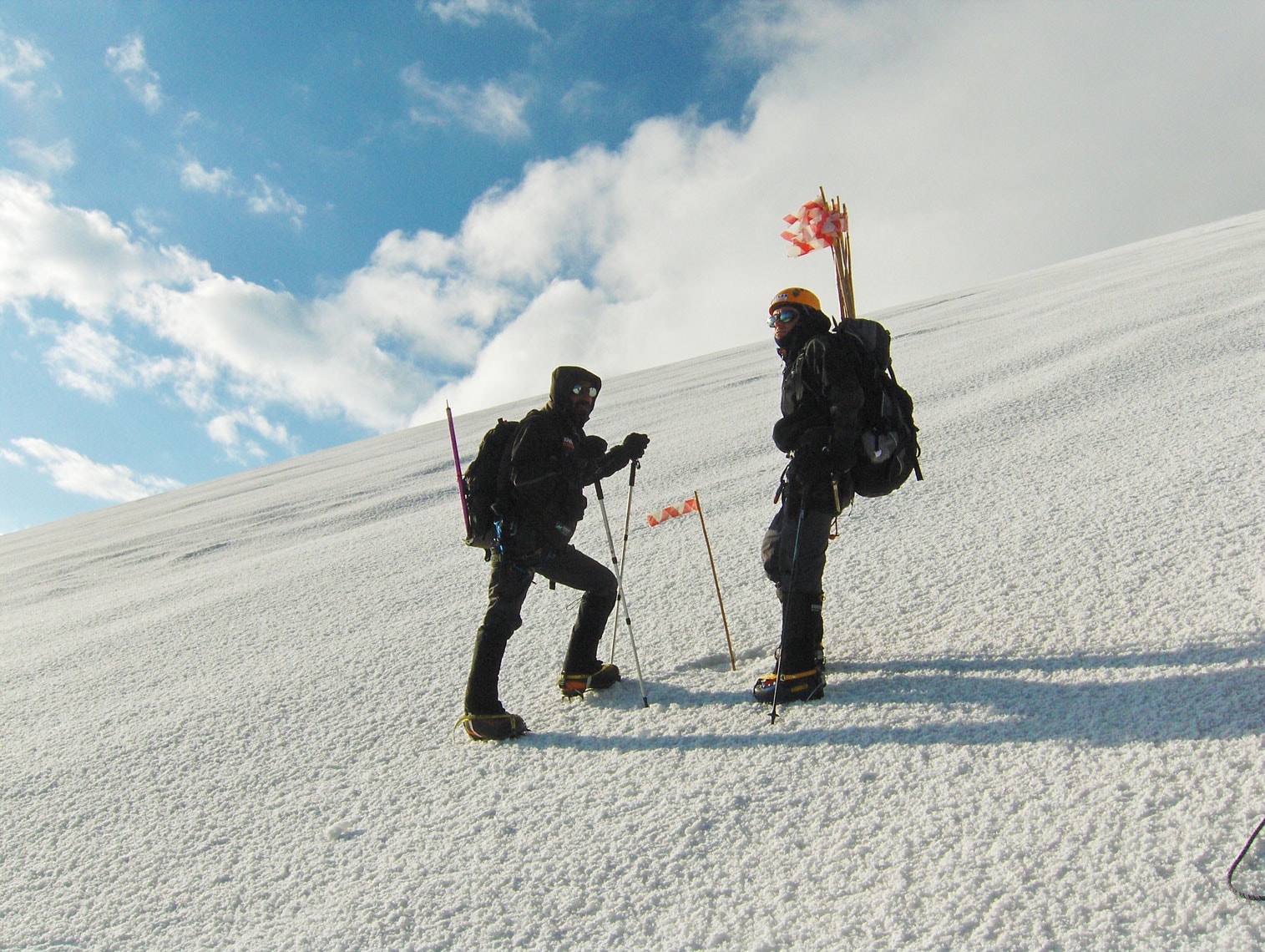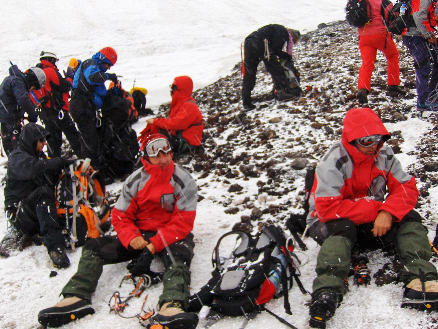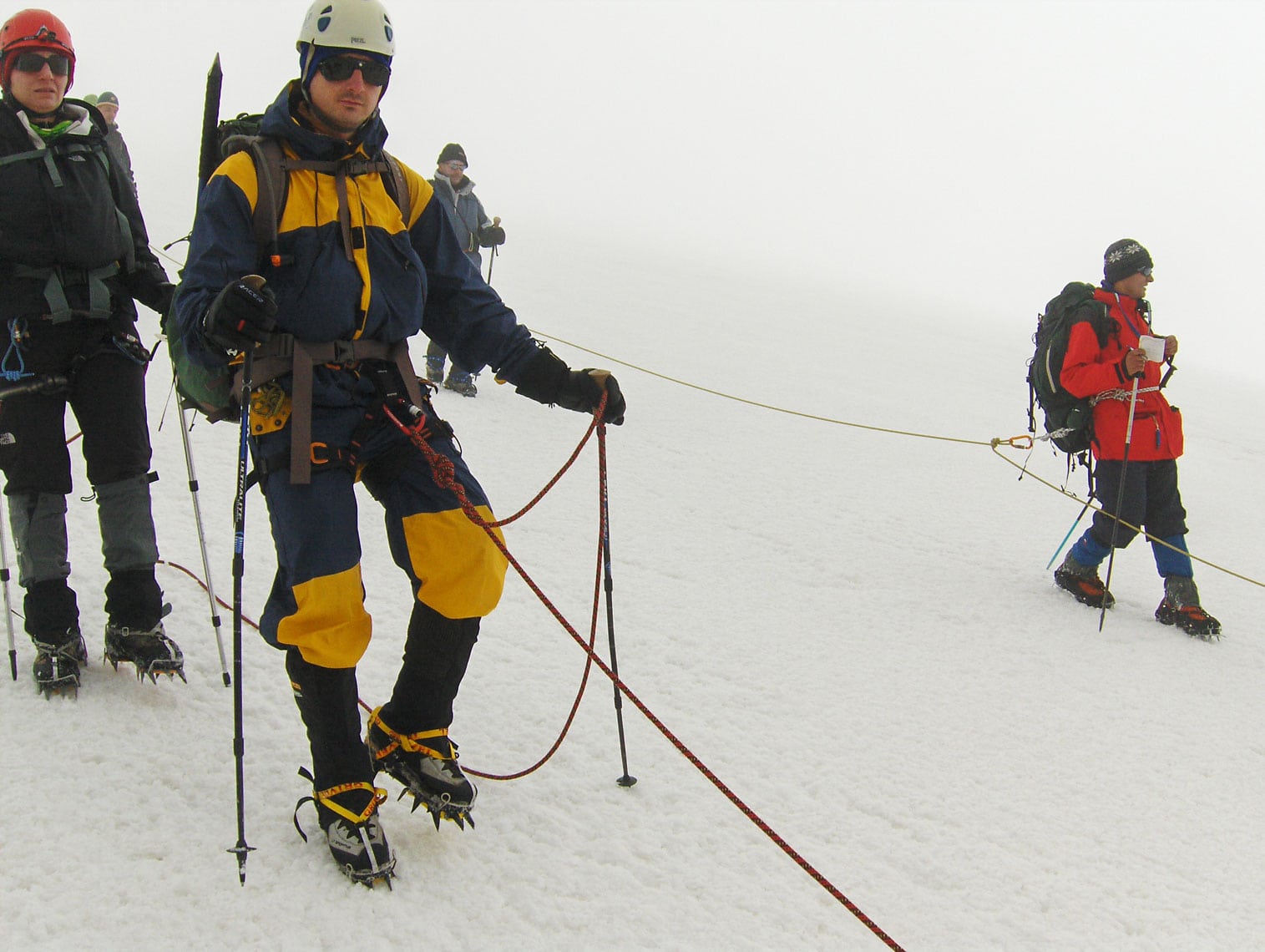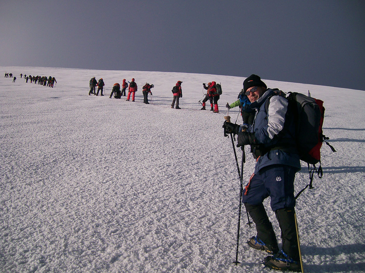 Ustajemo u 03,00 h iza ponoći. Sinoć spakovane ruksake još jednom provjeravamo jesmo li ponijeli svu opremu za penjanje. Tačno u 04,00 h krećemo, u kolonu po jedan, tišinu remeti jedino bat naših koraka. Put nam osvjetljava jaka mjesečina tako da nam čeone svjetiljke skoro i ne trebaju. Ubrzo stižemo na donju granicu glečera (4200 m/nv). Stavljamo dereze i navezujemo se na vodičko uže. U navezi sam ekipom planinara iz Makedinije, a članovi su Živko Temelkovski (Skopje), Artan Luma i Memet Memeti (Tetovo) .