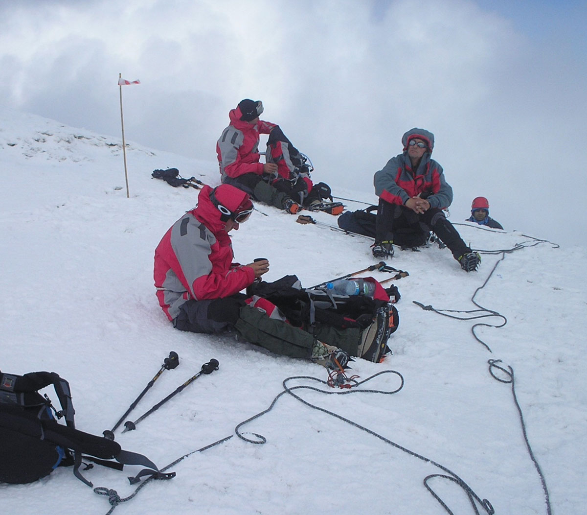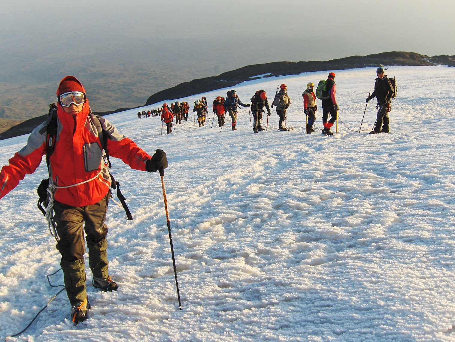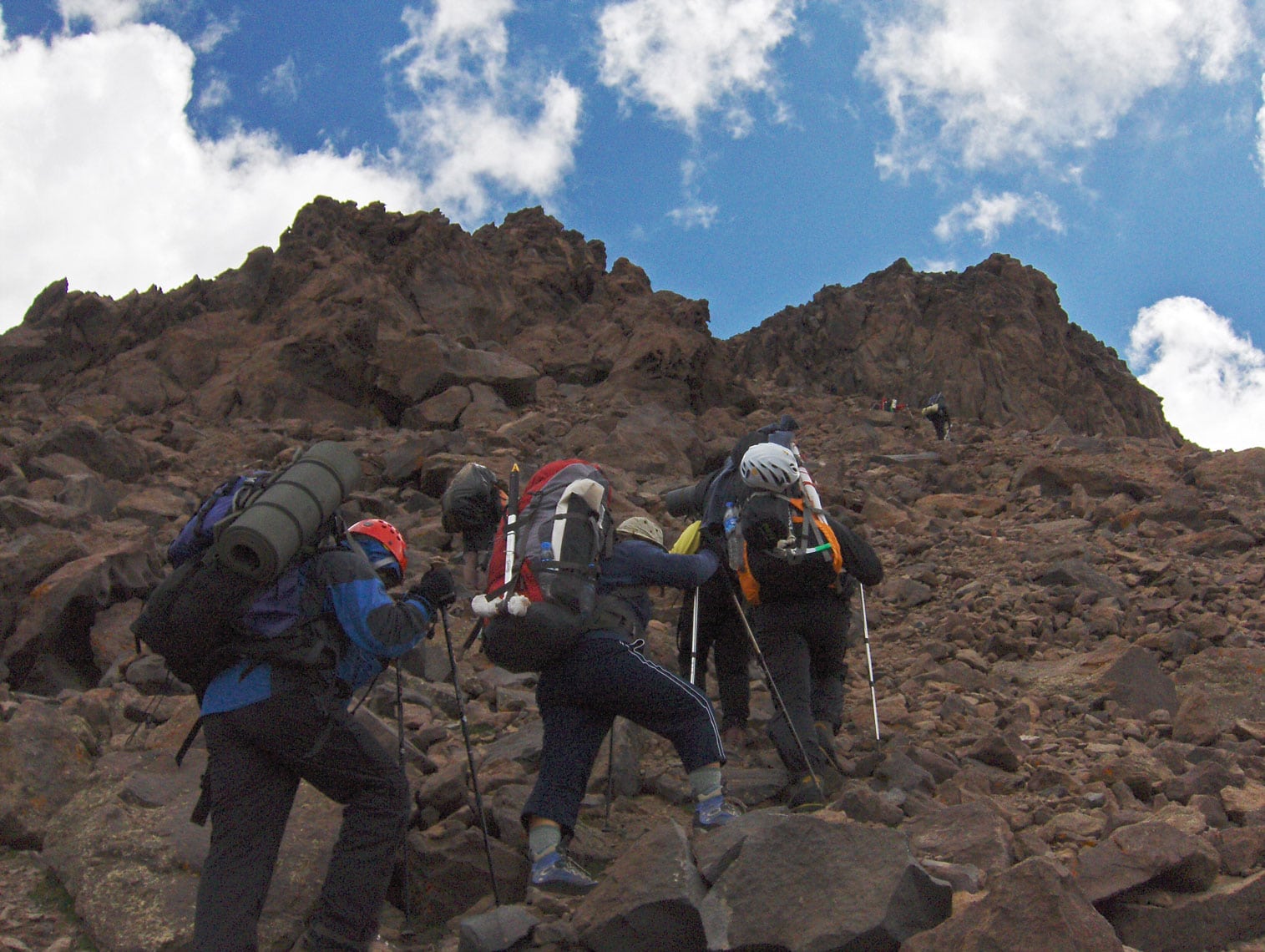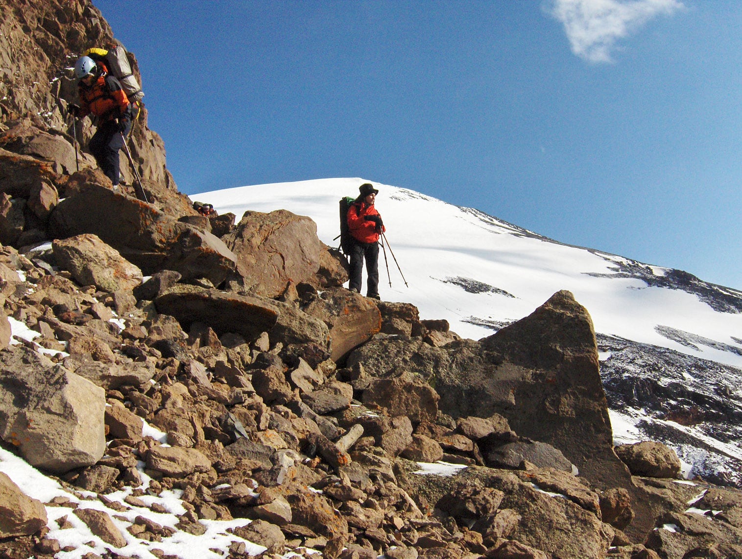 Ustajemo u 03,00 h iza ponoći. Sinoć spakovane ruksake još jednom provjeravamo jesmo li ponijeli svu opremu za penjanje. Tačno u 04,00 h krećemo, u kolonu po jedan, tišinu remeti jedino bat naših koraka. Put nam osvjetljava jaka mjesečina tako da nam čeone svjetiljke skoro i ne trebaju. Ubrzo stižemo na donju granicu glečera (4200 m/nv). Stavljamo dereze i navezujemo se na vodičko uže. U navezi sam ekipom planinara iz Makedinije, a članovi su Živko Temelkovski (Skopje), Artan Luma i Memet Memeti (Tetovo) .