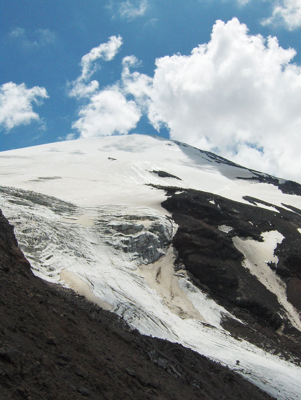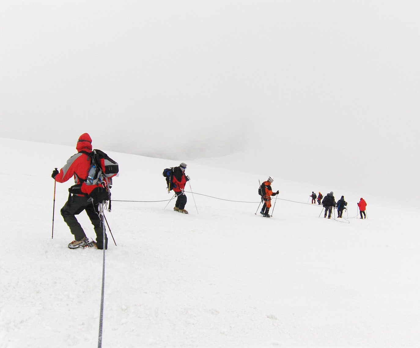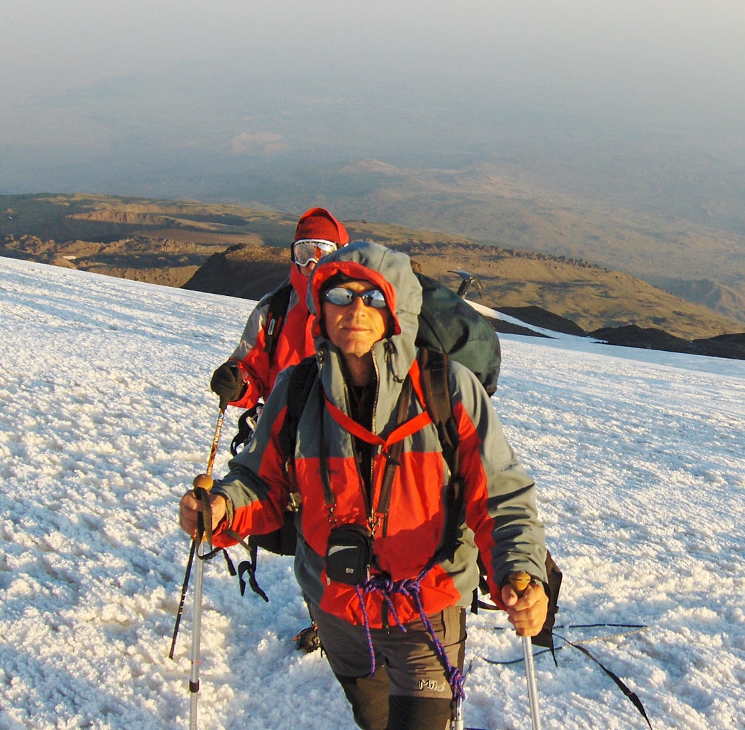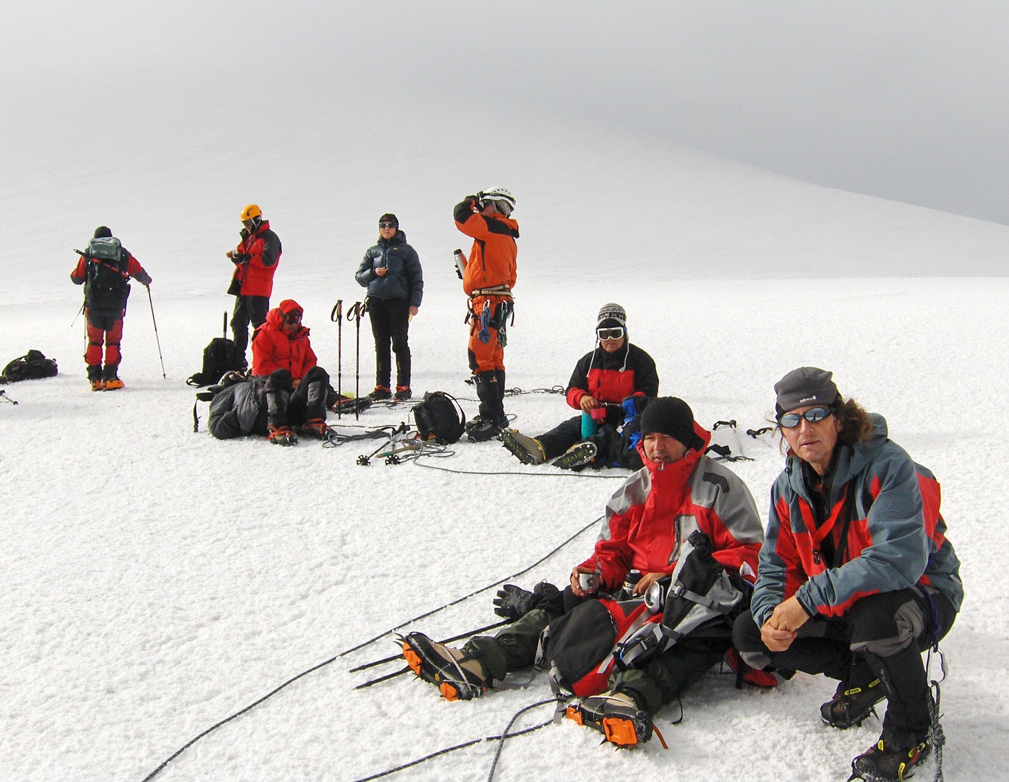 Ustajemo u 03,00 h iza ponoći. Sinoć spakovane ruksake još jednom provjeravamo jesmo li ponijeli svu opremu za penjanje. Tačno u 04,00 h krećemo, u kolonu po jedan, tišinu remeti jedino bat naših koraka. Put nam osvjetljava jaka mjesečina tako da nam čeone svjetiljke skoro i ne trebaju. Ubrzo stižemo na donju granicu glečera (4200 m/nv). Stavljamo dereze i navezujemo se na vodičko uže. U navezi sam ekipom planinara iz Makedinije, a članovi su Živko Temelkovski (Skopje), Artan Luma i Memet Memeti (Tetovo) .
