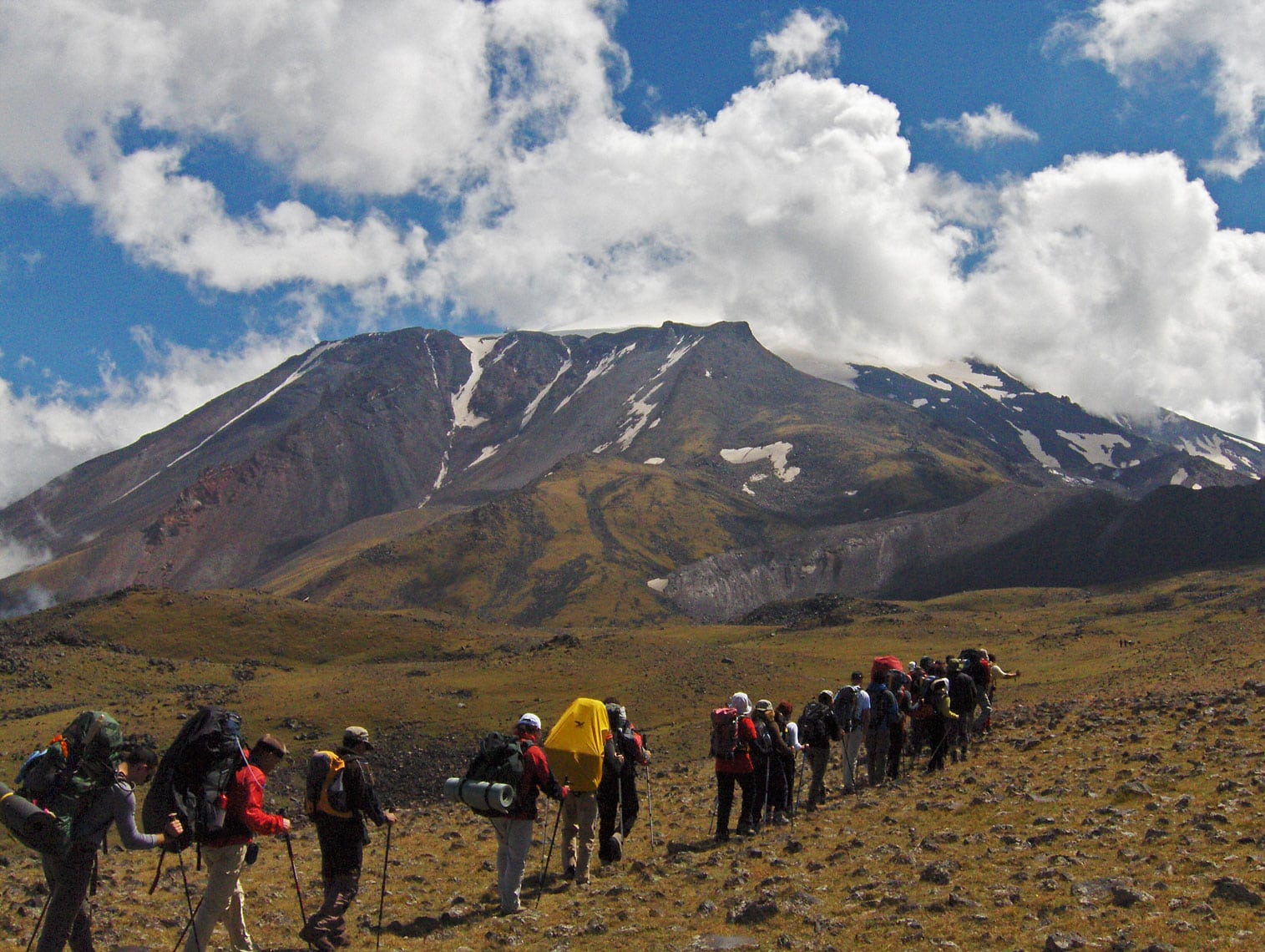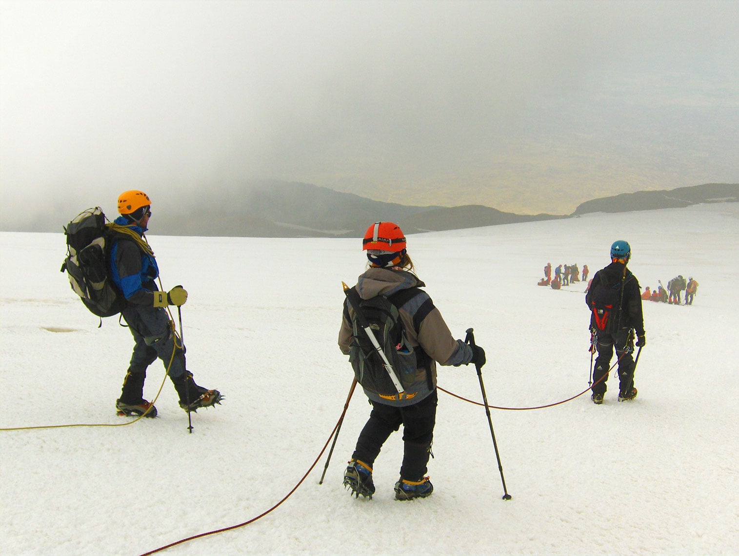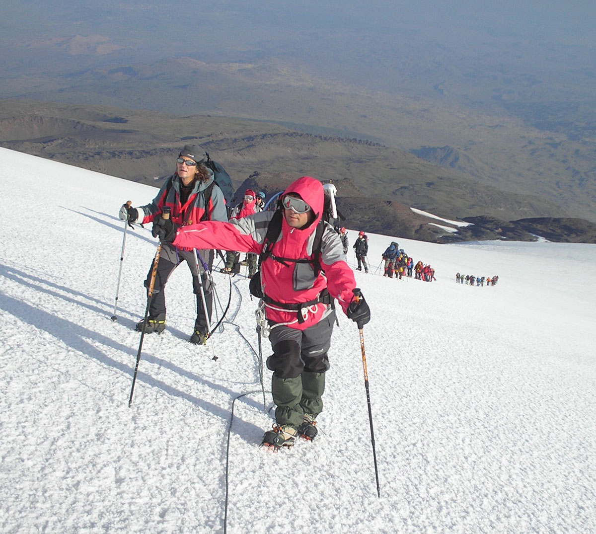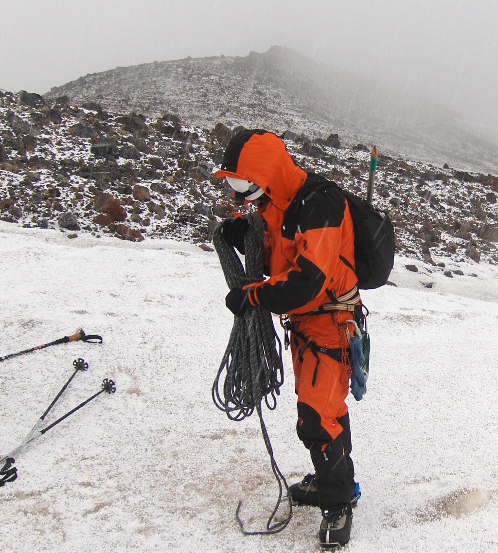 Ustajemo u 03,00 h iza ponoći. Sinoć spakovane ruksake još jednom provjeravamo jesmo li ponijeli svu opremu za penjanje. Tačno u 04,00 h krećemo, u kolonu po jedan, tišinu remeti jedino bat naših koraka. Put nam osvjetljava jaka mjesečina tako da nam čeone svjetiljke skoro i ne trebaju. Ubrzo stižemo na donju granicu glečera (4200 m/nv). Stavljamo dereze i navezujemo se na vodičko uže. U navezi sam ekipom planinara iz Makedinije, a članovi su Živko Temelkovski (Skopje), Artan Luma i Memet Memeti (Tetovo) .