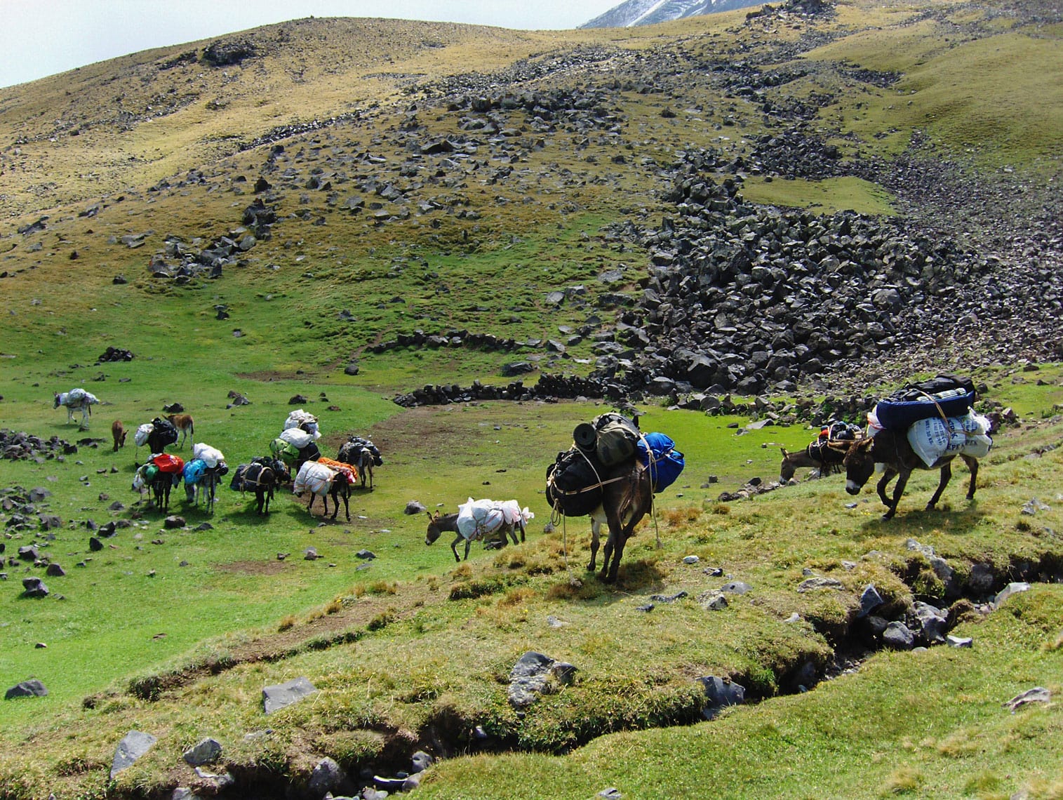 U 07,00 h ustajemo malo umorni od jučerašnjeg dana. Od danas ne moramo više zagledati nebo i razmišljati kakvo će nas vrijeme pratiti, svejedno nam je, vrh je sada u “džepu”. Nakon doručka pakujemo šatore i ostalu opremu u transportne vreće koje tovarimo na magarce. Naša sumnja da će biti problema oko isplate naknade za transport magarcima, obistinila se. Cijena koja je bila dogovorena prije četiri dana sada je udvostručena! Uslijedilo je ubjeđivanje i cijenjkanje. Na kraju je na obostrano zadovoljstvo dogovoreno da ukupna cijena po jednom prtljagu (u oba smijera) iznosi 45,00 eura. Polazimo u 09,45 h i u kamp 1 stižemo u 13,45 h. Silazak je trajao 4 sata hoda uz visinsku razliku 1450 metara.