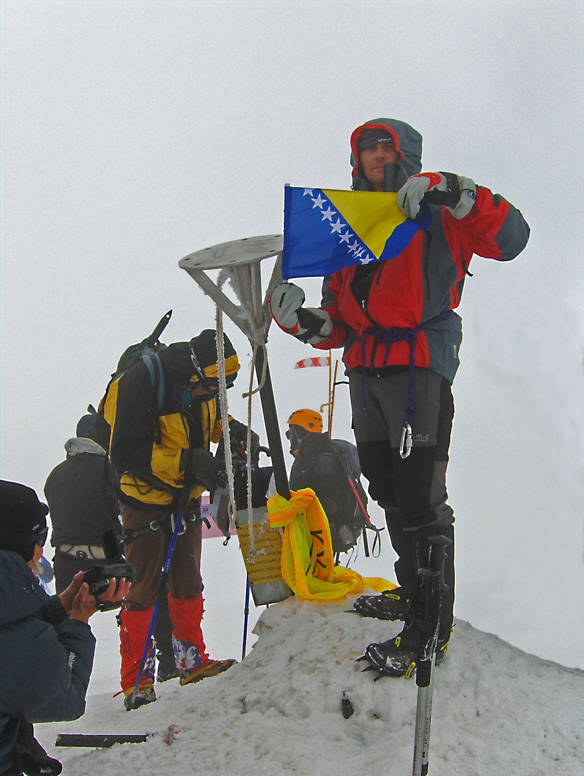 U 10,30 h nakon 6,30 sati hoda uz visinsku razliku od 1015 metara, dosežemo najviše tjeme Ararata. Kod oznake na vrhu vođa našeg naveza Živko kratko je izgovorio “To je to”. Uslijedilo je čestitanje i fotografisanje sa zastavama kraj oznake na vrhu. Svako od nas imao je razlog za radost i veselje. Živko je deseti put za redom pristupio na vrh Ararata, a Artanu, Memetu i meni prvi put da pristupimo na vrh iznad 5000 metara nadmorske visine. Ukupno na najviše tjeme Ararata pristupio je 51 planinar iz 10 država, znači svi učesnici pohoda, što bi Turci kazali – aferim (bravo)! Na vrhu smo se zadržali svega 30 minuta. U 11,00 h krenuli smo natrag u kamp 3. Odluka naših vodiča da zbog promjene vremenske situacije krenemo ranije od planiranog ispostaviće se na silasku ispravnom. Magla nas je s vrha pratila veći dio puta i samo što smo s glečera stupili na kamenito tlo i skinuli dereze s cipela počela je jaka grmljavina i snježni pljusak. Za kratko vrijeme je napadalo desetak centimetara novog snijega.
