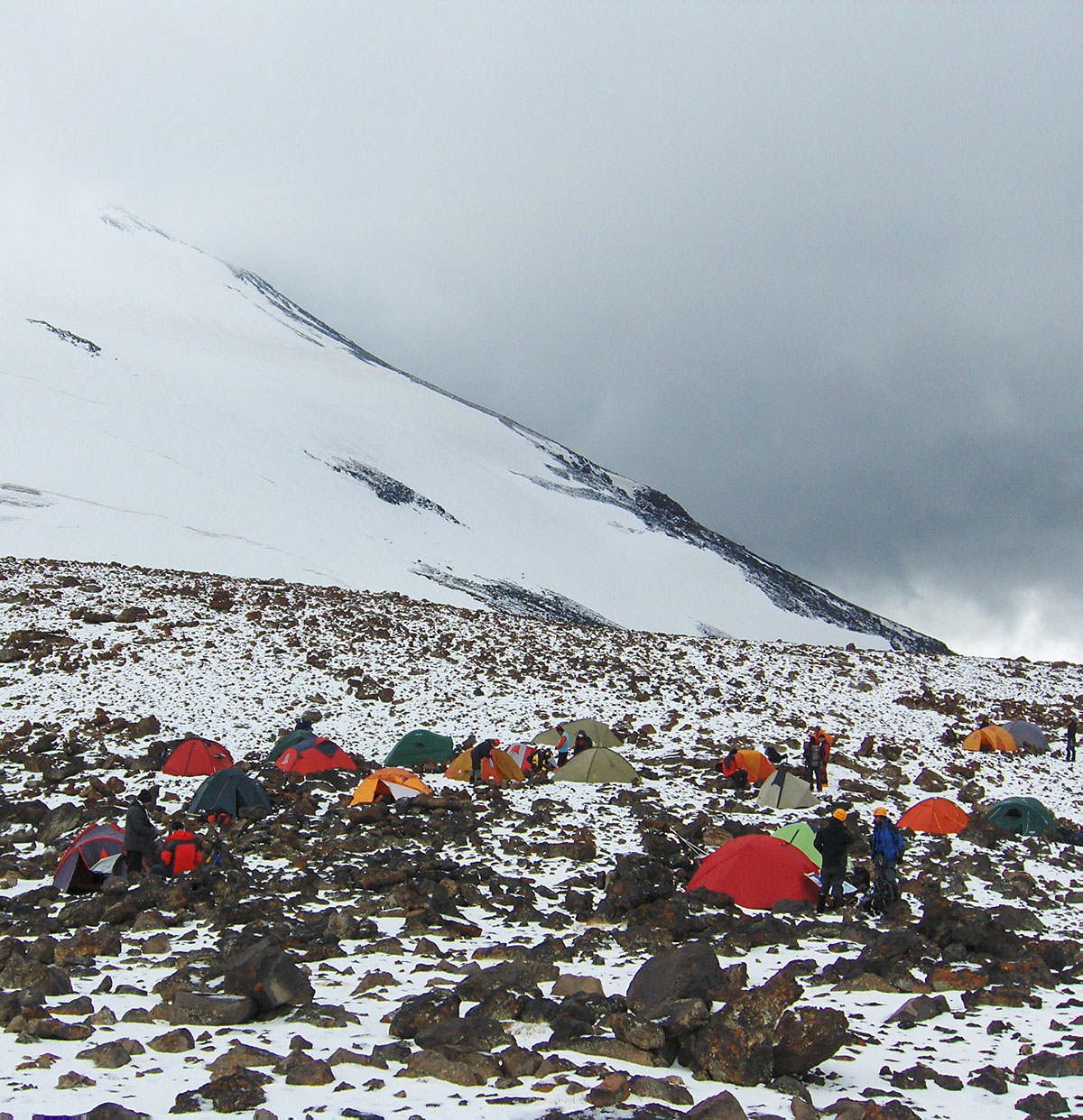 Tek što smo postavili šatore počelo je nevrijeme, isprva praćeno jakom grmljavinom i sjevanjem munja a zatim je uslijedio jak sniježni pljusak. Brzo smo se zavukli u svoje šatore i sačekali da nevrijeme prođe. Nije trajalo dugo, oko pola sata i nebo se ponovo razvedrilo i sunce izvirilo iz oblaka. Nakon ručka i odmora otišli smo do obližnjeg potočića nastalog topljenjem snijega i nasuli dovoljno vode potrebne za danas i sutrašnji uspon na vrh.