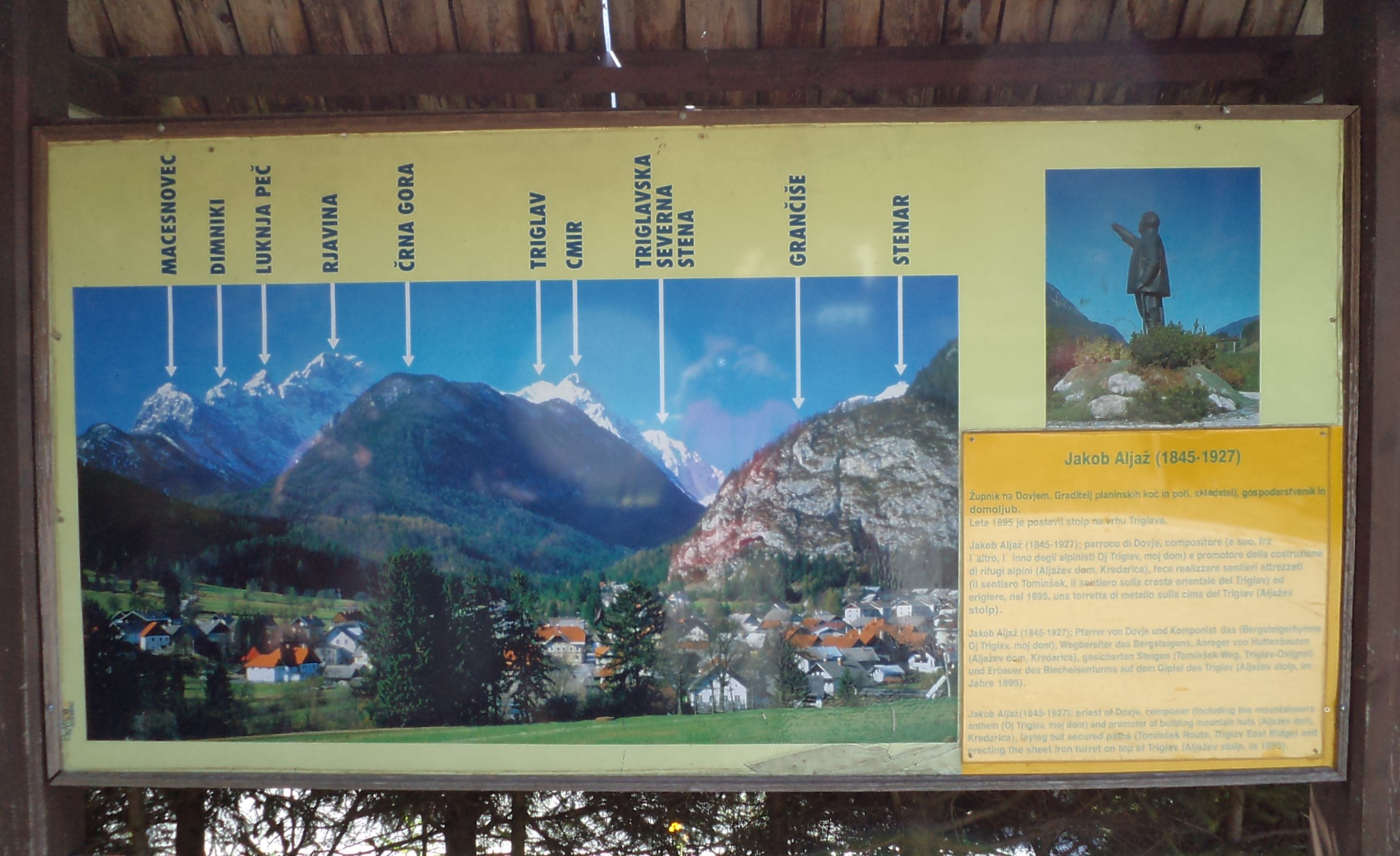 U čast Jakoba Aljaža, podignut je spomenik na desnoj strani glavne ceste prema Kranjskoj Gori na raskrižju Mojstrana – Dovje. Spomenik je svečano otkriven 27. augusta 1989., povodom 100. godišnjice dolaska Aljaža u Dovje, a djelo je kipara Nebojše Mitrića iz Beograda.
