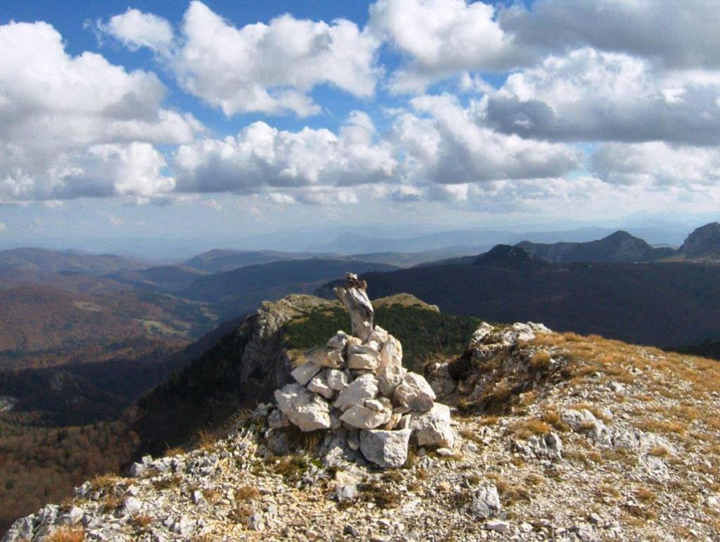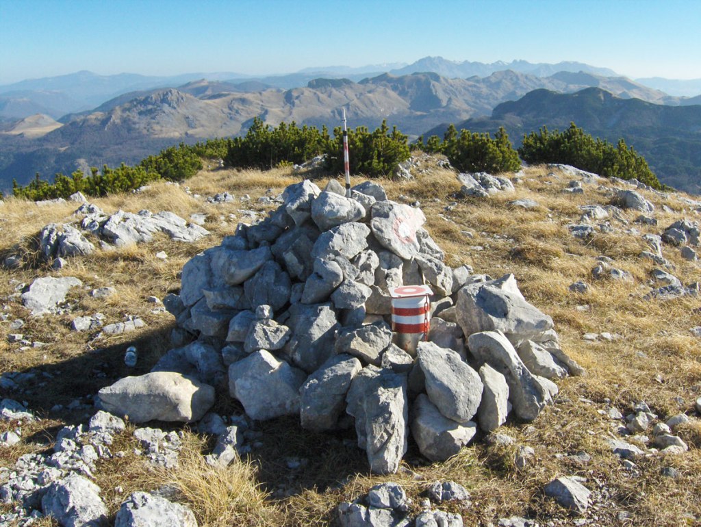 Naslovna slika: Visočica, vrh Kom (1778 m/nv), drevni način obilježavanja vrhova kamenim hrpama (kupa, piramida)