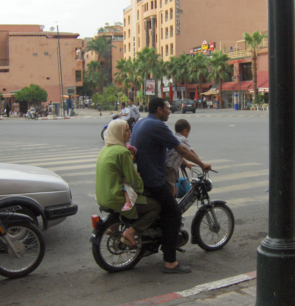 Dok putujemo vlakom sa zanimanjem kroz prozor kupea promatramo krajolik kojim prolazimo. Duž pruge su mnoge plantaže voća i maslinjaka a u daljini na prostranim poljima kombajni uveliko žanju pšenicu. Negdje na pola puta prema Marakešu plodna ravnica postepeno prelazi u pustoš s rijetikim kržljavim grmovima i suhom travom koju brste koze i ovce. Usred te pustoši ugledali smo zelenoplavu rijeku u kojoj su se kupala dječica. Između marokanske atlantske obale i planina nalaze se prostrana polja i doline. Na krajnjem jugu, na obodu Anti Atlasa, kanjoni, kao i rijeke koje kroz njih teku, lagano se gube u nepregledan pijesak Sahare. Južna obala se prostire do ivice Zapadne Sahare, dok veliki dio marokanskog stanovništva živi na obodima sniježnih planina Atlas. Nakon tri sata vožnje stižemo u Marakeš gdje nas dočekuje temperatura od 45 stepeni i kombi u kojem ne radi klima. Vozač kombija Abdul problem klime je riješio jednostavno: otvorio je širom sve prozore, dodao gas i sav ozaren od sreće pustio berbersku muziku s kasetofona. Visoki ton i preduge pjesme nalik jedna drugoj brzo su nam dosadile i nakon nekoliko pjesama Abdul je po izrazima naših lica zaključio da nismo oduševljeni njegovim muzičkim ukusom i razočaran time isključio je kasetofon.