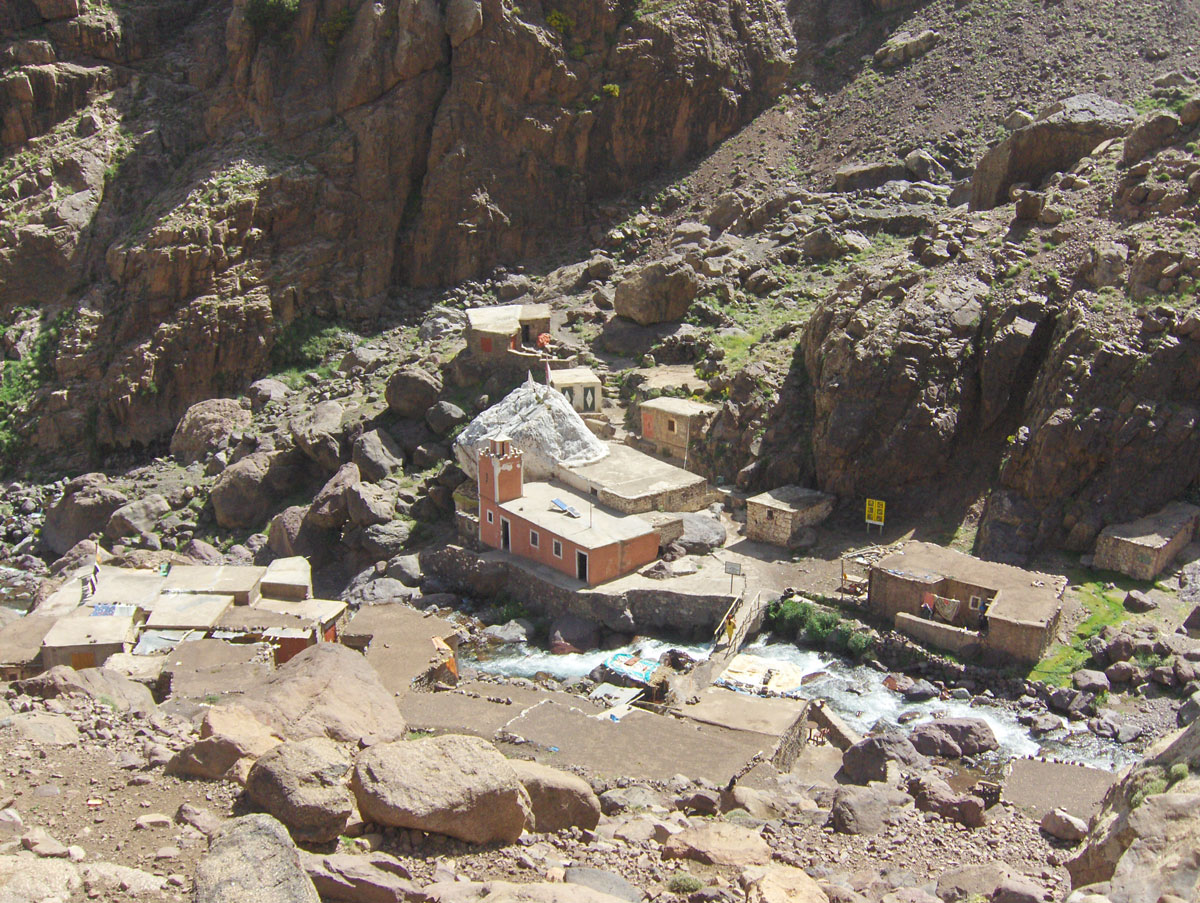 Nakon nekoliko serpentina počinje golet mjestimice ispresjecana kržljavim žbunjem i suhom travom. Iako se golet pruža na sve strane nema monotonije zbog boja stijena i zemlje koje variraju od crvene, žute, roze pa sve do sive zavisno od kuta pod kojim pada sunčeva svjetlost. Sunce je dobro upeklo i pogled na rijeku divne zelene boje i bijelina snijegova Toubkala vraća nam svježinu. Nakon dva sata hoda prelazimo mostić kod svetilišta Sidi Shamharouch (2350 m/nv) koje privlači pažnju hodočasnika i turista – planinara. Tu pravimo pauzu za odmor uz nezaobilazni vrući čaj od nane i sok od cijeđene narandže. Nakon kratke pauze nastavljamo s usponom pokraj strmih stjenovitih odsjeka tipičnih za ovaj planinski kraj. Staza vodi cik-cak između velikih stjenovitih odlomaka i okruglih busenova trave prošaranih sa žutim i ljubičastim cvjetovima.