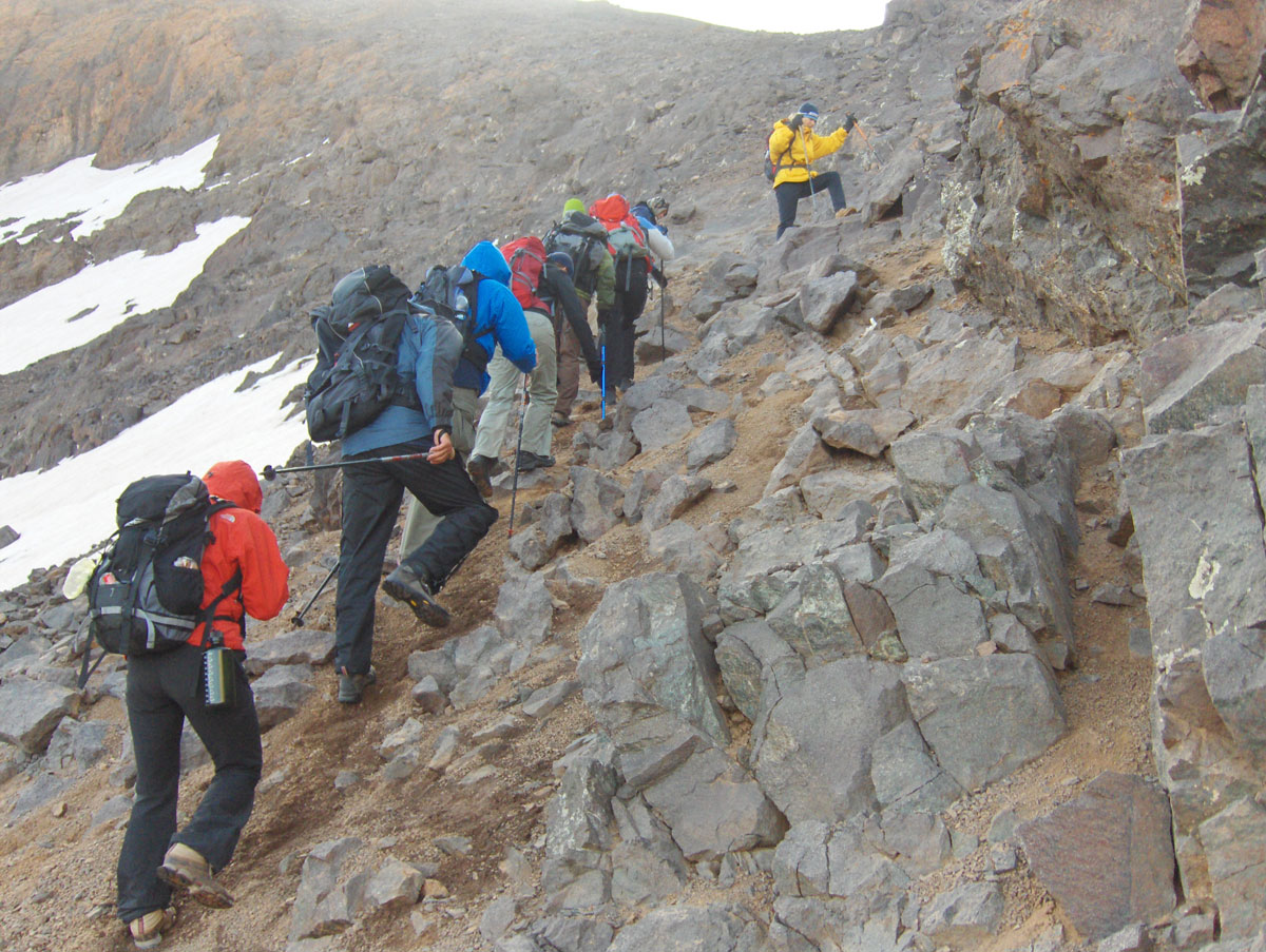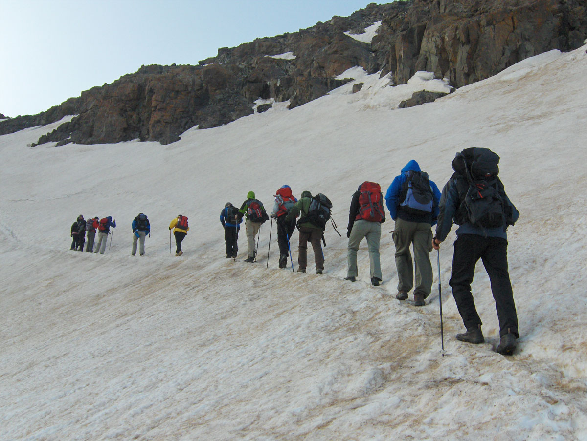 Idućeg dana, u ranim jutarnjim satima po izmaglici i velikom vjetru krenuli smo na uspon od pl. doma pješačkom stazom koja nije označena s putokaznim tablama. Također je čudan i prelazak dubokog potoka odmah poviše pl. doma kod velikog slapa gdje je postavljena jedna malo deblja, široka daska koja uopće nije fiksirana za stjenovitu obalu. Po prelasku, staza se uspinje cik-cak preko dugačkog sipara i traverzira strmu padinu kojom se slijeva potok s lijepim slapovima. Ubrzo nakon prelaska i ovog drugog potoka prolazimo kroz labirint od krupnih stjenovitih odlomaka i stižemo na snijeg koji smo jučer iz doline dok nas je sunce pržilo s čežnjom gledali. Dalje nastavljamo s usponom preko strmih sniježnih padina do izlaska na sedlo (3850 m/nv). U ovo doba godine snijeg je prilično mekan i dereze su nepotrebne iako smo ih u ruksaku ponijeli za svaki slučaj. Izmaglica je nestala a vjetar koji nas je uporno cijelo jutro pratio malo je utihnuo, tako da smo na sedlu napravili malo dužu pauzu za odmor i osvježili se toplim čajem, čokoladom i grožđicama.