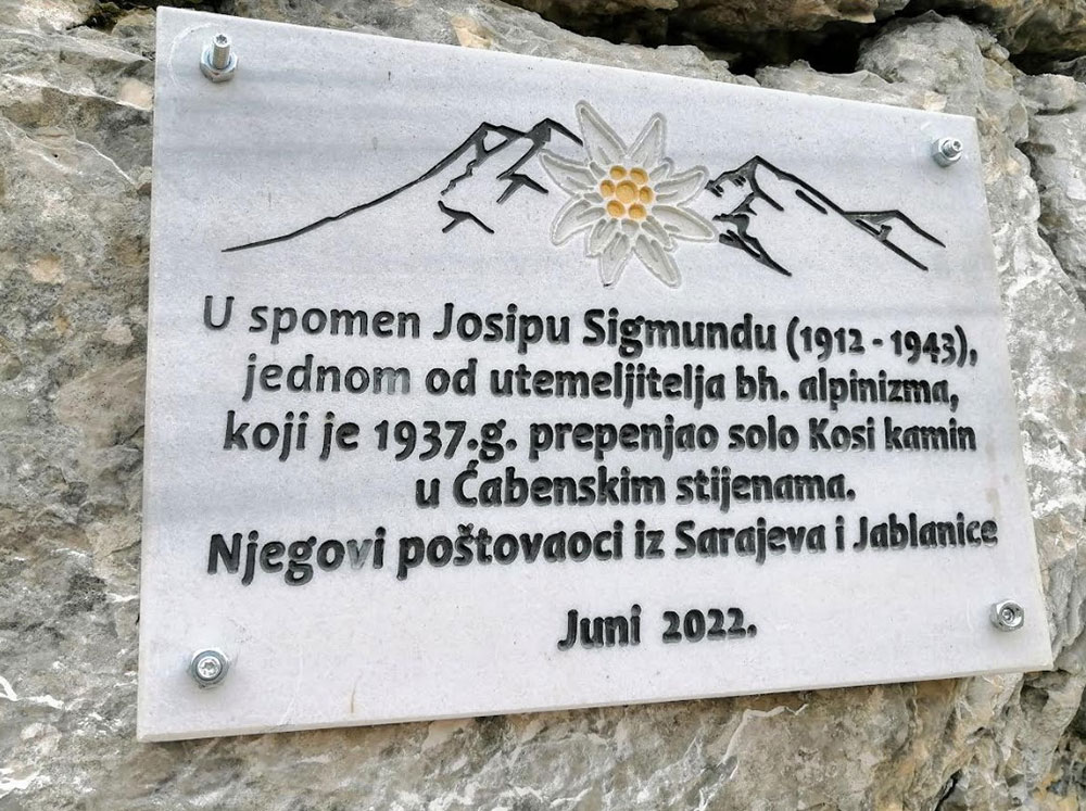 23.9.2023. god. Postavljena je spomen-ploča Josipu Sigmundu (1912. – 1943.), jednom od trojice glavnih utemeljitelja bh. alpinizma. Spomen-ploča se nalazi ispod Suhe Lastve, pored markirane planinarske staze koja vodi ispod Nikolinih stijena prema Bijelom jezeru, na mjestu odakle se otvara pogled na Ćabenske stijene.