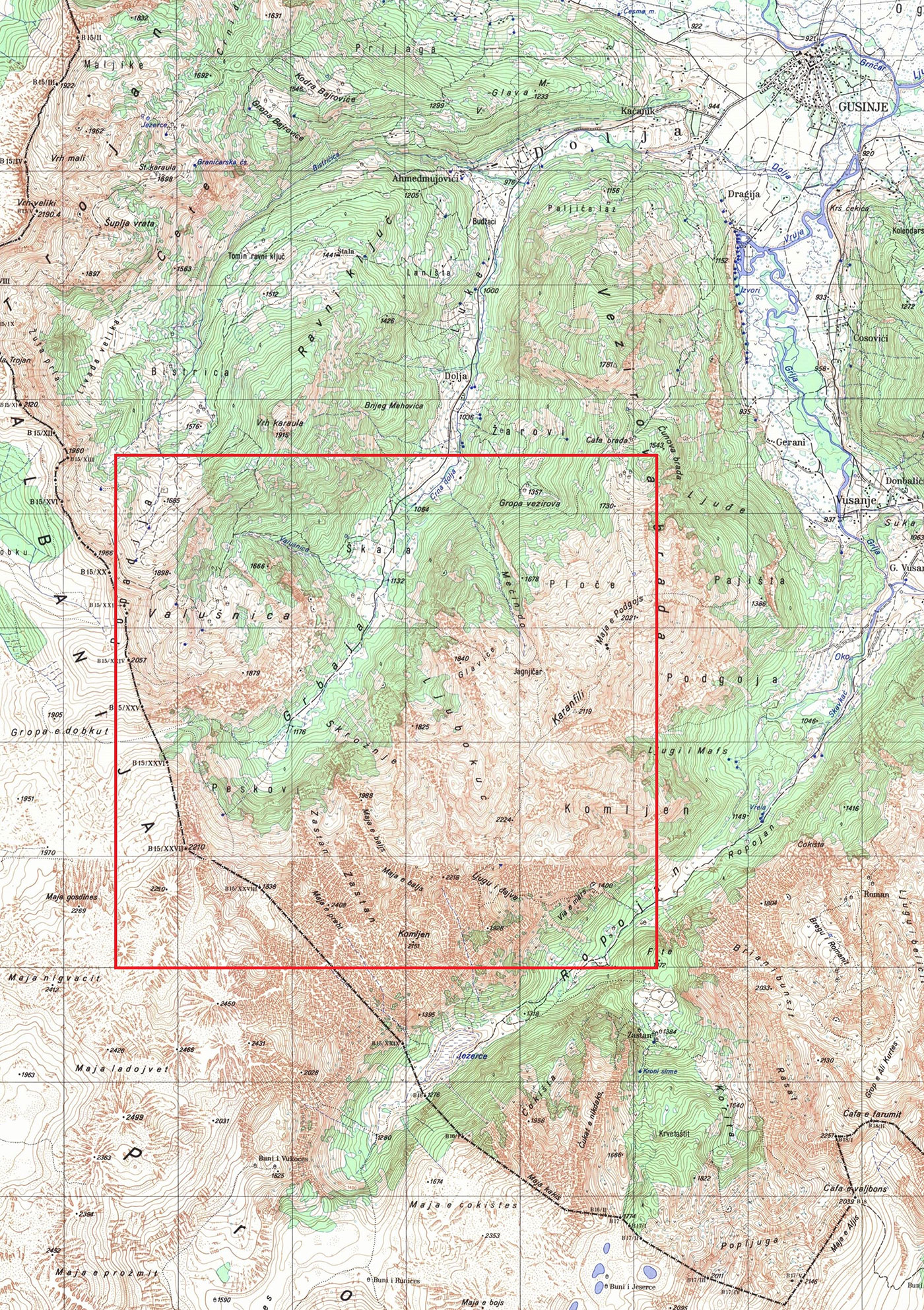 Napomena: Listovi Gusinje i Jezerce su spojeni u jedan blok. Albanska teritorija izrađena po albanskoj TK R=1:50.000, izdanja iz 1929. – 1930. god.
