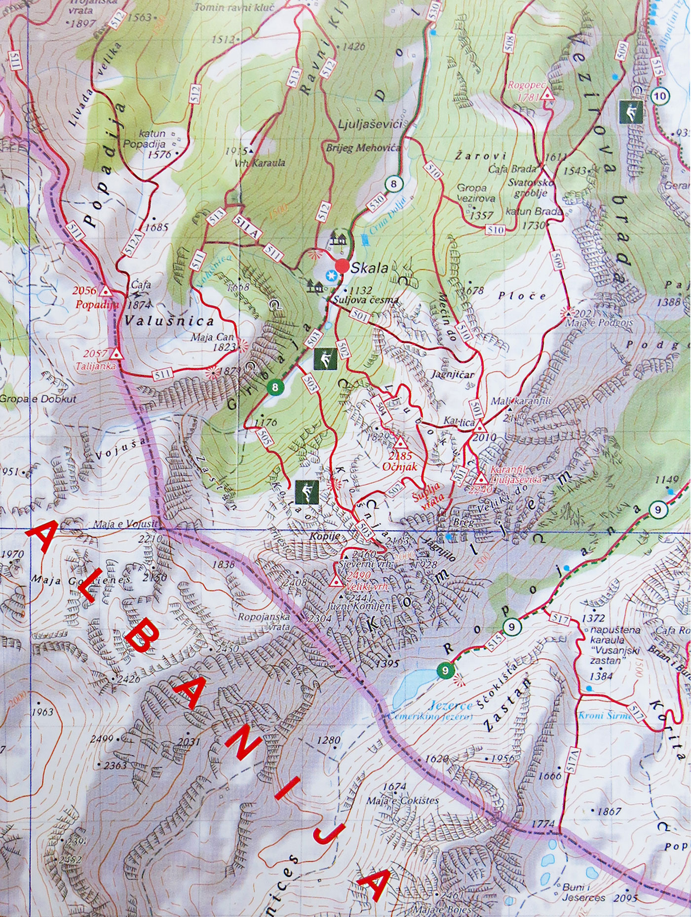 Usporedimo li karte br. 1 i 5, sa kartom br. 7 primjetit ćemo da su nazivi vrhova na albanskom preimenovani, na primjer: Maja Njeri e kriyte 2185 m (Smrznuti čovjek) – nosi alpinistički naziv “Očnjak”, Maja e Balles 2460 m (Balin vrh) – alpinistički naziv “Sjeverni vrh”, Maja Gurte e Zjarmit 2490 m (Vatreni kamen ili Kremeni vrh) – alpinistički naziv “Veliki vrh”, Maja e Keče 2441 m (Zao vrh ili Gadan vrh) – alpinistički naziv “Južni vrh”. Ovo se odnosi i na još neke druge toponime, na primjer: Lugu e Kuq / Ljubokuće, Ćafa e Skrožs / Krošnjin prolaz, Skala / Škala i dr.