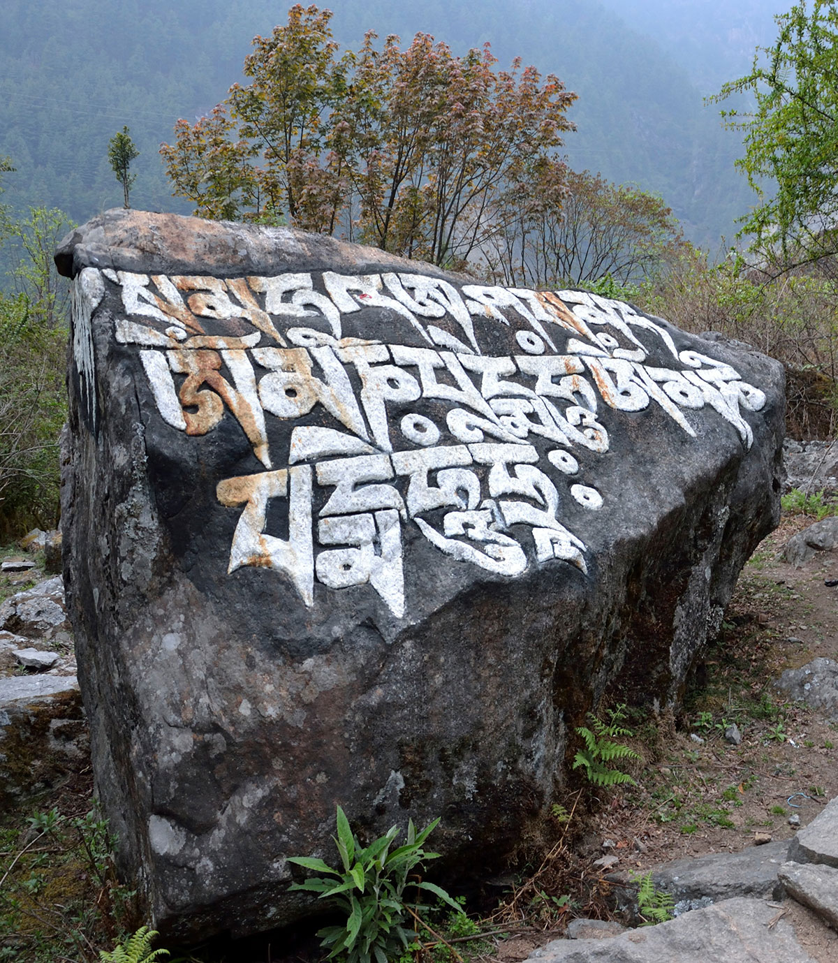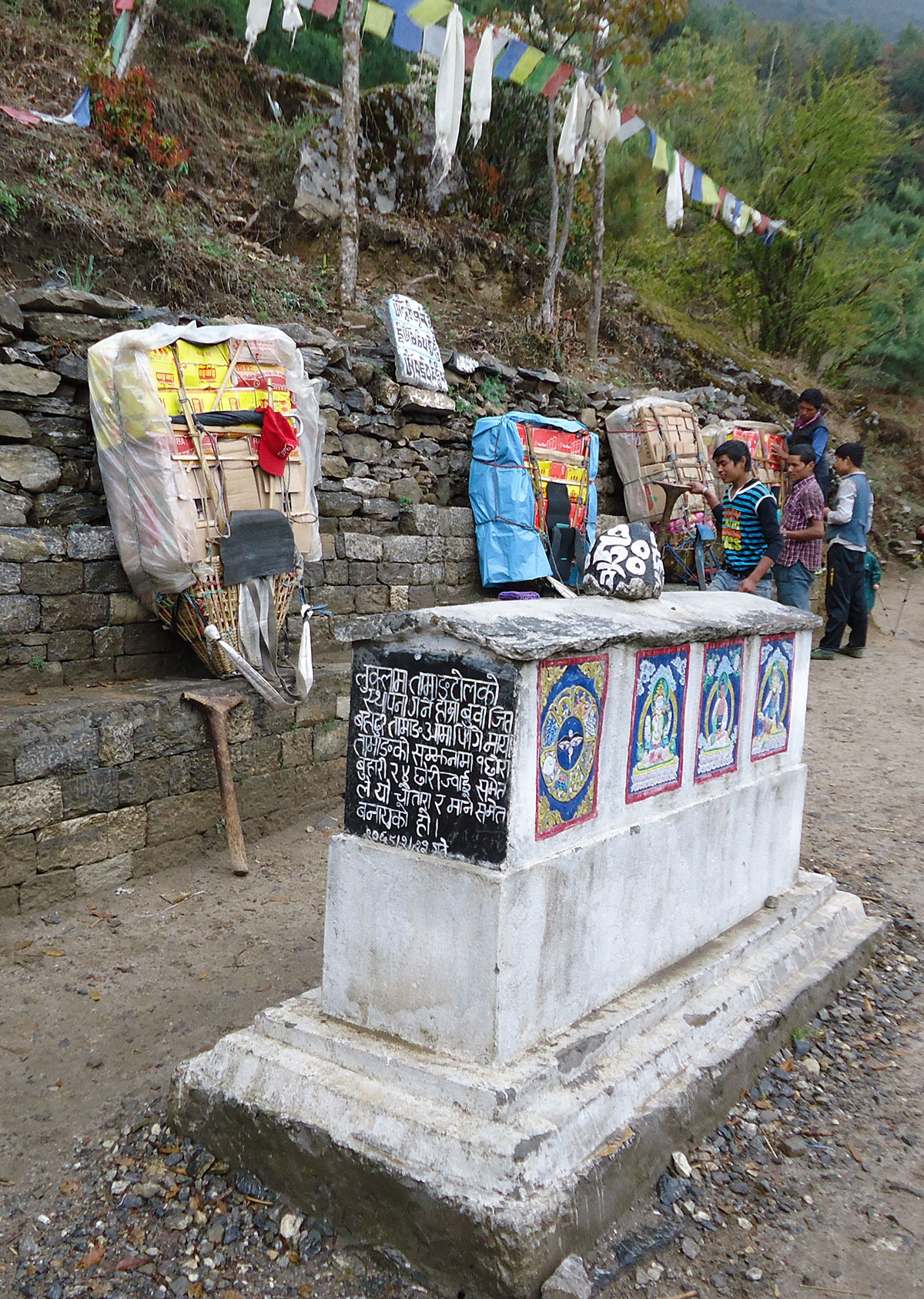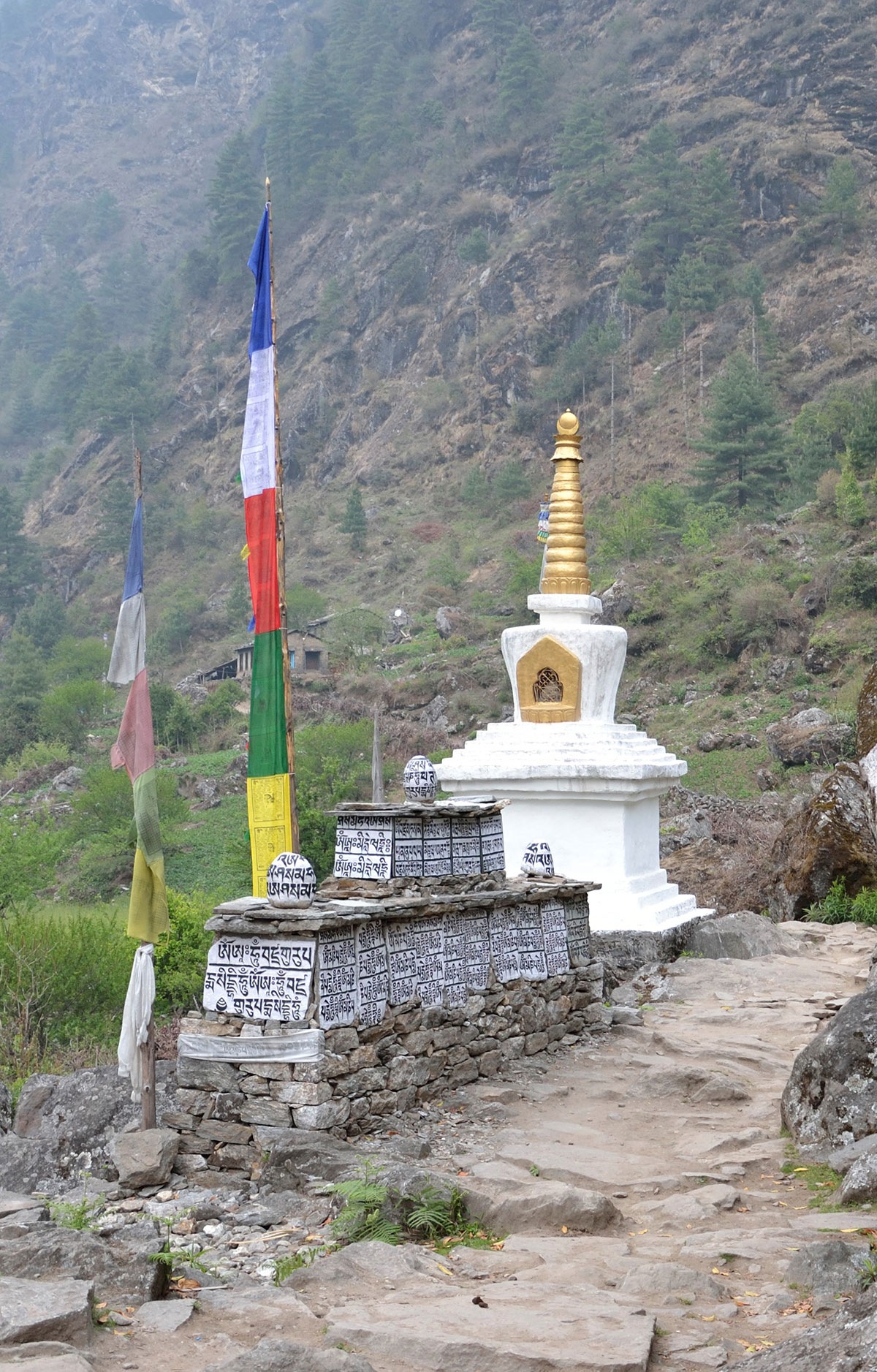 Prolazimo zanimljivim krajolikom. U selima su lijepe kuće i lođevi od klesanog kamena. Prozori, vrata i krovovi obojeni su u plavo. Na svakom koraku primjetni su novoizgrađeni lodževi koji nude pansionsku uslugu. Ovo pokazuje da se od turista koji ovuda prolaze može pristojno živjeti. U ovim zabitim krajevima stotinama godina ljudi su se bavili zemljoradnjom i stočarstvom a u slobodno vrijeme se molili svome bogu Budi. U njegovu slavu podigli su mnogobrojne gompe – budističke hramove, molitvene mlinove, čortene, mani zidove – skupina naslaganih kamenih ploča sa uklesanim svetim tekstovima i molitvama. Prolazeći pokraj ovih budističkh svetinja zaobilazimo ih uvijek s lijeve strane po savjetu našeg vođe Dragana Jaćimovića, iskusnog Himalajca i dobrog poznavaoca običaja u Nepalu. Na planinskim prijevojima, vrhovima, mostovima, na ulazu i izlazu naselja, na ulazima dolina razapete su molitvene zastavice u pet boja koje označavaju pet budističkih elemenata: zemlju, vjetar, vatru, vodu i svijest. Buda je po svemu sudeći uslišao njihove molitve i za nagradu im doveo ljude iz cijelog svijeta sa punim novčanicima. Dok prelazimo viseći most na rijeci Thado Koshi Khola od stravičnog pogleda u dubinu ne primjećujemo da je kiša počela da pada. Po prelasku mosta stižemo u seoce Nurning (2592 m/nv) koje je na najnižoj nadmorskoj visini dionice puta od Lukle do Phakdinga. Sklanjamo se u jednu čajdžinicu i uz vruć čaj od minte čekamo da kiša prestane. Kiša je malo umanjila, navlačimo kabanice i nastavljamo pješačenje. U Phakdingu prelazimo most na rijeci Dudh Koshi i stižemo u ”Sunrise Lodge” u kojem ćemo večeras noćiti. Lođ je na desnoj obali rijeke odmah pokraj mosta. Nakon večere umor nas savlađuje i rano odlazimo u svoje sobe. U sobi osim dva kreveta od namještaja nema ničeg drugog. Ležim i osluškujem kišne kapi koje dobuju po krovu, njihov zvuk brzo me uspavljuje.
