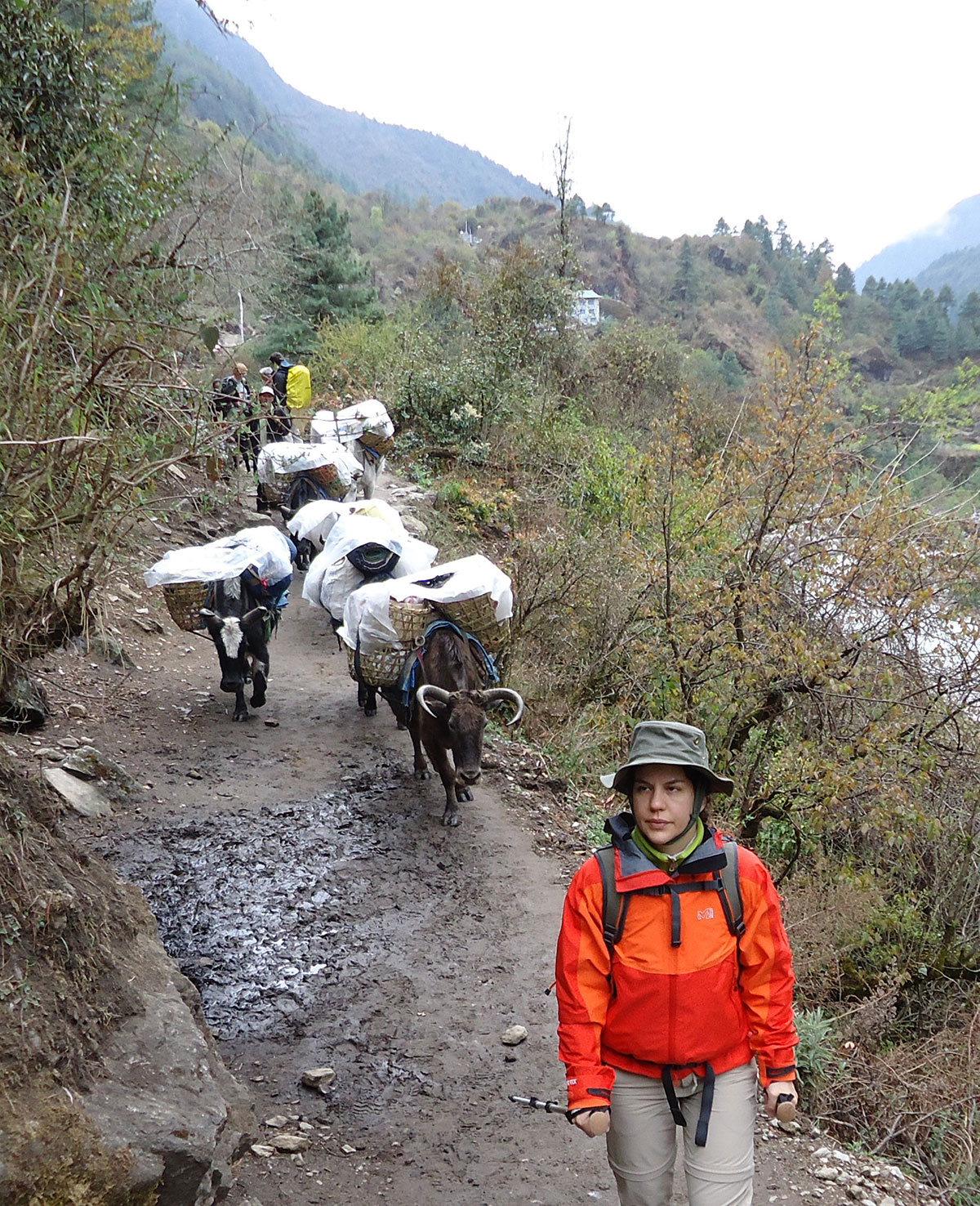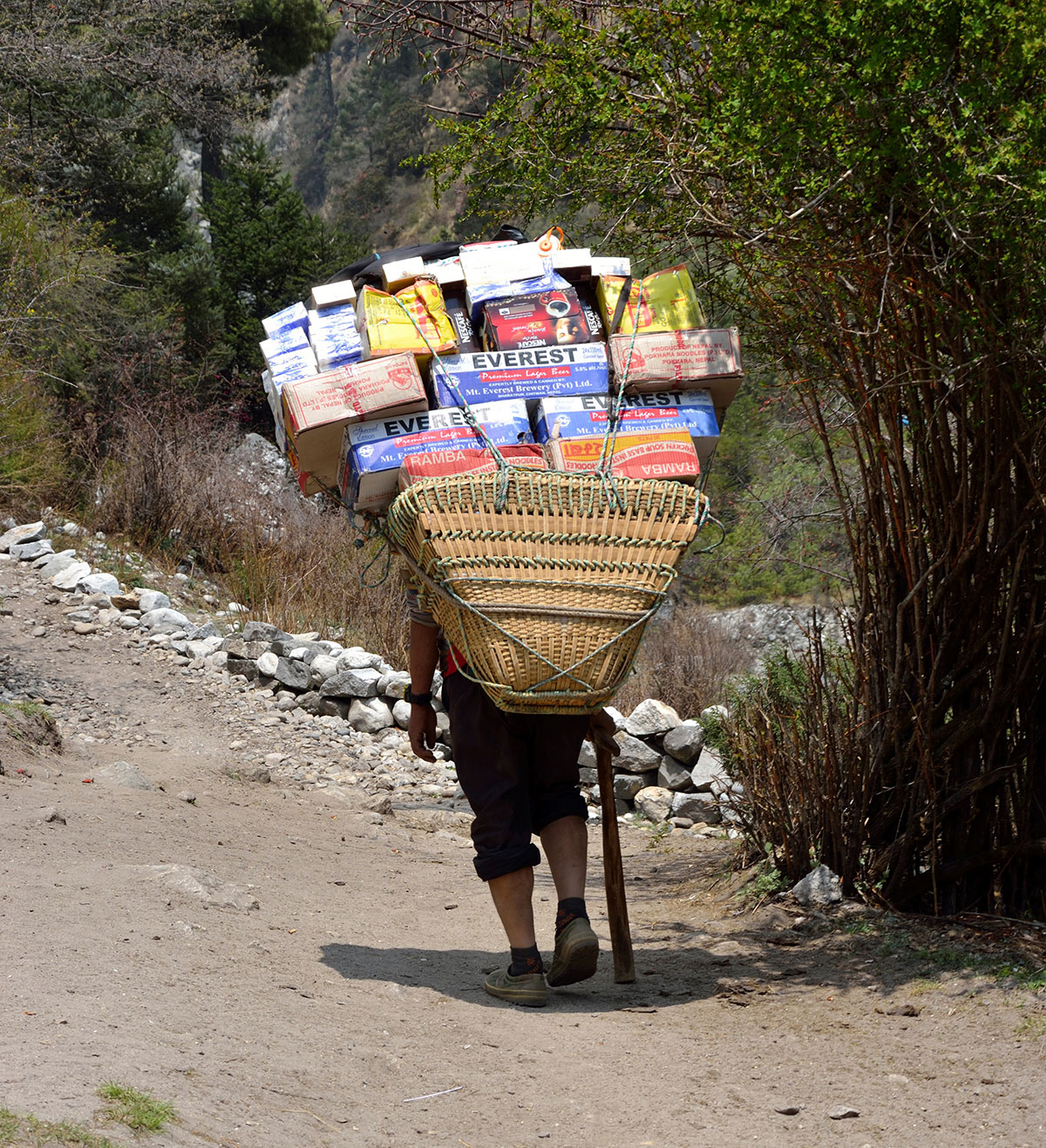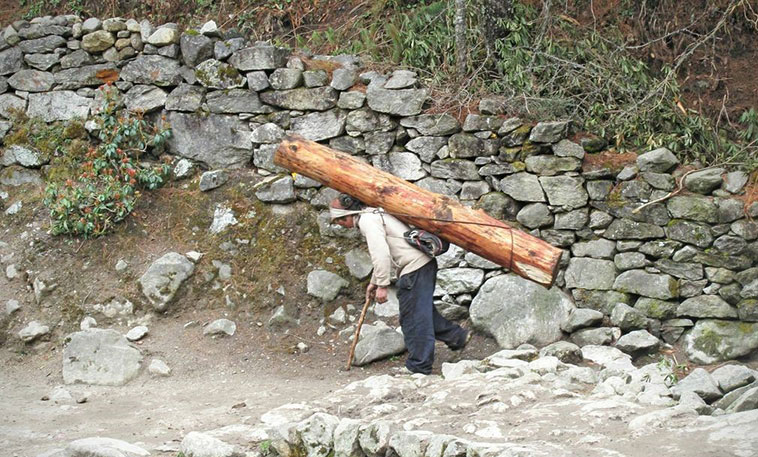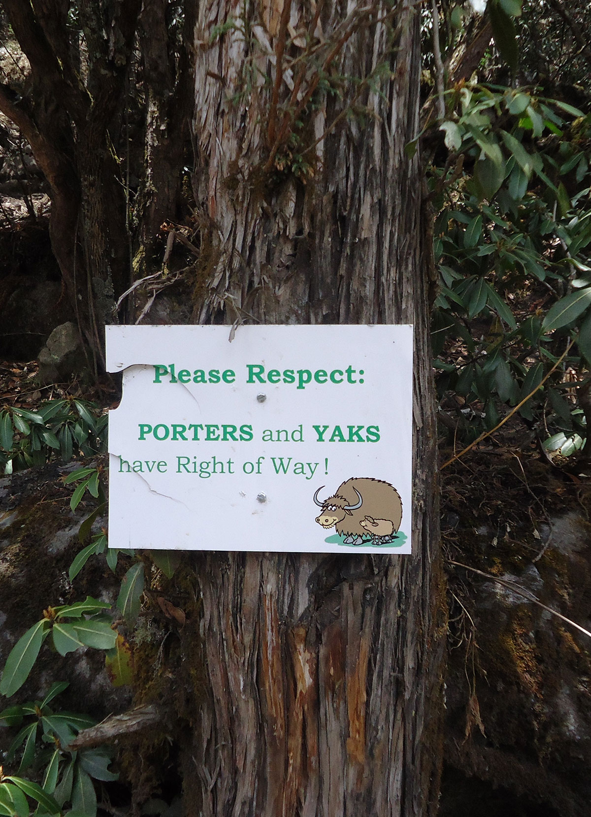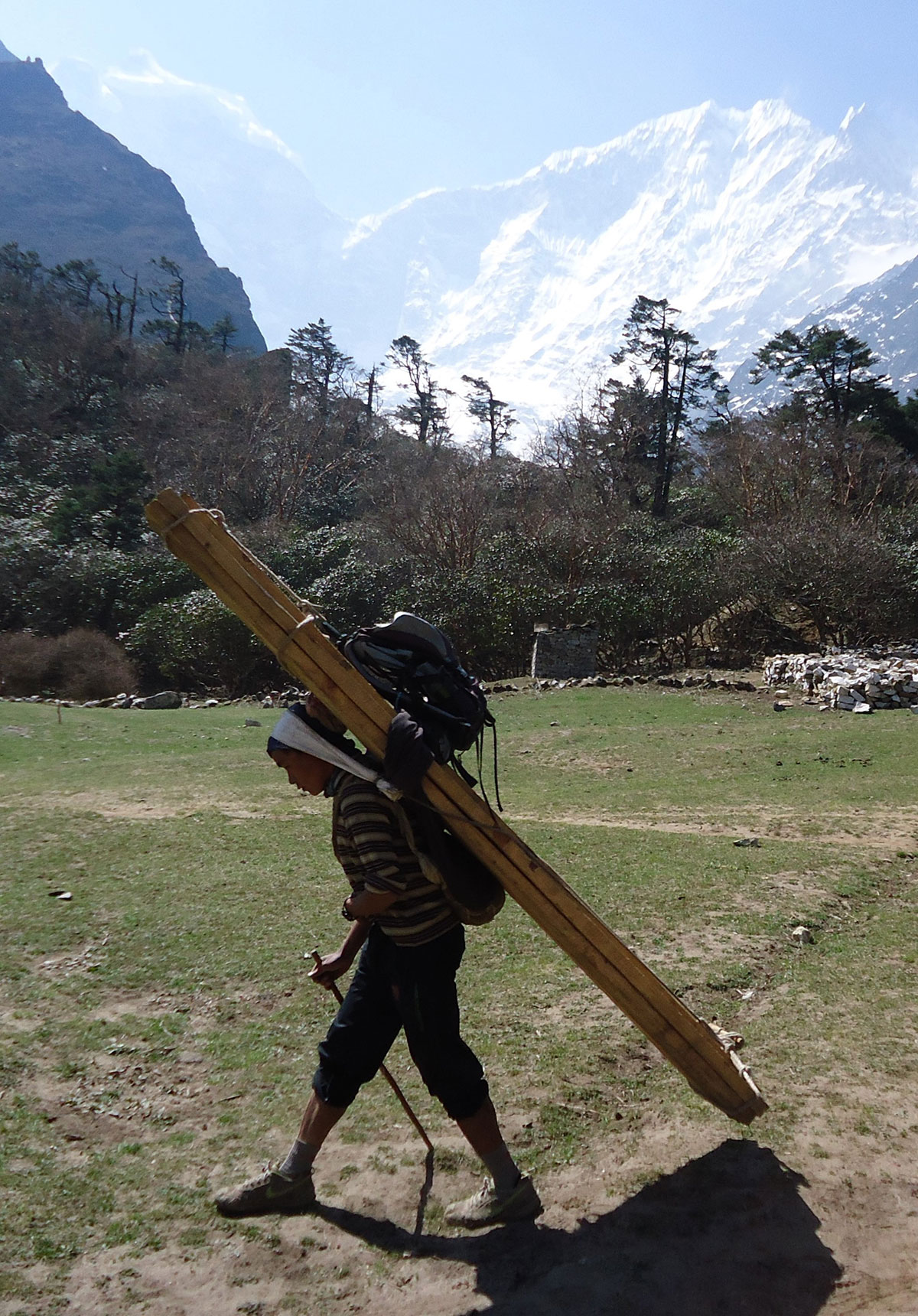 U Luklu svraćamo u ”Paradise Lodge” na vruć čaj od đumbira i čekamo da stignu naši nosači. Nakon predaha predajemo naše transportne vreće sa penjačakom opremom koja će biti transportovana u Island Peak Base Camp na leđima jakova. Od Lukle dalje ne postoji cesta, postoji samo široki i dobro uređeni pješački put i sav teret se nosi na leđima. Gdje god se okreneš svi su natovareni i ljudi i tegleće životinje. Nosači su nevjerovatno izdržljivi i terete teške 50 kg pa i više od toga nose po cijeli bogovetni dan strmim planinskim stazama, kilometrima daleko. Težak i isrpljujući posao nosača započinju još u ranoj mladosti, kao dječaci. Mnogi od njih ne dožive 50 godina starosti. Znatno olakšanih ruksaka polazimo na višednevno pješačenje. Prvi dan boravka u Himalajima započinjemo hodajući nizbrdo. Naime sa 2843 m/nv na kojoj se nalazi Lukla spuštamo se u selo Phakding na 2610 m/nv. Put nas vodi dolinom kojom u vrijeme penjačke sezone prolaze na stotine planinara iz cijelog svijeta željnih avantura. Prisutan je i veliki broj “običnih“ turista koji dolaze u posjetu Nacionalnom parku ”Sagarmatha”. U posljednje vrijeme čuje se mišljenje da boravak u Himalajima blagotvorno djeluju na zdravlje ljudi, navodno zbog zračenja kristala kojim obiluje ovo najveće svjetsko gorje. Već od ranije je poznata ljekovitost himalajske kristalne soli. Marketinški trik ili ne, pokazaće vrijeme.