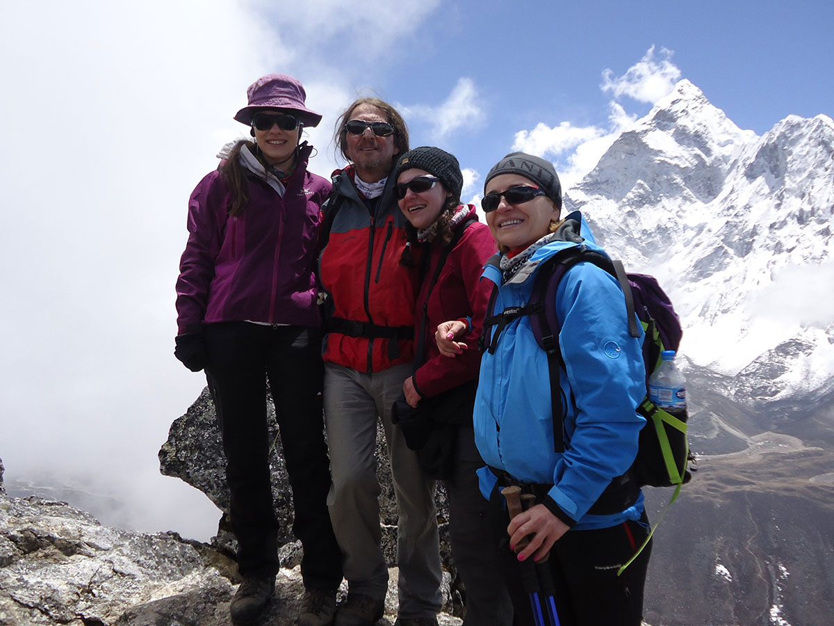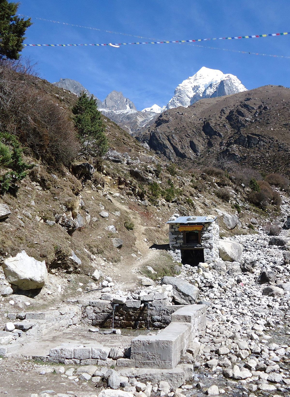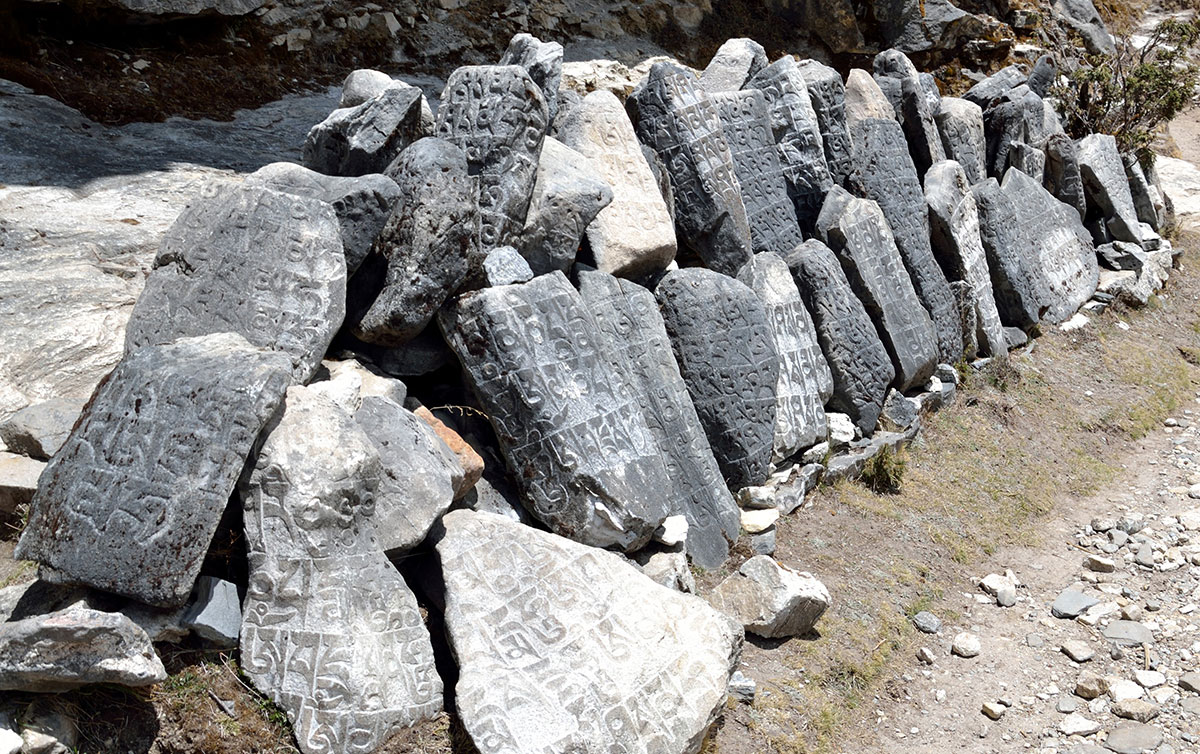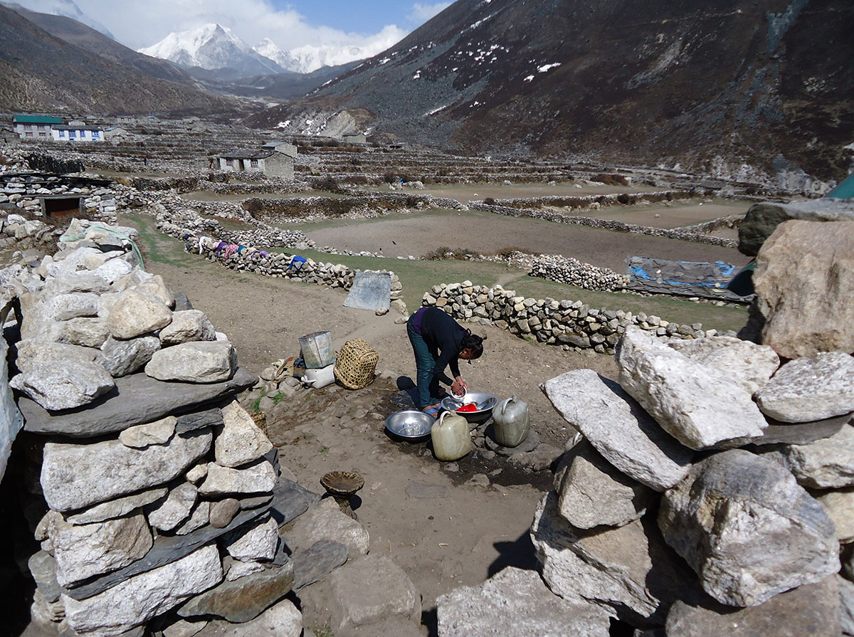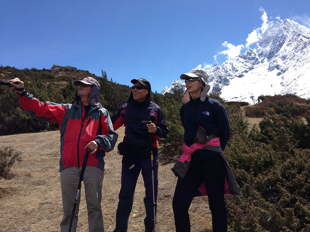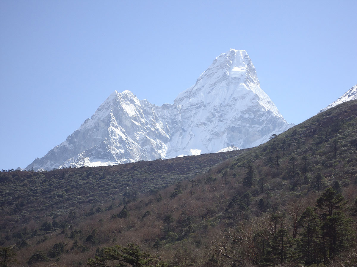 Ujutro me budi sunce i prvo što sam ugledao sa prozora sobe su bili snježno bijeli vrhovi: Nuptse, Mount Everest, Lhotse i Ama Dablam koji su blistali na plavom nebu bez ijednog oblačka. Nije bilo čak ni uobičajene ”perjanice” koja se vječno vije oko najvišeg vrha svijeta. Uzimam fotoaparat i bilježim ovaj divan prizor. Već je peti dan našeg boravka u Himalajima. Nakon doručka pakujemo ruksake i napuštamo Deboche. Put vodi kroz crnogoričnu šumu mjestimično prošaranu procvjetalim grmovima magnolie. Vremenske prilike su se ustalile i nema više uporne i dosadne kiše. Prijepodne nas prati lijepo i sunčano vrijeme, a poslijepodne na nebu se navlače oblaci i magla. Noći su vedre obasjane mjesečinom i umjereno hladne. Iz dana u dan lagano privikavamo naš organizam na visinu. Vodimo računa da ne dehidriramo i često pijemo vodu, čaj, voćni sok, supu. U prosjeku dnevno u organizam unosimo 3 do 4 litre tekućine. Dehidrirani organizam je izložen opasnosti od visinske bolesti i toga se svi pomalo pribojavamo. Prelazimo viseći most na rijeci Imja Khola i stižemo u selo Pangboche (3930 m/nv). Smjestili smo se u lođ “Higland Sherpa Resort” i odlazimo na ručak. Jela se sastoje od raznog povrća, riže, krompira i piletine sa začinima. Fascinira nas brzina posluživanja, samo što smo naručili jelo je već na stolu! Poslije ručka odlazimo u šetnju. Na izlazu iz sela je potok sa nekoliko molitvenih mlinova. Na potoku zatičemo mlađu ženu kako pere ćilim i dječaka koji hladnom vodom iz potoka pere kosu kao u sred ljeta. Na povratku u selo prolazimo uskim puteljkom između kuća ograđenih niskim kamenim zidovima. U dvorištima kuća se odvija svakodnevni život, žene peru suđe i rublje a djeca skakuću i igraju se. U jednom dvorištu pažnju nam privlače dvojica majstora koji vješto klesaju kamen za zidanje nove kuće. Malo dalje niz puteljak jedna žena svježom balegom od jaka popunjava šupljine u kamenom zidu kuće. Pred mrak stižemo u lodž. Nakon večere ostajemo u trpezariji da se uz vruć čaj grijemo pored peći koju je domaćica naložila osušenom balegom od jaka. Sa zanimanjem razgledamo vitrinu sa praznim bocama za kisik. Na svakoj od boca je ispisana godina a najstarija je iz 1952.