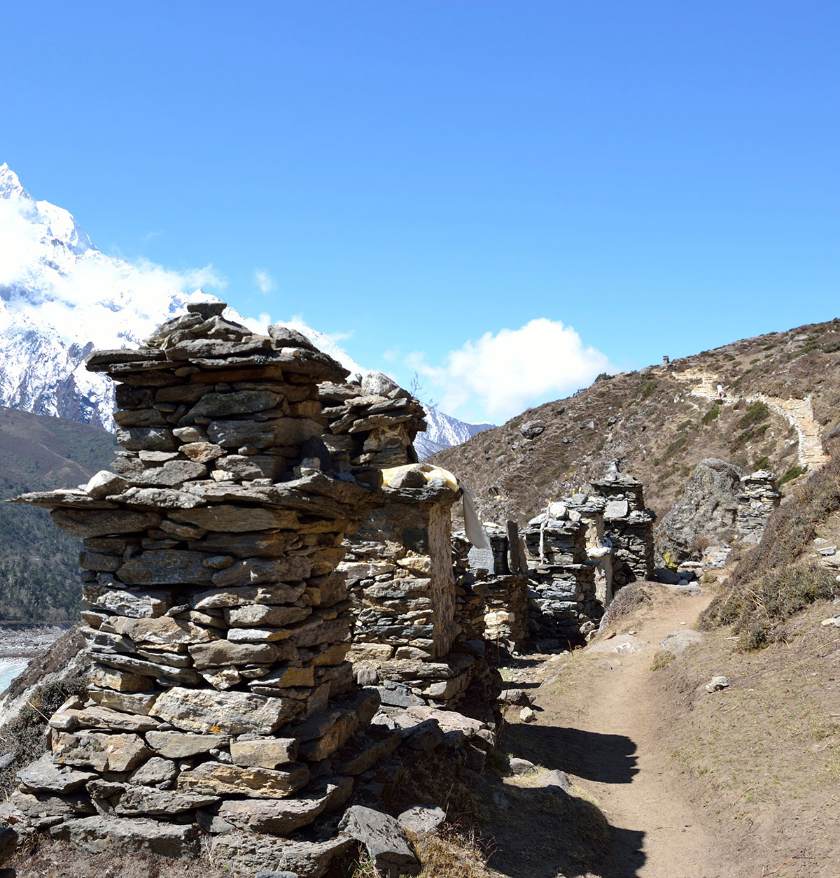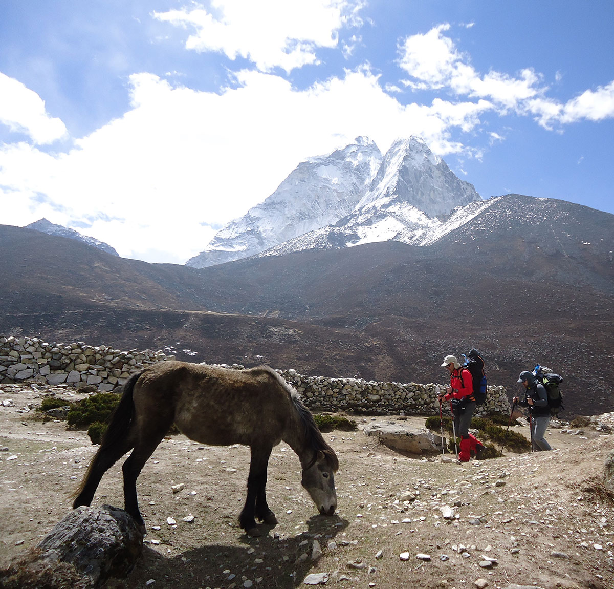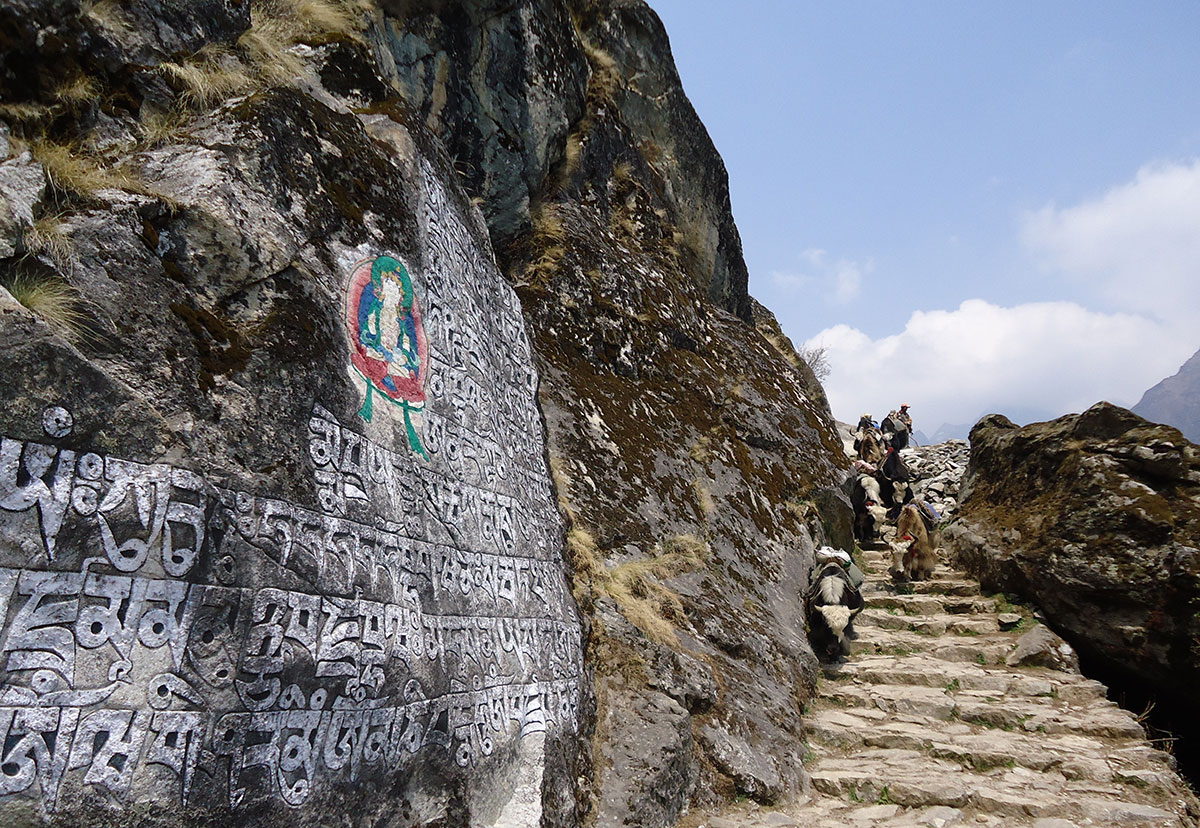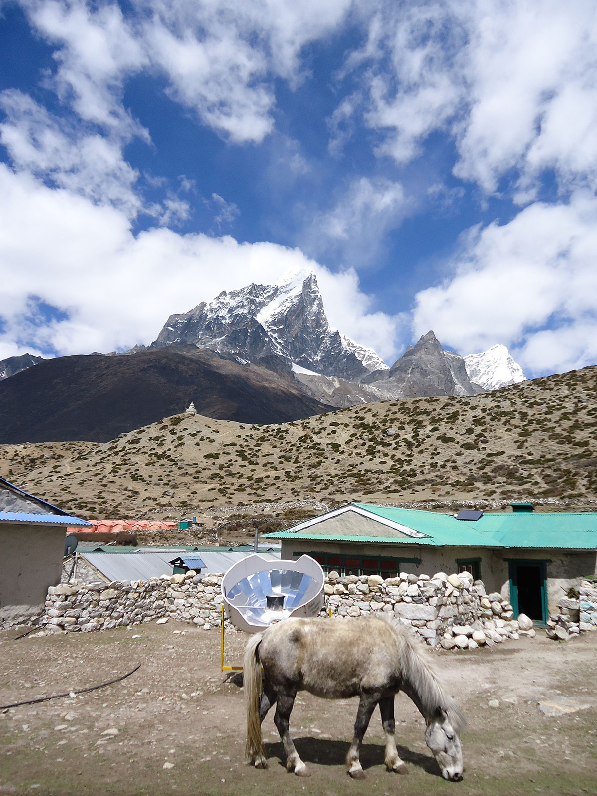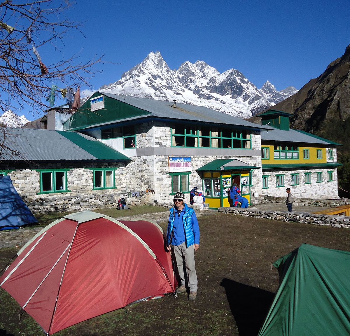 Ujutro me budi sunce i prvo što sam ugledao sa prozora sobe su bili snježno bijeli vrhovi: Nuptse, Mount Everest, Lhotse i Ama Dablam koji su blistali na plavom nebu bez ijednog oblačka. Nije bilo čak ni uobičajene ”perjanice” koja se vječno vije oko najvišeg vrha svijeta. Uzimam fotoaparat i bilježim ovaj divan prizor. Već je peti dan našeg boravka u Himalajima. Nakon doručka pakujemo ruksake i napuštamo Deboche. Put vodi kroz crnogoričnu šumu mjestimično prošaranu procvjetalim grmovima magnolie. Vremenske prilike su se ustalile i nema više uporne i dosadne kiše. Prijepodne nas prati lijepo i sunčano vrijeme, a poslijepodne na nebu se navlače oblaci i magla. Noći su vedre obasjane mjesečinom i umjereno hladne. Iz dana u dan lagano privikavamo naš organizam na visinu. Vodimo računa da ne dehidriramo i često pijemo vodu, čaj, voćni sok, supu. U prosjeku dnevno u organizam unosimo 3 do 4 litre tekućine. Dehidrirani organizam je izložen opasnosti od visinske bolesti i toga se svi pomalo pribojavamo. Prelazimo viseći most na rijeci Imja Khola i stižemo u selo Pangboche (3930 m/nv). Smjestili smo se u lođ “Higland Sherpa Resort” i odlazimo na ručak. Jela se sastoje od raznog povrća, riže, krompira i piletine sa začinima. Fascinira nas brzina posluživanja, samo što smo naručili jelo je već na stolu! Poslije ručka odlazimo u šetnju. Na izlazu iz sela je potok sa nekoliko molitvenih mlinova. Na potoku zatičemo mlađu ženu kako pere ćilim i dječaka koji hladnom vodom iz potoka pere kosu kao u sred ljeta. Na povratku u selo prolazimo uskim puteljkom između kuća ograđenih niskim kamenim zidovima. U dvorištima kuća se odvija svakodnevni život, žene peru suđe i rublje a djeca skakuću i igraju se. U jednom dvorištu pažnju nam privlače dvojica majstora koji vješto klesaju kamen za zidanje nove kuće. Malo dalje niz puteljak jedna žena svježom balegom od jaka popunjava šupljine u kamenom zidu kuće. Pred mrak stižemo u lodž. Nakon večere ostajemo u trpezariji da se uz vruć čaj grijemo pored peći koju je domaćica naložila osušenom balegom od jaka. Sa zanimanjem razgledamo vitrinu sa praznim bocama za kisik. Na svakoj od boca je ispisana godina a najstarija je iz 1952.