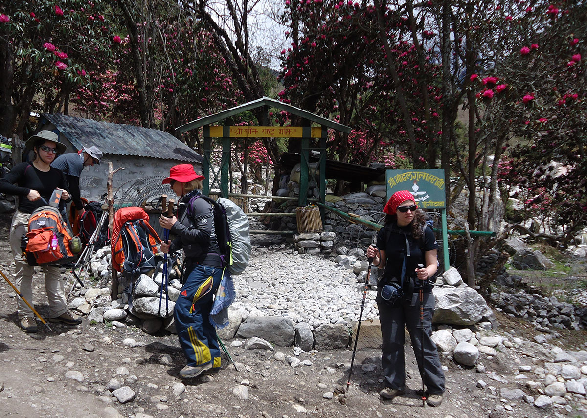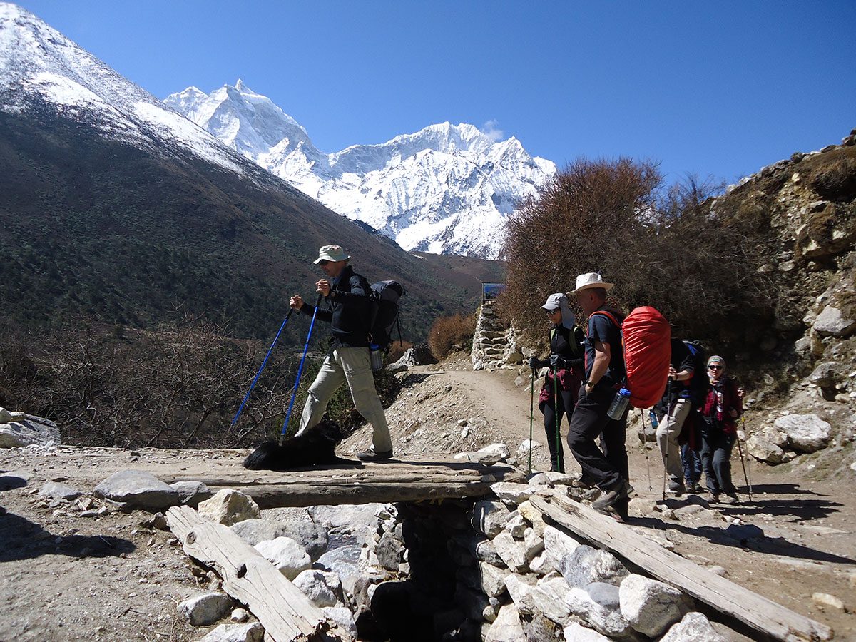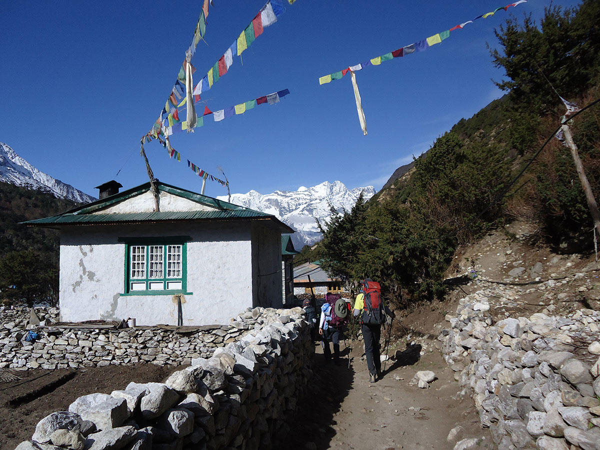 Ujutro napuštamo Namche Bazar i krećemo za Deboche. Hodamo lijepo uređenim i širokim putem gotovo po izohipsi. Prolazimo pokraj nekoliko budističkih gompi, svaka je postavljena na mjestu sa kojeg se pruža širok i lijep vidik. Nailazimo na tablu s upozorenjem ”Molimo poštujte: nosači i jakovi imaju prednost na putu”. Nosače pozdravljamo tradicionalnim hindu pozdravom ”namaste”. Iako su teško natovareni uzvraćaju nam pozdrav s osmjehom na licu. Stižemo u selo Khumjung (3550 m/nv) i pravimo kratku pauzu za odmor. Nastavljamo dalje i spuštamo se u selo Phungi Thanga (3250 m/nv). Spuštajući se ”izgubili” smo 300 metara visinske razlike koju kasnije valja nadoknaditi jer nas dalje očekuje uspon u Tengboche. Na izlazu iz sela je punkt na kojem vojnici vrše kontrolu prolaznika. U blizini punkta je viseći most na rijeci Dudh Koshi kojeg prelazimo i penjemo se strmmim putem sa bezbroj serpentina kroz šumu divljeg rododendrona. Crveni cvjetovi rododendrona, čisto plavo nebo i sniježnobijeli vrhovi česta su meta naših fotoaparata. Nakon savladanih 617 metra visinske razlike stižemo do budističkog samostana u selu Tengboche (3867 m/nv).