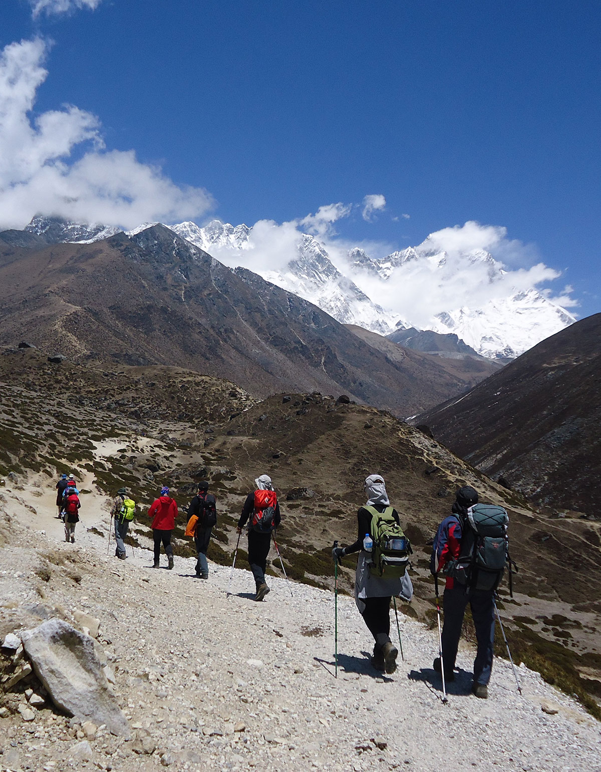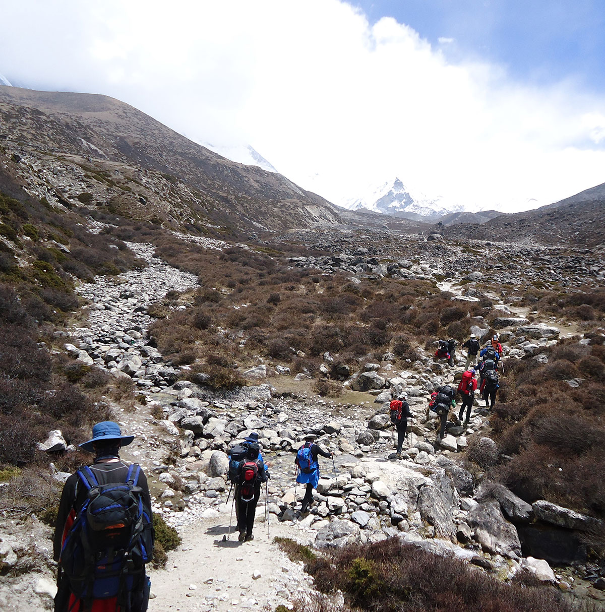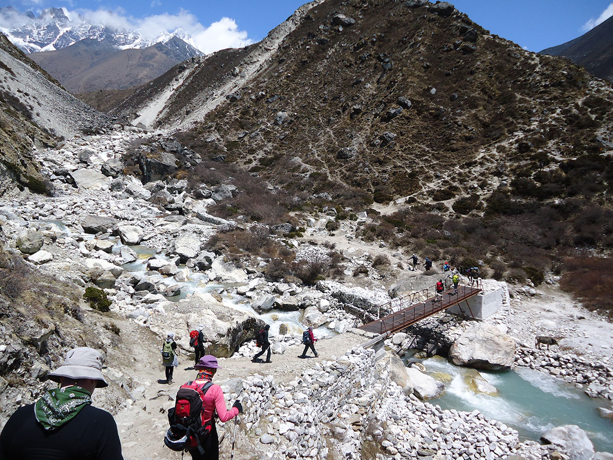 Nakon osam dana boravka u Himalajima uslijedio je rastanak sa našom trekking grupom. Za kratko vrijeme smo se sprijateljili i srdačno družili. Na rastanku bilo je malo sjete. Život nas je naučio da otrpimo navrle emocije. Poželjeli smo jedni drugima sreću, uprtili ruksake na leđa i krenuli svako na svoju stranu. Oni odlaze u Luklu a mi u Chukhung. Napuštamo Dingboche i idemo suhim riječnim koritom. Dok hodamo u koloni ne skidamo pogled sa Island Peak-a koji se cijelo vrijeme nalazi ispred nas. Iz dana u dan sve više mu se približavamo.