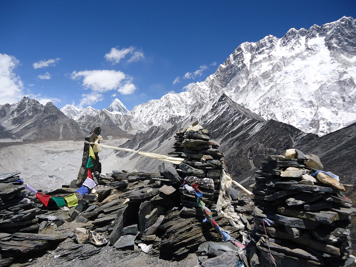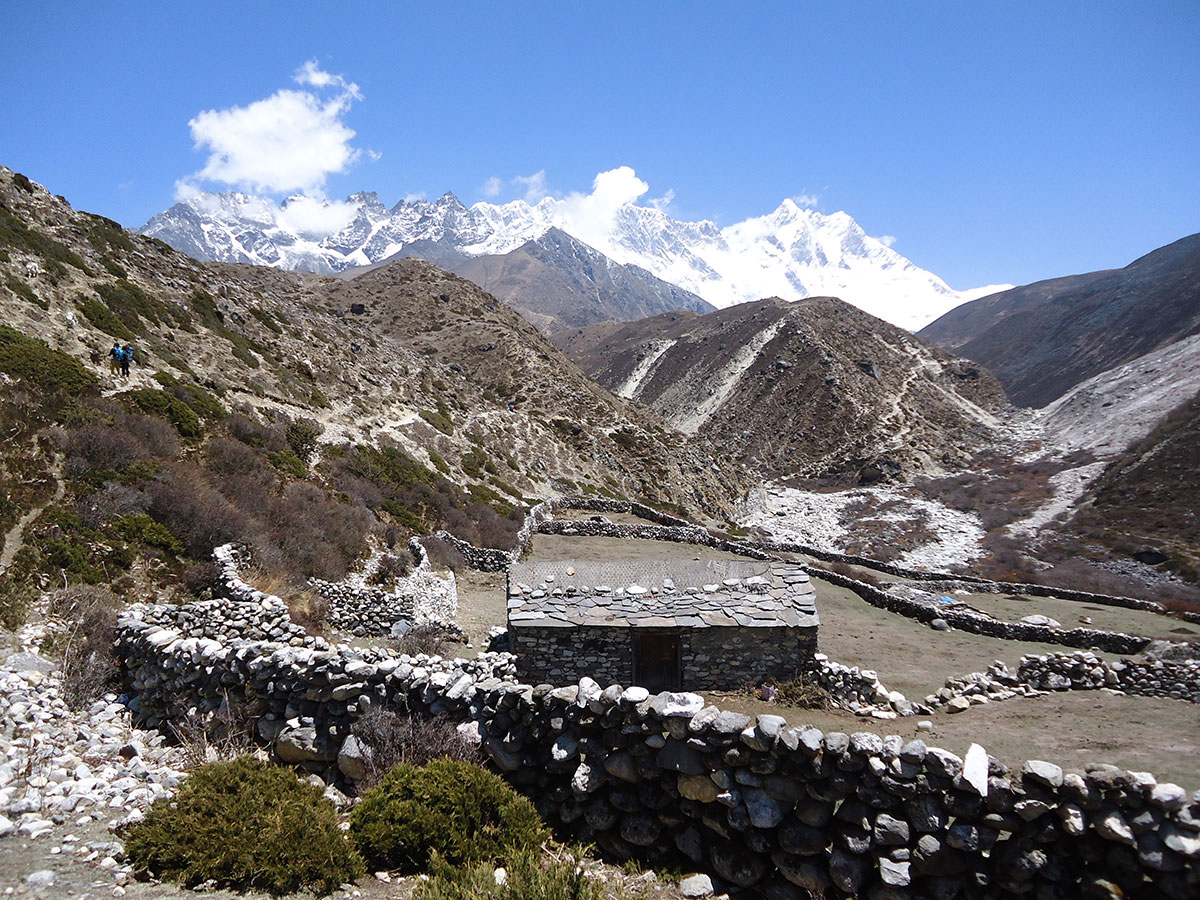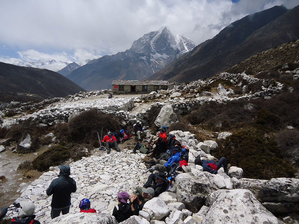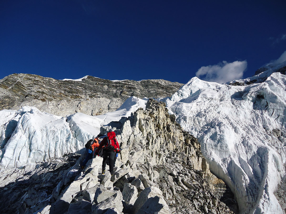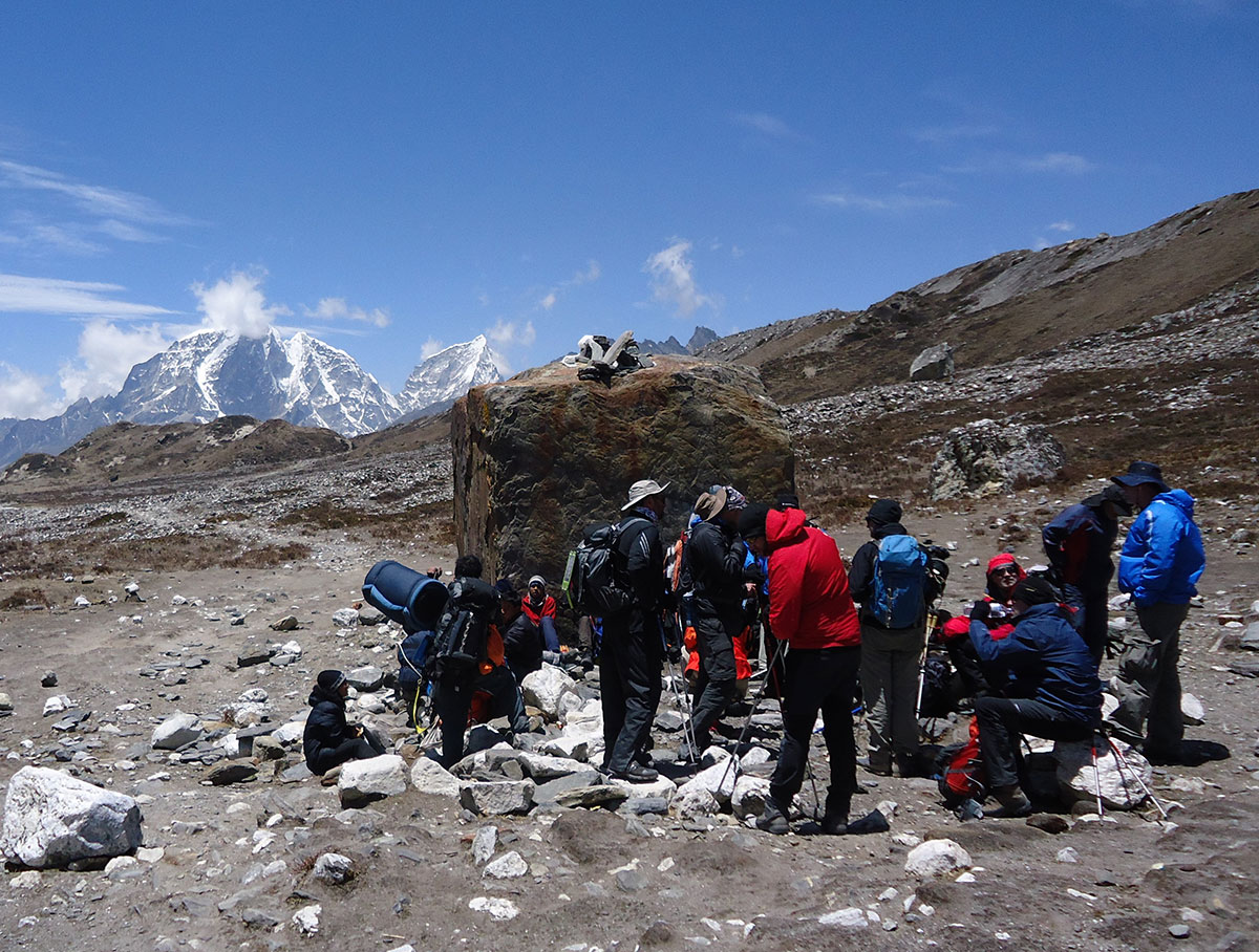 Ujutro spremamo ruksake i nakon doručka napuštamo Chukhung. Na izlazu iz sela prelazimo potok sa kamena na kamen. Penjemo se uz strmu padinu i izlazimo na prilično oštar i dug greben. Na najvišoj tački grebena pravimo prvu pauzu za odmor. Sa ovog mjesta pruža se odličan pogled prema sjeveru na Lhotse glečer i impresivni masiv Nuptse – Lhotse a prema jugu na Ama Dablam glečer i vrh Ama Dablam. Silazimo s grebena na prostrani plato sa nekoliko presahli lokvi vode. Drugu pauzu za odmor pravimo kod stjenovite gromade na osami. Stijena je oblika kocke i kao da je neko bacio iz zraka u ovu zabačenu pustoši. Po toalet papirima razbacanim oko stijene vidimo da je ovo pogodno mjesto za vršenje velike nužde jer na vjetrometini dobro dođe bilo kakav zaklon.