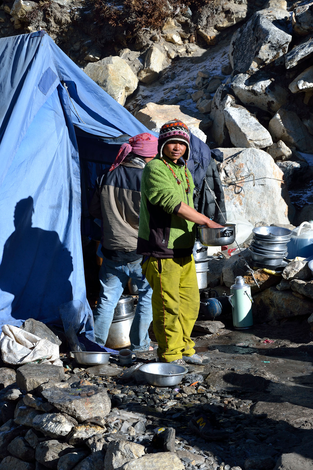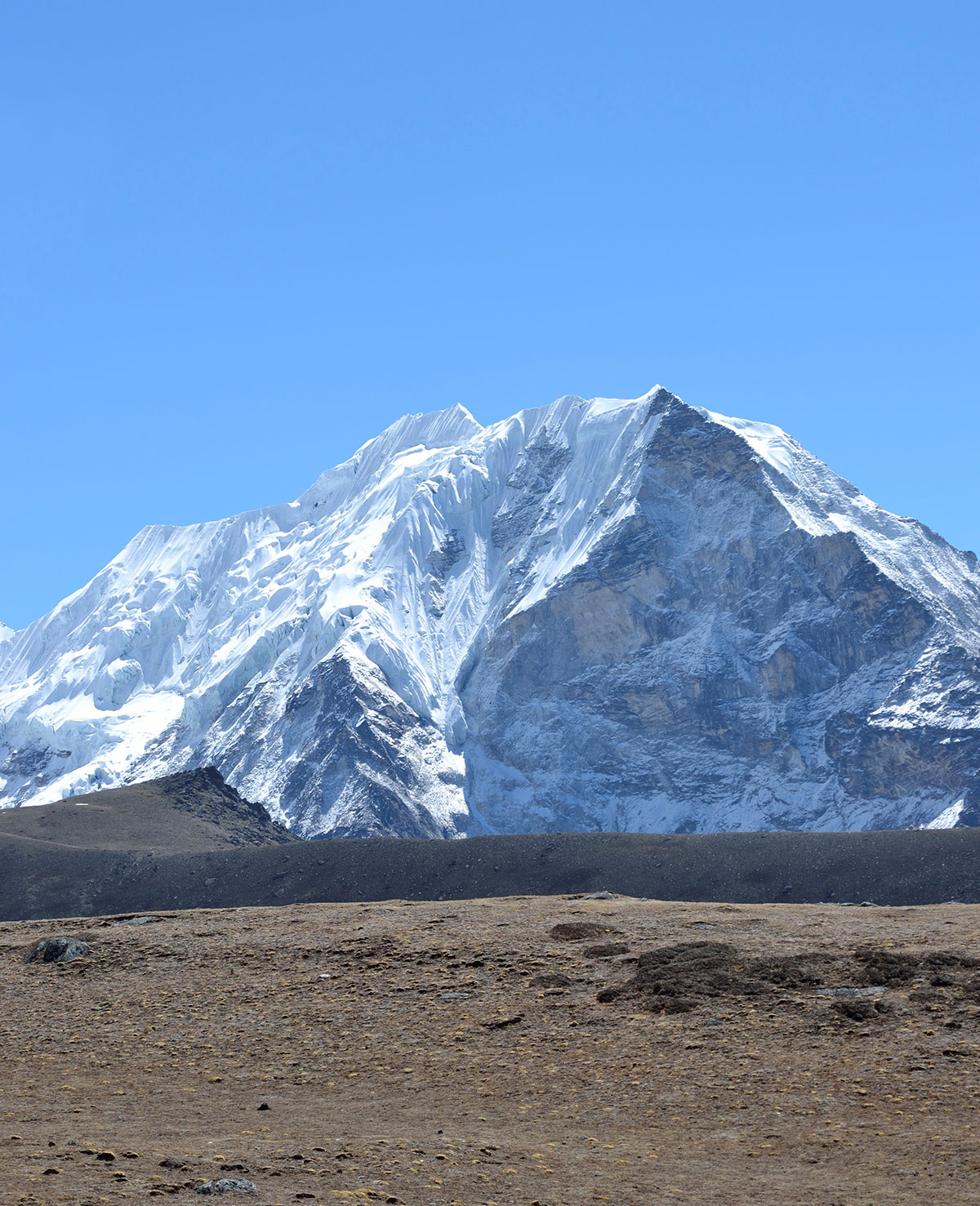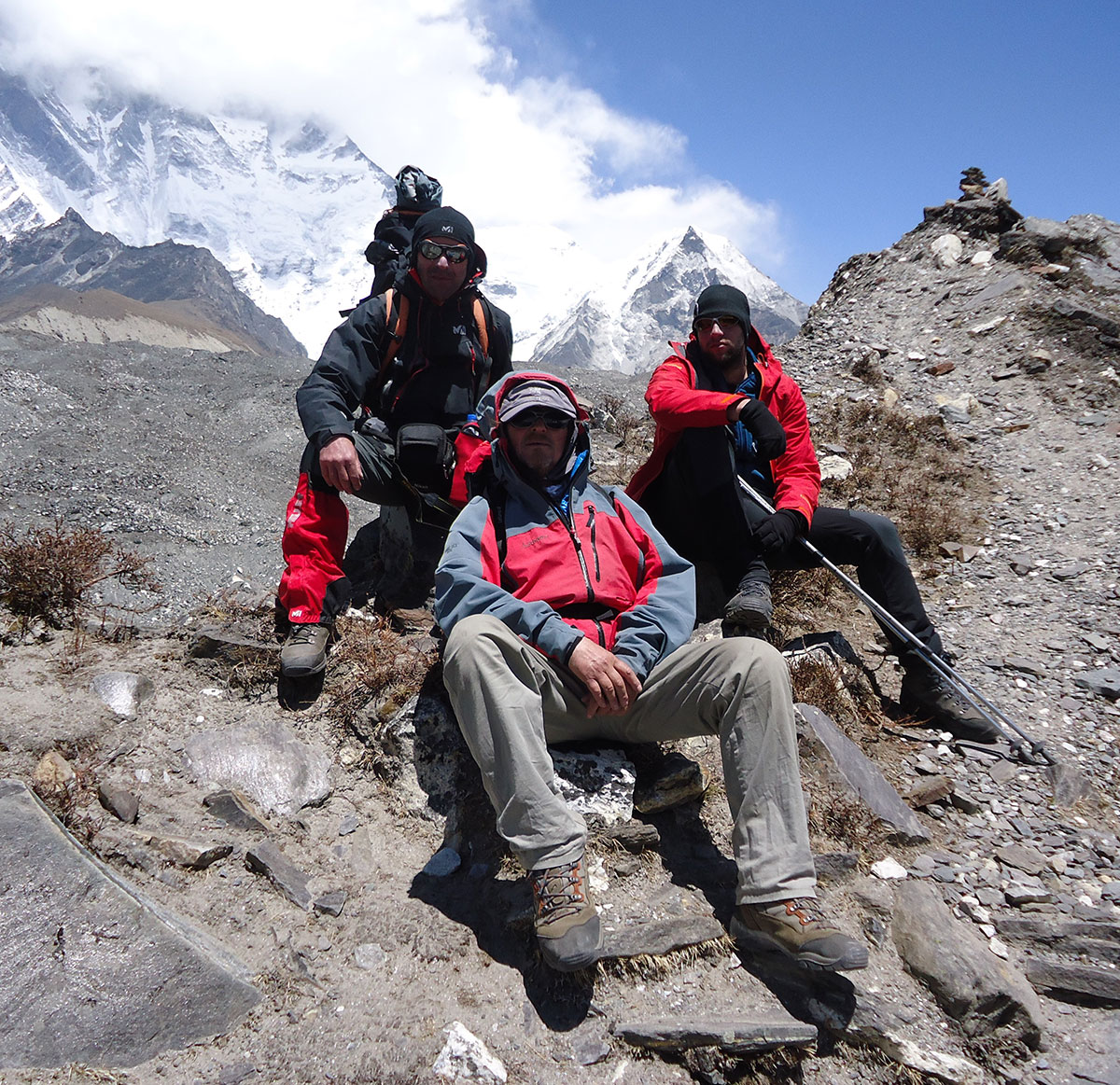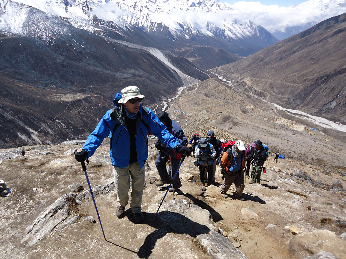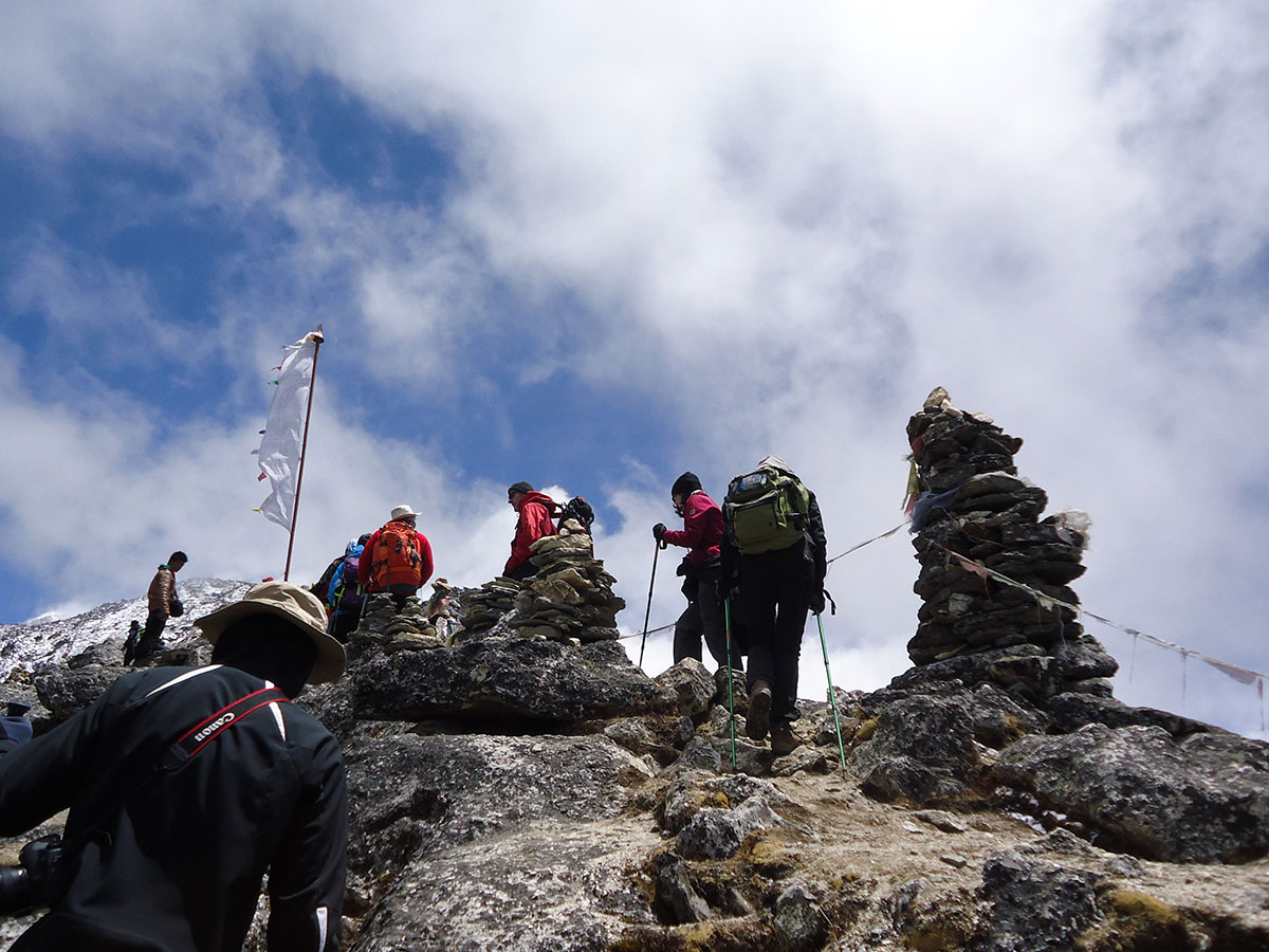 Ujutro spremamo ruksake i nakon doručka napuštamo Chukhung. Na izlazu iz sela prelazimo potok sa kamena na kamen. Penjemo se uz strmu padinu i izlazimo na prilično oštar i dug greben. Na najvišoj tački grebena pravimo prvu pauzu za odmor. Sa ovog mjesta pruža se odličan pogled prema sjeveru na Lhotse glečer i impresivni masiv Nuptse – Lhotse a prema jugu na Ama Dablam glečer i vrh Ama Dablam. Silazimo s grebena na prostrani plato sa nekoliko presahli lokvi vode. Drugu pauzu za odmor pravimo kod stjenovite gromade na osami. Stijena je oblika kocke i kao da je neko bacio iz zraka u ovu zabačenu pustoši. Po toalet papirima razbacanim oko stijene vidimo da je ovo pogodno mjesto za vršenje velike nužde jer na vjetrometini dobro dođe bilo kakav zaklon.