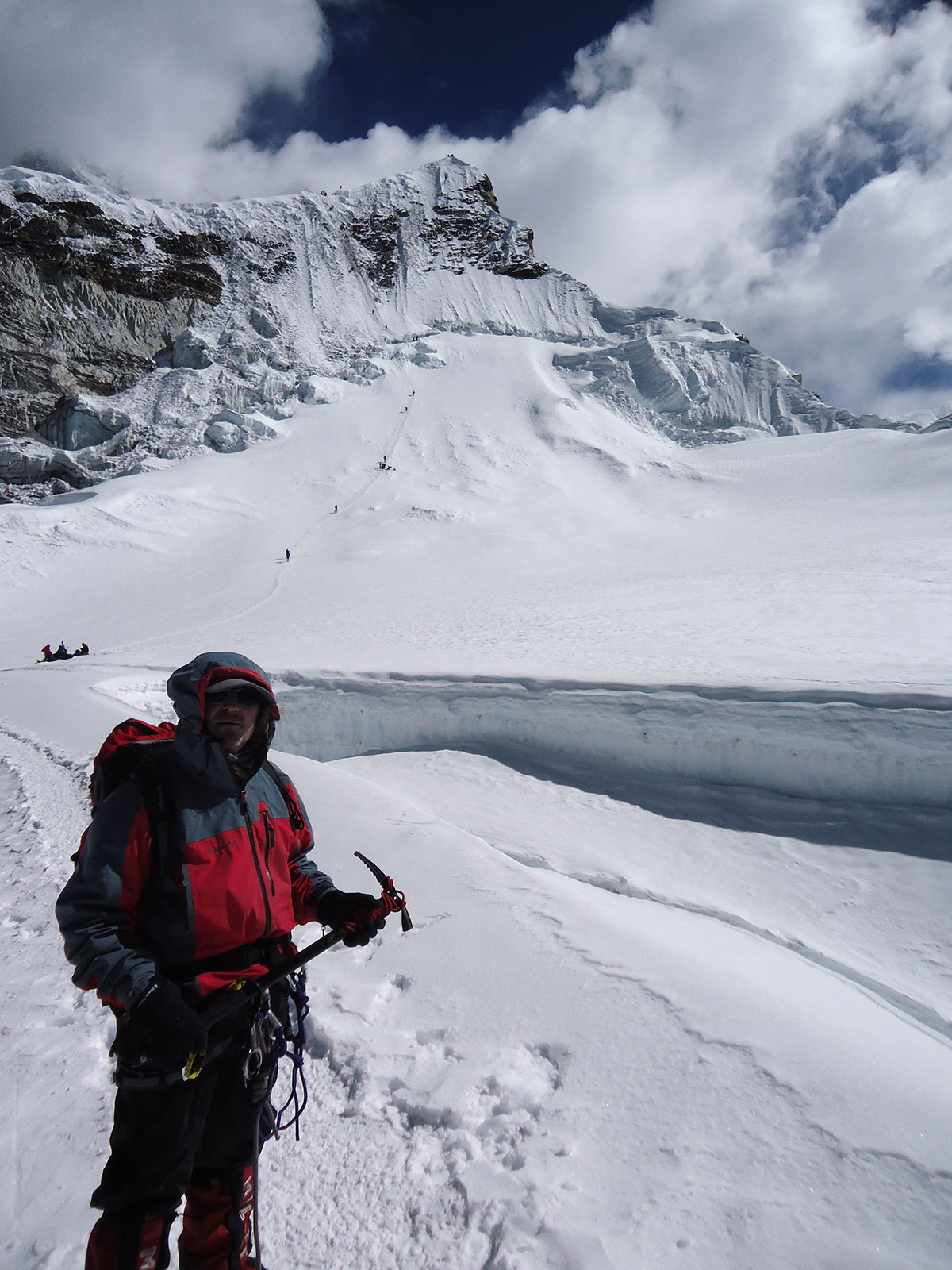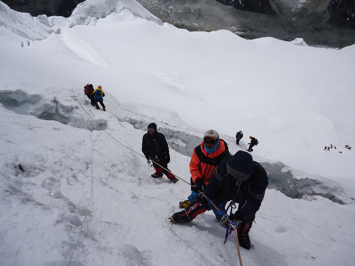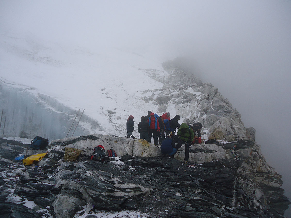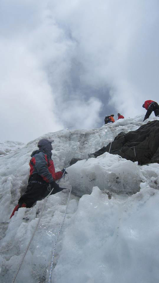 Stižemo u podnožje strme ledene padine visoke više od 150 metra, nagiba oko 60%. Vadimo žimare i kačimo se na fiksna užad. Sporo napredujemo, velika je gužva, dok se jedni penju drugi silaze sa vrha. Prilikom mimoilaženja nastaju problemi. Na pojedinim mjestima ledene padine je nekoliko kaskada koje sa teškoćom savlađujemo. Dok se penjemo vremenski uvjeti se pogoršavaju. Iznad vrha počela se navlačiti magla i tamni oblaci. Vjetar je pojačao svoju snagu i naglo je zahladnilo. Dragan, vođa uspona javlja nam da prekinemo sa usponom i počnemo silaziti natrag u dolinu. U isto vrijeme do nas stiže informacija da su četiri člana naše ekspedicije na vrhu. U vrijeme prekida uspona većina penjača je bila na visini od 6000 do 6100 m/nv.