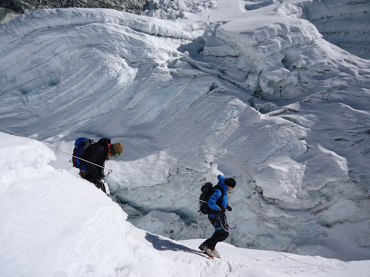 Stižemo na Crampon Point (5600 m/nv) gdje pravimo dužu pauzu za odmor. Osvježavamo se čajem iz termosica i zaslađujemo čokoladom. Stavljamo dereze na cipele. Štapove za hodanje koje smo koristili na usponu po suhom kamenjaru ostavljamo kod jedne stijene a dalje ćemo koristiti cepine. Navezujemo se na vodičko uže i krećemo preko glečera. Kako se penjemo u visinu sve je više ledenih pukotina, ima ih na sve strane. Veće pukotine prelazimo po aluminijskim ljestvama položene iznad otvora a one manje zaobilazimo ili preskačemo. Sherpa Dunga vješto nas vodi između dubokih pukotina i velikih ledenih odlomaka. Vodi brigu o svakom članu naveze. Okretan je i suvereno vlada terenom u svakom trenutku.