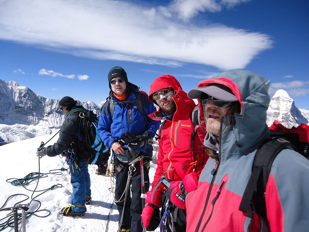 Završni uspon na Island Peak donosi sve što se očekuje od Himalaja: savlađivanje visinske razlike veće od 1000 metara kroz stjenovite odsjeke, penjanje u navezi kroz glečer, uspon u smrznutom snijegu i ledu nagiba 60%, penjanje uz oštri greben do vrha i sam vrh na kome tri čovjeka već prave gužvu.
