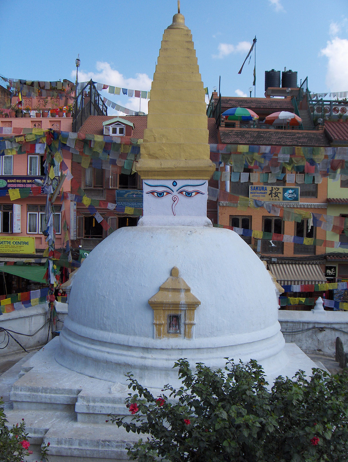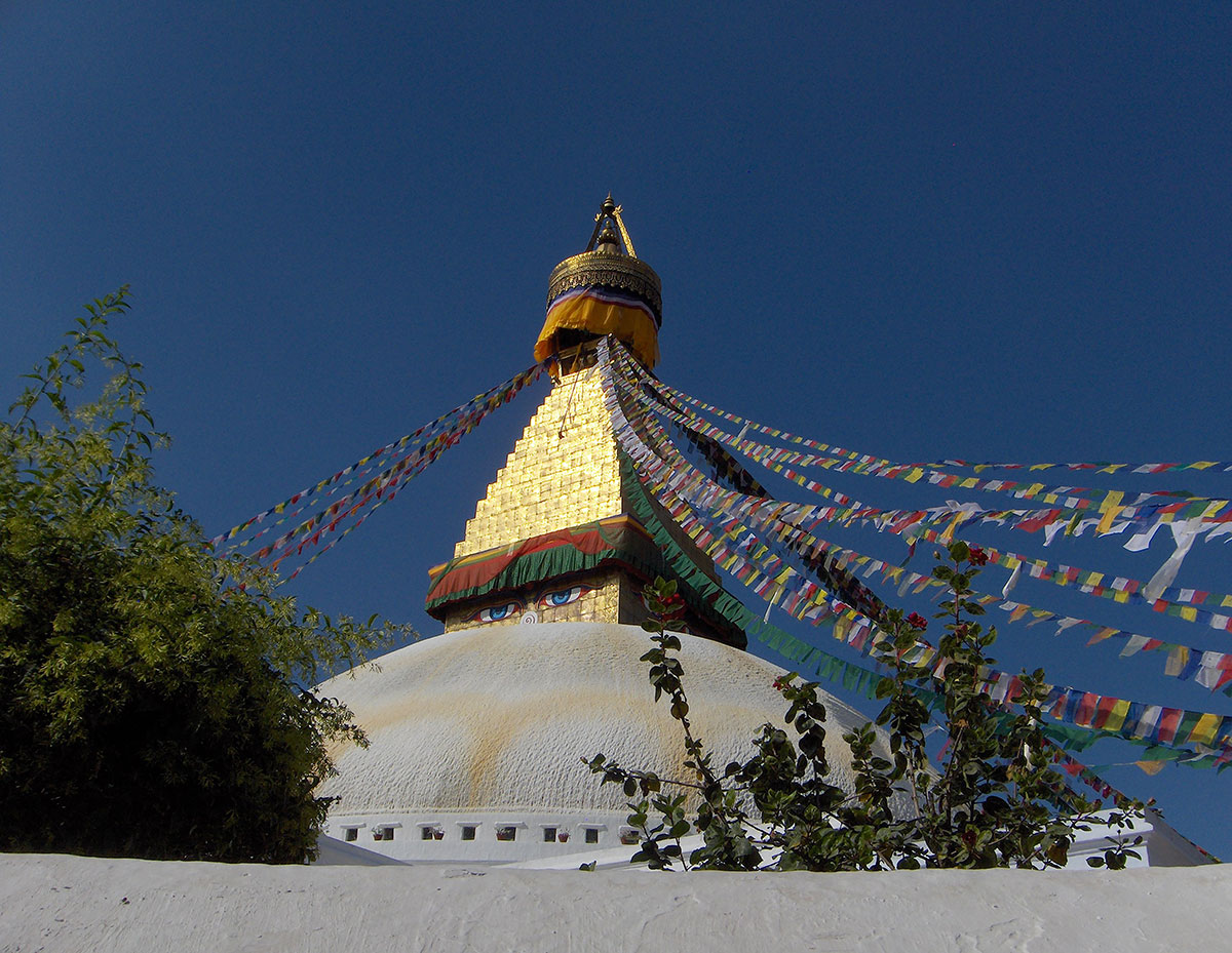Kasno poslijepodne krećemo za Boudhanath Temple. To je najveći Budistički hram na svijetu posvećen Sidarti Gautamu osnivaču budizma. Hram se nalazi oko 11 km od centra grada. Jedna je od najpopularnijih turističkih destinacija. I ovaj hram je upisan na UNESCO-ov popis Svjetske kulturne baštine (od 1979. god.). Na trgu oko hrama su smještene mnoge prodavnice suvenira, likovne galerije, čajdžinice i restorani. U jednoj od galerija koju smo posjetili vidjeli smo mlade likovne umjetnike kako s velikom strpljivošću i preciznošću stvaraju čudesne slike inspirisane religioznim i mističnim motivima iz života Bude. Na slikama živih boja, neki od detalja nerijetko su rađeni tečnim 24 karatnim zlatom. Ovdje kupujemo suvenire i poklone za našu obitelj i prijatelje. Na kraju dana odlazimo u restoran ”Helenas” na posljednju večeru.