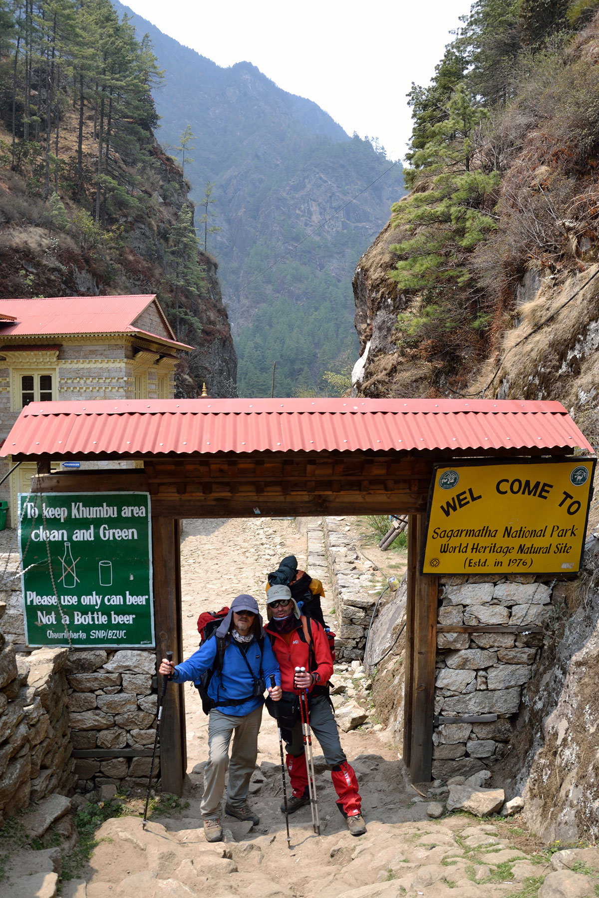 U zraku se osjeća žestok miris mokraće i izmeta koje iza sebe ostavljaju natovarene životinje. Srećom zemlja je još vlažna od kiše i nema prašine. Kombinacija smrada i prašine bila bi ubitačna! Put vodi strmim padinama klanca i prilikom mimoilaženja sa natovarenim životinjma pazimo da se od nas ne oćešu i završimo u provaliju. Oko podneva se navlače oblaci i magla. Na ulazu u “Sagarmatha National Park” počela je da pada kiša. Sklanjamo se u obližnji lođ u kojem ručamo. Po informaciji našeg vođe Dragana današnji dan je jedan od napornijih do baznog logora, tako da nam je ova pauza dobro došla da prikupimo snagu. Nakon puna tri sata kiša je stala i nastavljamo sa pješačenjem. Prelazimo preko šest visećih mostova od kojih je posljednji ”Larja Bridge” najduži i najviši. Most se nalazi poviše sastavaka rijeka Bhote Koshi i Dudh Koshi i povezuje dvije strme obale sa liticama iznad dubokog ponora. Po prelasku mosta na desnu obalu započinje dug uspon uz bezbroj serpentina. Na pola puta do Namche Bazara sa jedne isturene stijene na kojoj je vidkovac po prvi put smo ugledali najviši vrh na svijetu – Mount Everest (8848 m) okružen susjednim vrhovima Nuptse (7861 m) i Lhotce (8516 m). U Namche Bazar stižemo u predvečerje. Smjestili smo se i zanoćili u dva lodža ”Tibet” i ”Kala Patthar”. U Namche Bazaru ostajemo dva dana radi aklimatizacije.