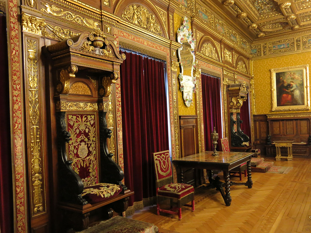 Dvorac je izgrađen od drveta, kamena, cigle i mramora, a u njemu se nalazi više od 160 soba. Iako je većinom građen u stilu njemačke renesanse, na njemu se nalaze i brojni elementi koji pripadaju talijanskoj renesansi, gotici i baroku. Dvorac je okružen sa sedam terasa koje su bogato ukrašene raznim kipovima, bunarima od kamena i ukrasnim mramornim vazama. Ovaj raskošni kraljevski dvorac zvanično je otvoren 1883. godine.
