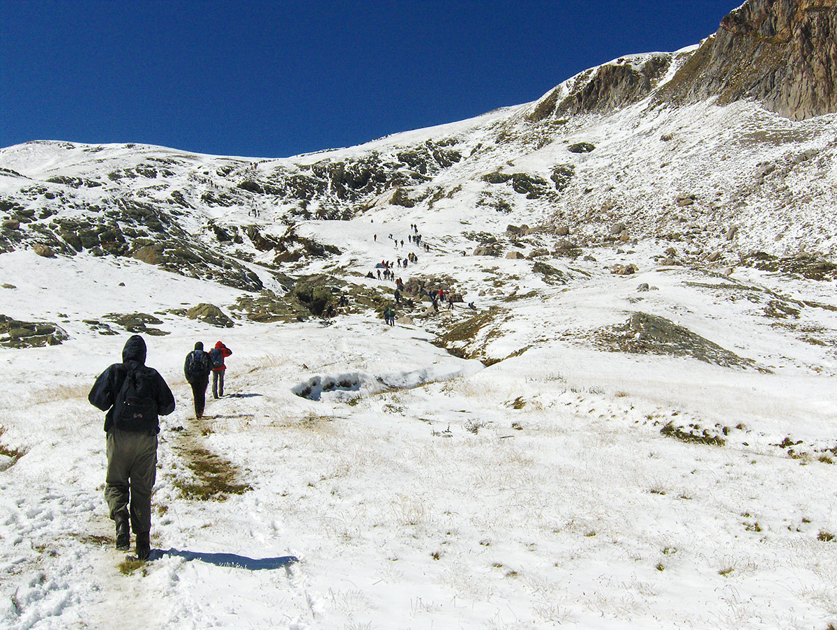 Od karaule smo krenuli u 09:00 sati ujutru. U koloni je bilo više stotina učesnika pohoda. Kolonu su predvodili planinarski vodiči PSD “Korab“ Skopje uz pratnju pogranične policije Republike Makedonije kao fizičko obezbjeđenje učesnika pohoda. Duž staze na ključnim mjestima bili su postavljeni šatori ekipe Prve pomoći i Gorske službe spašavanja. Organizator je ograničio vrijeme uspona do 14:00 sati a nakon toga pristup na vrh je zabranjen. Zbog toga je većina učesnika pohoda išla malo bržim hodom od uobičajenog uz kratke pauze za predah. U početku uspon od karaule vodi pješačkom stazom kroz šumu Štirovički čam sve do izlaska na pašnjake Belandže (oko 1700 m/nv) gdje je smješteno veliko bačilo (katun). Dalje uspon vodi travnatim padinama na greben (oko 2000 m/nv). Cijelo vrijeme je puhao hladan i jak vjetar. Sa grebena po prvi put ukazuju se mnogobrojni vrhovi na kojima je preko noći pao prvi snijeg. Posljednja dva moja uspona na Golem Korab (2005. i 2006. god.) bila su u ljetnom ambijentu i sada je snijeg dao planini poseban ugođaj u kojem smo uživali.
