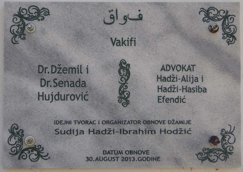 Džamija je zapaljena 14. marta 1993. godine od strane vojske Republike Srpske, za vrijeme rata u Bosni i Hercegovini. Obnova džamije uslijedila je nakon povratka Bošnjaka u okolna mjesta i administrativnih priprema koje je provela Islamska zajednica u BiH 2009. godine. Džamija je ponovo izgrađena na istom mjestu, u svojoj izvornoj formi i autentičnim građevinskim materijalom. Obnovu džamije su financirali vakifi: dr Džemil i dr Senada Hujdurović, te advokat Hadži-Alija i Hadži-Hasiba Efendić. Idejni tvorac i organizator obnove džamije je sudija hadži-Ibrahim Hodžić. Na vanjskom stražnjem zidu džamije postavljena je spomen-ploča sa imenima vakifa.
