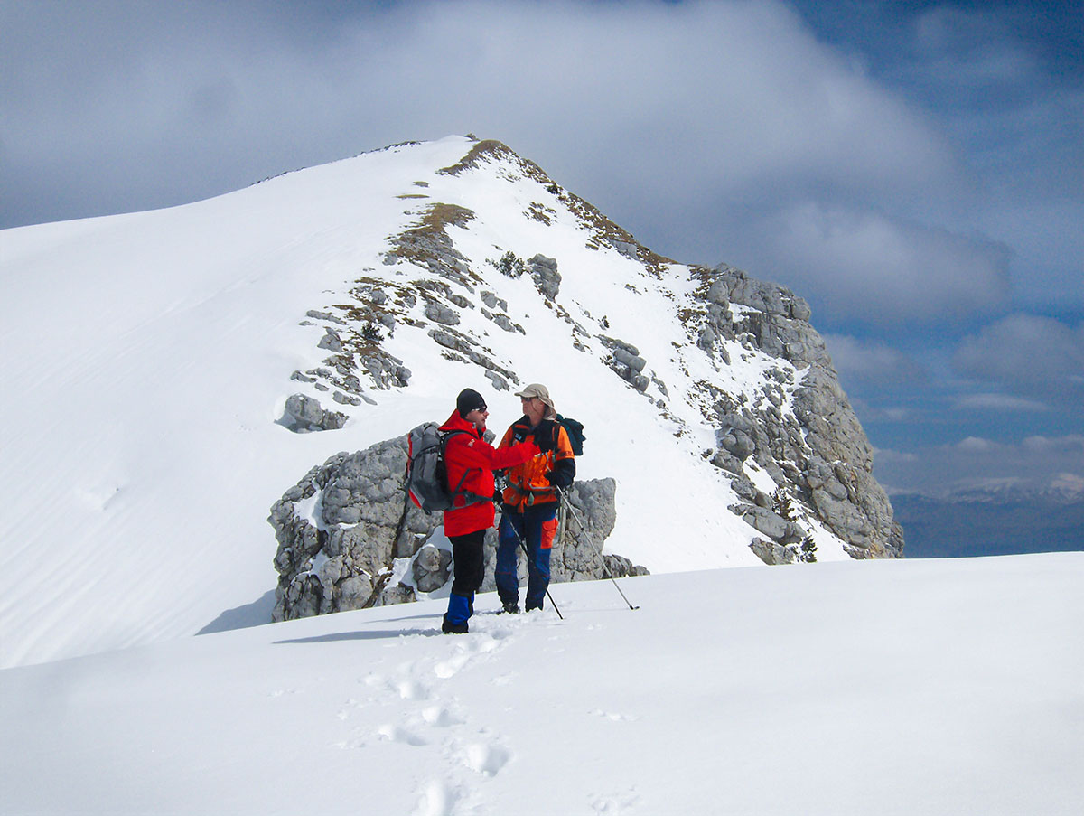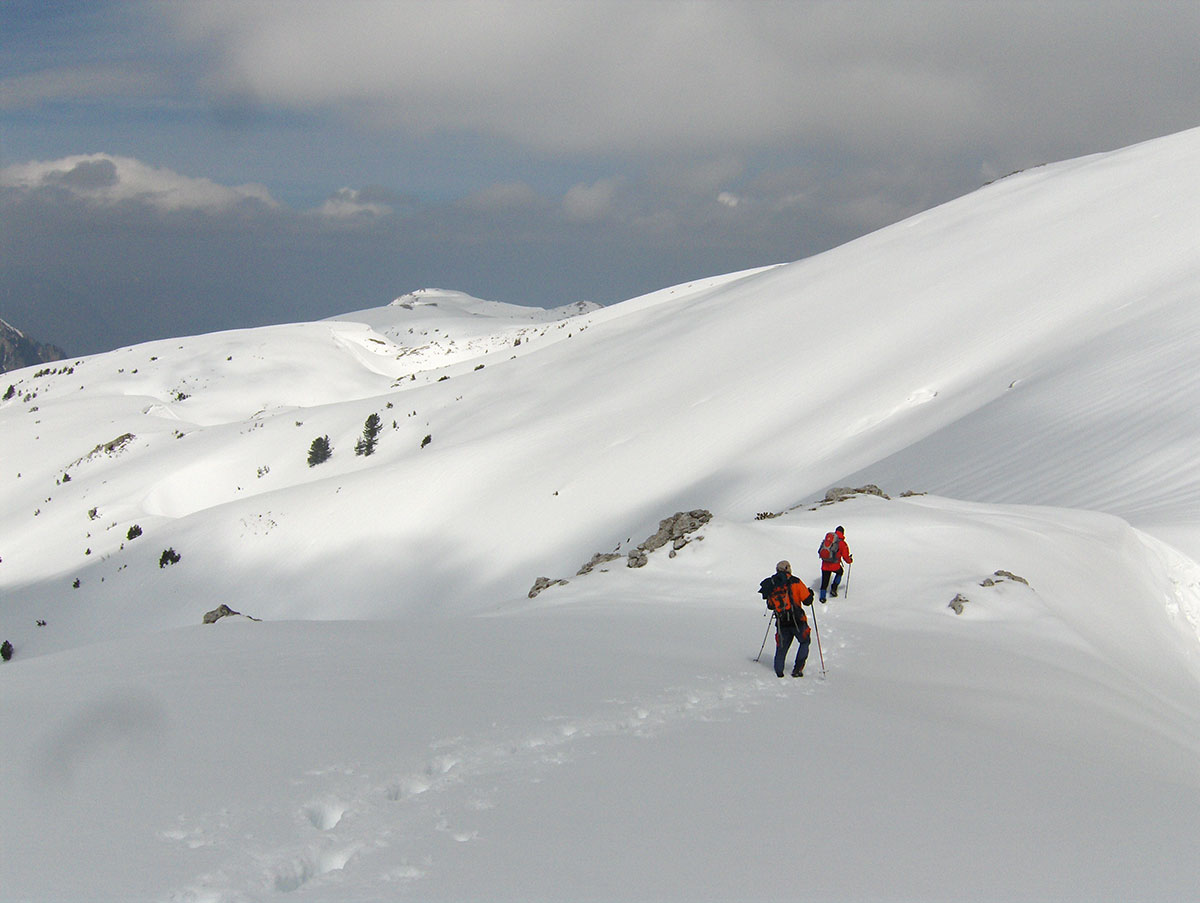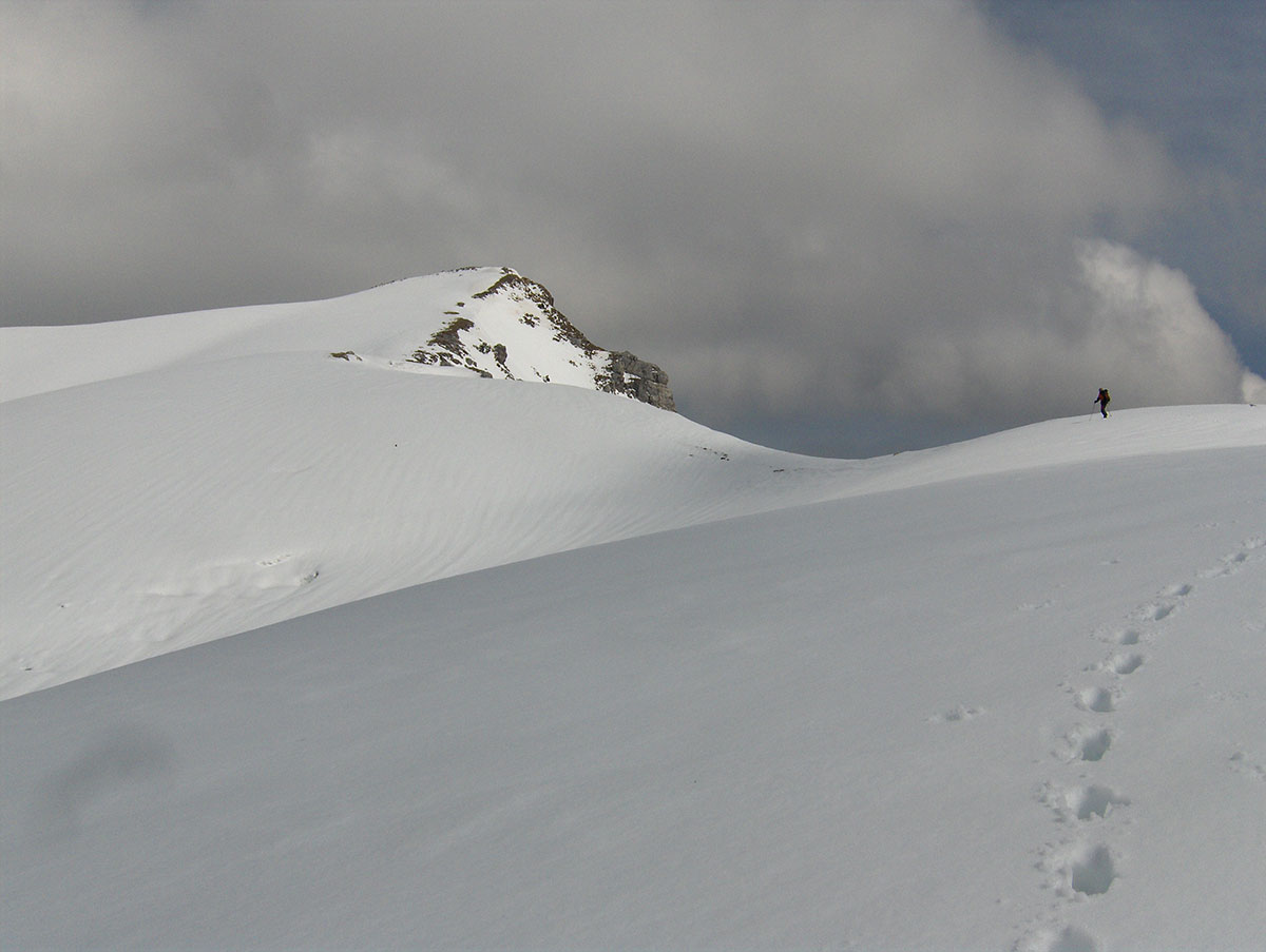 Nakon toga krećemo prema vrhovima Konjičke Bjelašnice. Padine kojima smo se penjali bile su pod debelim nametom snijega i potpuno su prekrile klekovinu. Zima je bila duga i hladna sa puno snijega. Prvi vrh na koji smo danas pristupili bio je Kruna (1914 m). Na ovom vrhu smo se kratko zadržali i nakon fotografisanja penjemo se prema Velikoj Kapi. Krećemo se grebenom koji povezuje ova dva vrha i ne prebližavamo se njegovom rubu zbog snježnih streha koje se mogu obrušiti ako se opterete.