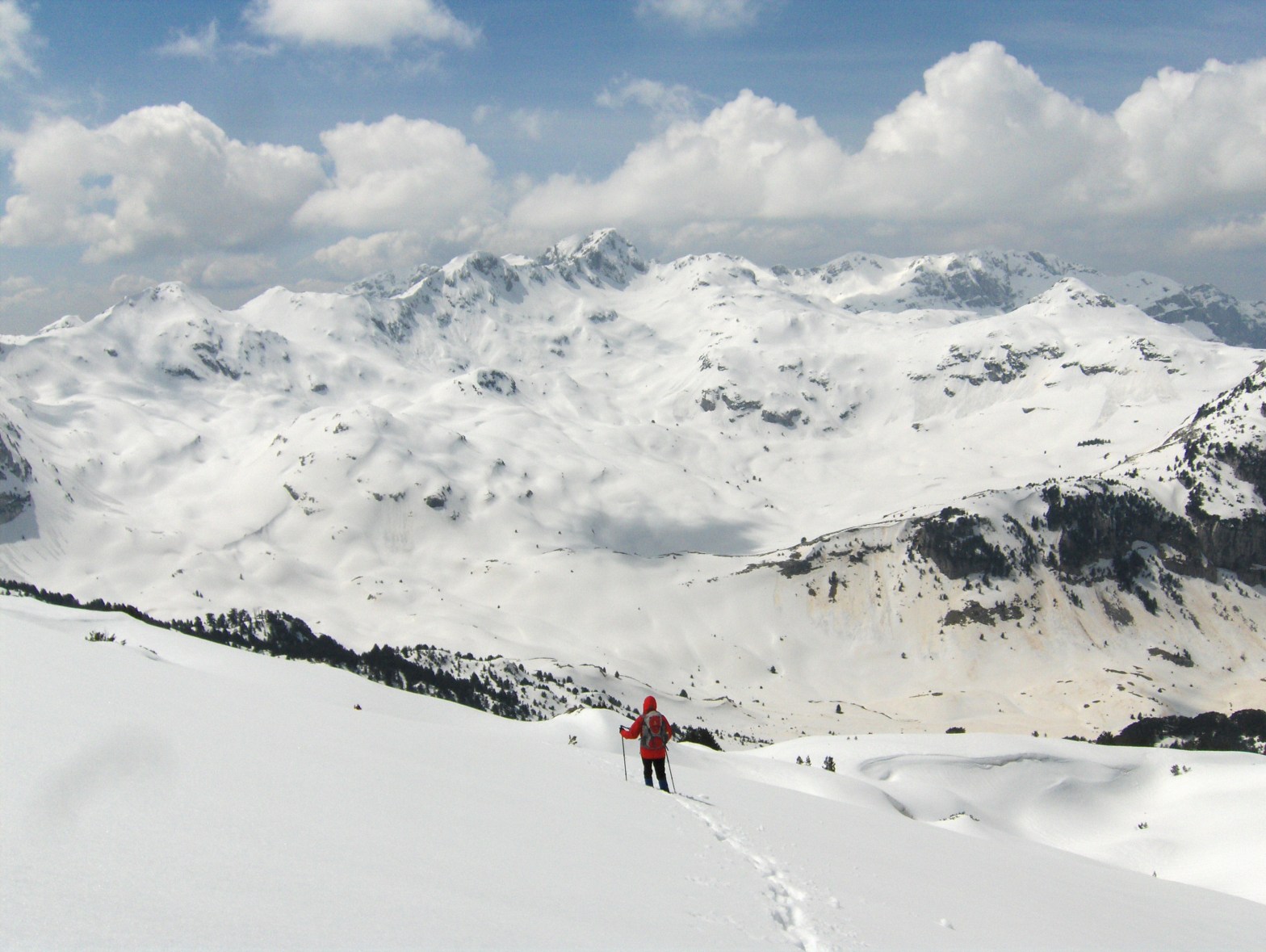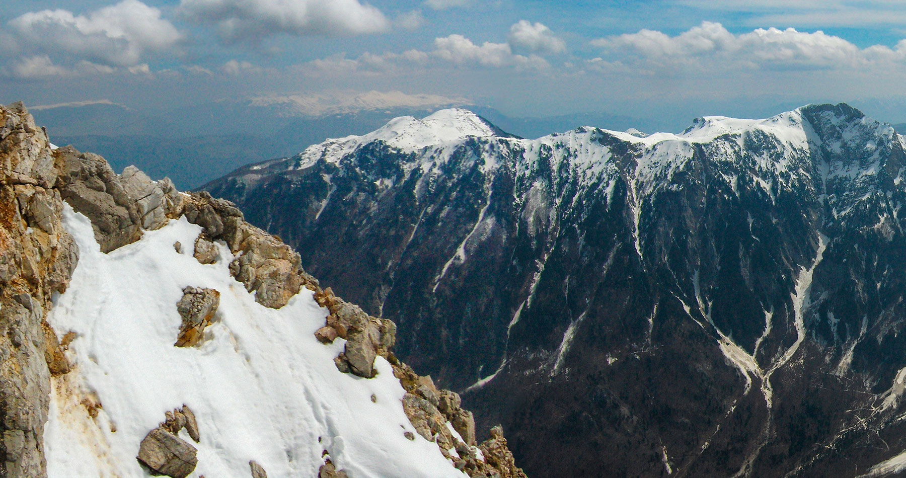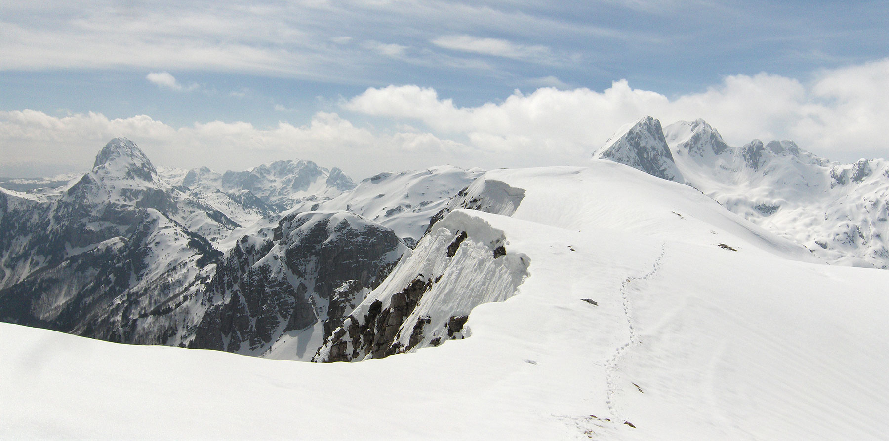 Nakon toga krećemo prema vrhovima Konjičke Bjelašnice. Padine kojima smo se penjali bile su pod debelim nametom snijega i potpuno su prekrile klekovinu. Zima je bila duga i hladna sa puno snijega. Prvi vrh na koji smo danas pristupili bio je Kruna (1914 m). Na ovom vrhu smo se kratko zadržali i nakon fotografisanja penjemo se prema Velikoj Kapi. Krećemo se grebenom koji povezuje ova dva vrha i ne prebližavamo se njegovom rubu zbog snježnih streha koje se mogu obrušiti ako se opterete.