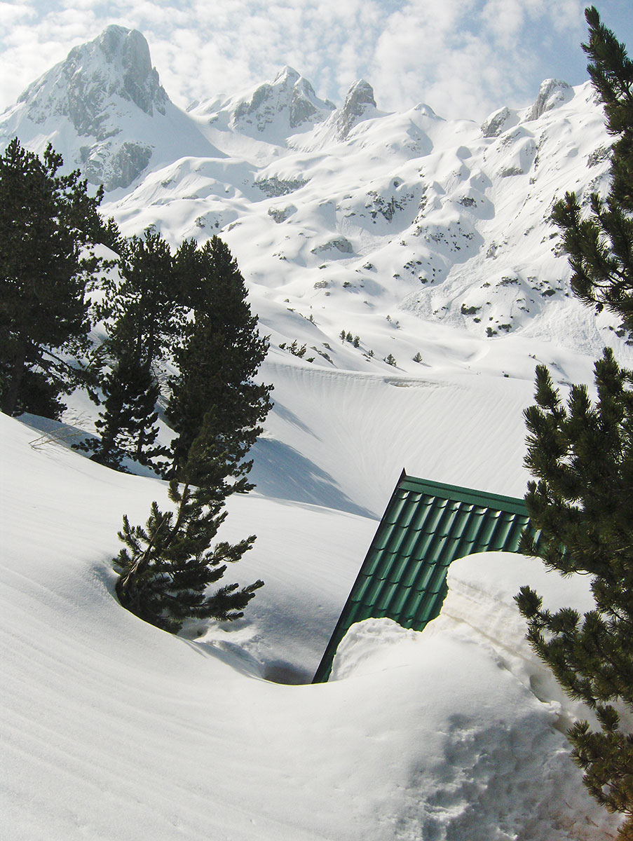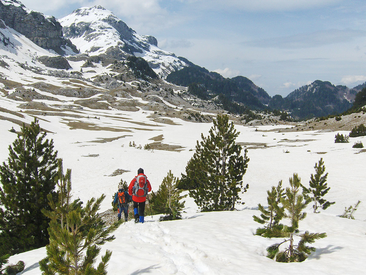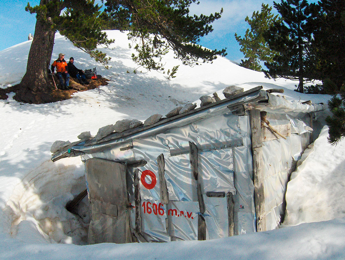 Planirali smo da se u ovom skloništu odmorimo i doručkujemo ali su vrata bila zaključana pa smo se popeli do stare kolibe (1606 m). Vrata od kolibe se ne zaključavaju ali su također bila zatrpana snijegom. Da bi se se snijeg uklonio treba puno vremena (lopata je okačena na vanjskom zidu kolibe) pa smo se sklonili pod krošnjom velike munike gdje je snijeg okopnio. Tu smo odmorili i jeli s pogledom na prelijepe vrhove Otiš i Zelenu glavu.
