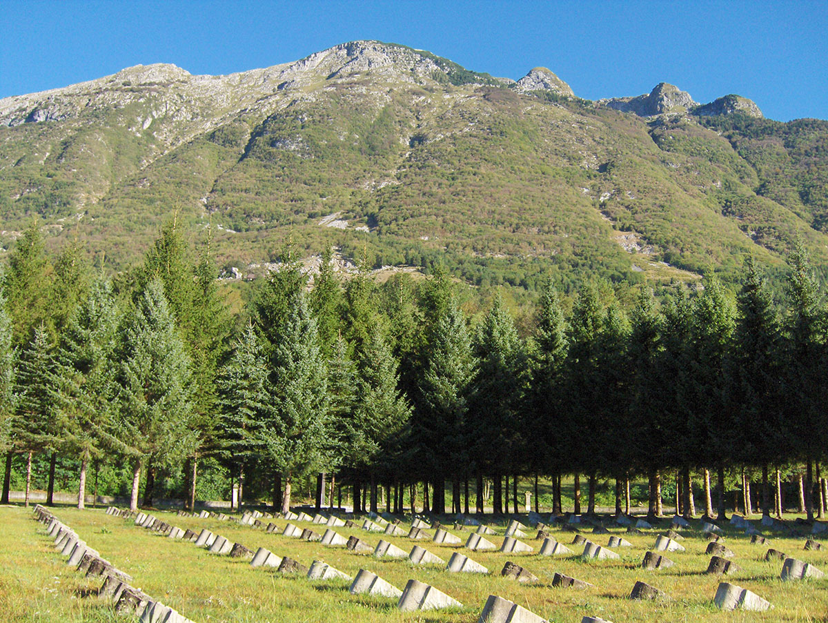 Na raskrižju za Bovec i Log pod Mangartom zaustavljamo se da posjetimo vojničko groblje. U groblju je pokopano 546 austrougarskih vojnika prenesenih nakon Prvog svjetskog rata sa okolnih manjih grobalja. Do 1938. godine ovdje su bili pokopani i italijanski vojnici. Njihovi posmrtni ostaci su preneseni u kosturnicu u Kobaridu. Jedan dio grobova je označen kamenim nadgrobnicima. Sa groblja pruža se pogled na obližnji vrh Svinjak (1653 m) i Rombon / Veliki Vrh (2208 m).