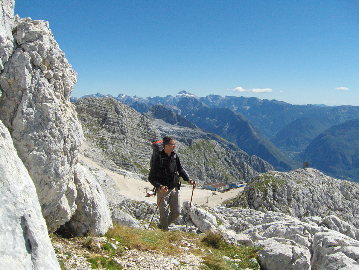 Napuštamo okno u Prestreljeniku i priključujemo se na stazu koja vodi za vrh Visoki Kanin. Od mjesta priključka započinje uspon strmom stazom na sedlo između Hudim vršičem / Monte Lunga (2471 m) i vrhom Osojnic (2371 m). Sa staze se vidi planinski dom u koji trebamo svratiti radi prijave za noćenje. Također i da ostavimo višak stvari jer nas očekuje uspon na najviši vrh Kaninskih planina. Ubrzo stižemo na raskrižje gdje skrećemo lijevo na stazu za planinski dom. Staza koju smo napustili dalje nastavlja za vrh Visoki Kanin / Monte Canin Alto. Silazimo stazom u pravcu doma preko grebena sa dubokim ponorima na obje strane. Hodamo oprezno i držimo se markirane staze da ne bi skrenuli u goli krš i kamenjar po kojem su Kaninske planine poznate. Od okna u Prestreljeniku do planinskog doma stigli smo za 1½ sat hoda.