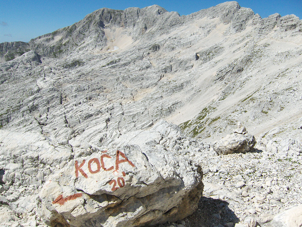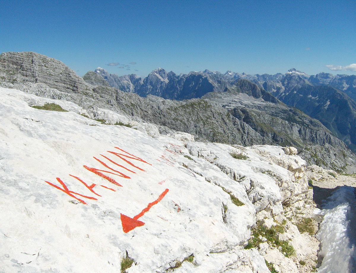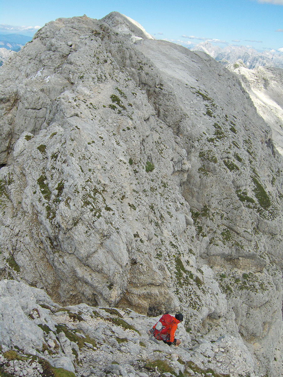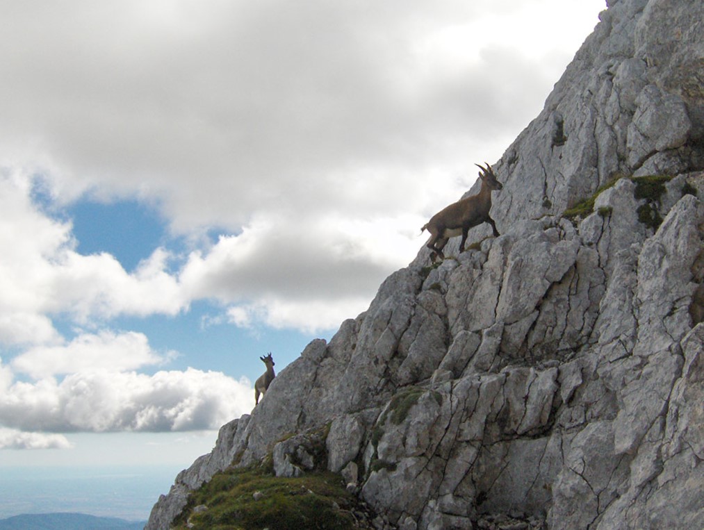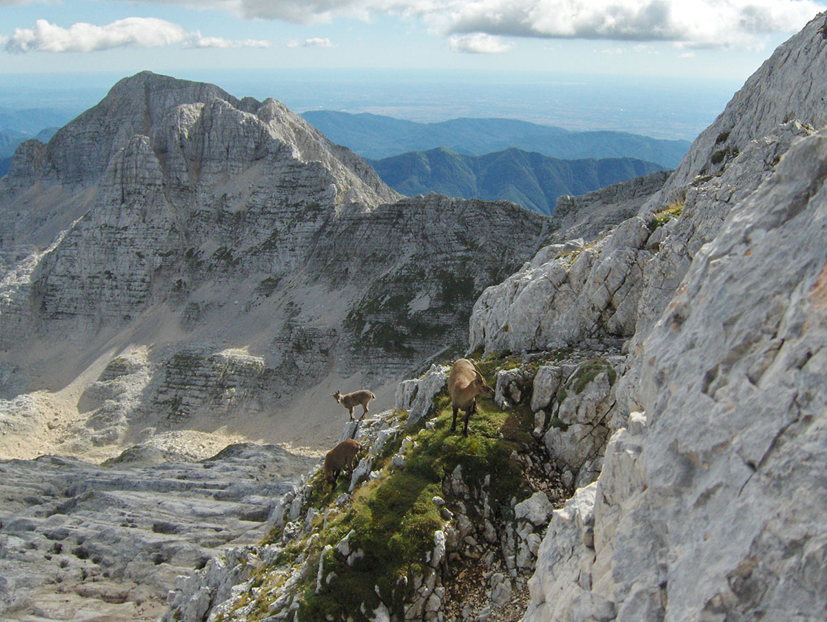Odjednom pojavile su se dvije divokoze s malim jaretom na susjednoj polici. Nisu se preplašile, izgleda da su se navikle na planinare i fotografisali smo ih iz blizine. Uskoro nailaze dvoje Poljaka, kažu vraćaju se s vrha u planinski dom Petra Skalarja u koji će noćiti. Pod samim vrhom sreli smo i jednog Italijana koji je upravo krenuo da siđe ferratom Via Brigata Alpina “Julia“. Ferrata je s italijanske strane vrha i obnovljena je 2009. godine. Penjački uspon je teškoće II stepena po policama sjeverne strane vrha. Pozdravljamo se s njime i kaže da je na vrh pristupio od bivaka “Elio Marussich“ i grebenom preko vrha Krnica / Pico dell Carnizza (2434 m).