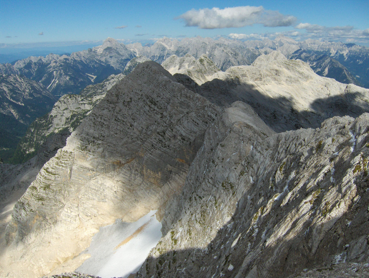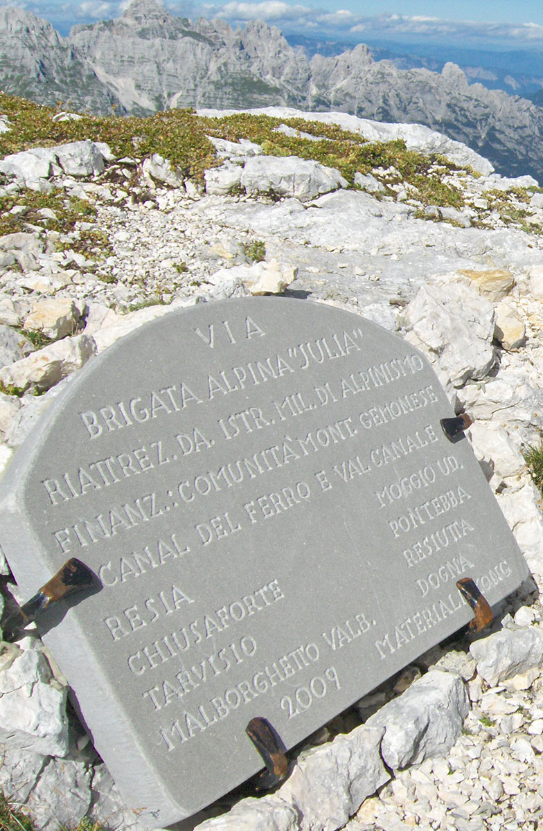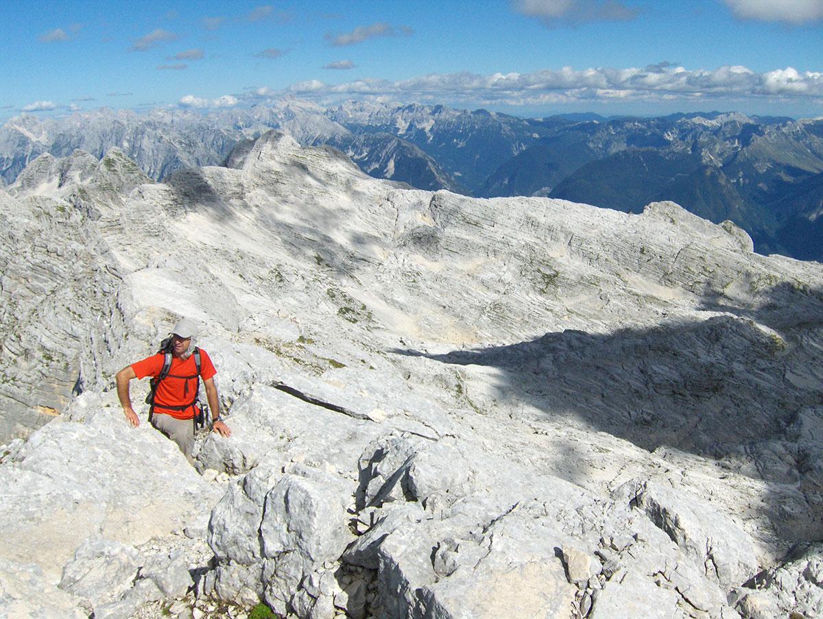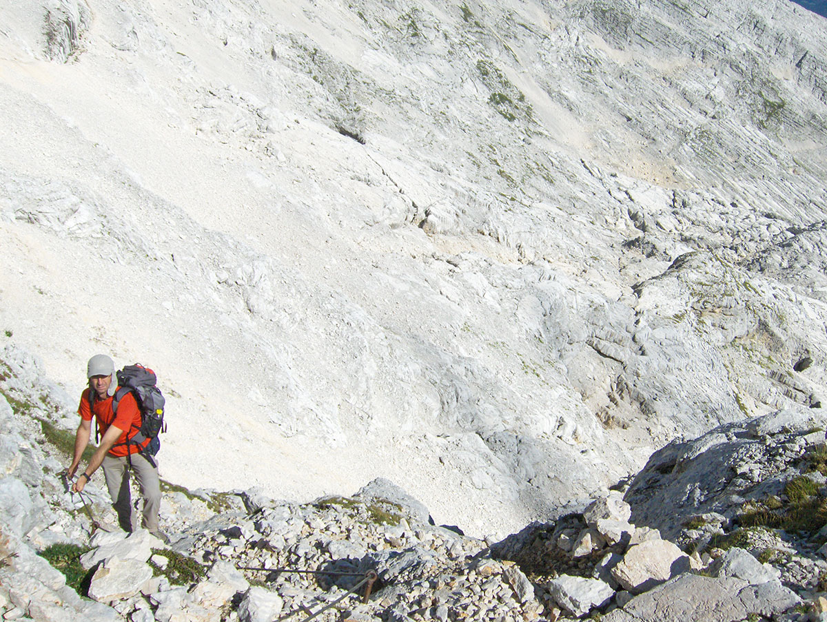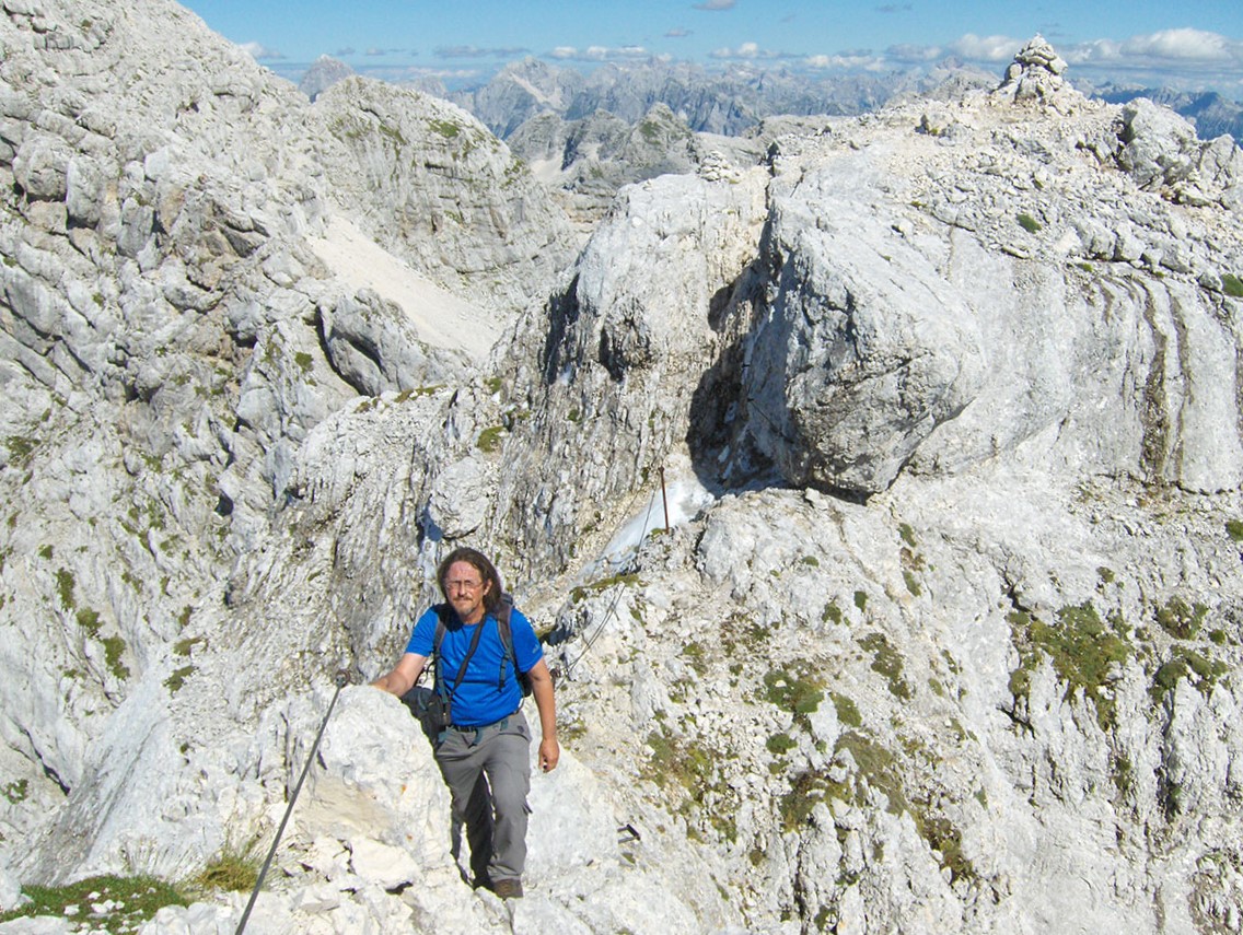 Odjednom pojavile su se dvije divokoze s malim jaretom na susjednoj polici. Nisu se preplašile, izgleda da su se navikle na planinare i fotografisali smo ih iz blizine. Uskoro nailaze dvoje Poljaka, kažu vraćaju se s vrha u planinski dom Petra Skalarja u koji će noćiti. Pod samim vrhom sreli smo i jednog Italijana koji je upravo krenuo da siđe ferratom Via Brigata Alpina “Julia“. Ferrata je s italijanske strane vrha i obnovljena je 2009. godine. Penjački uspon je teškoće II stepena po policama sjeverne strane vrha. Pozdravljamo se s njime i kaže da je na vrh pristupio od bivaka “Elio Marussich“ i grebenom preko vrha Krnica / Pico dell Carnizza (2434 m).