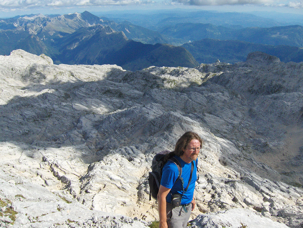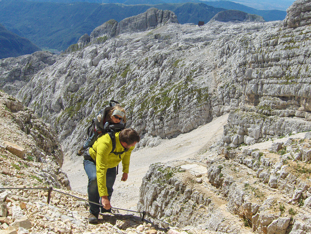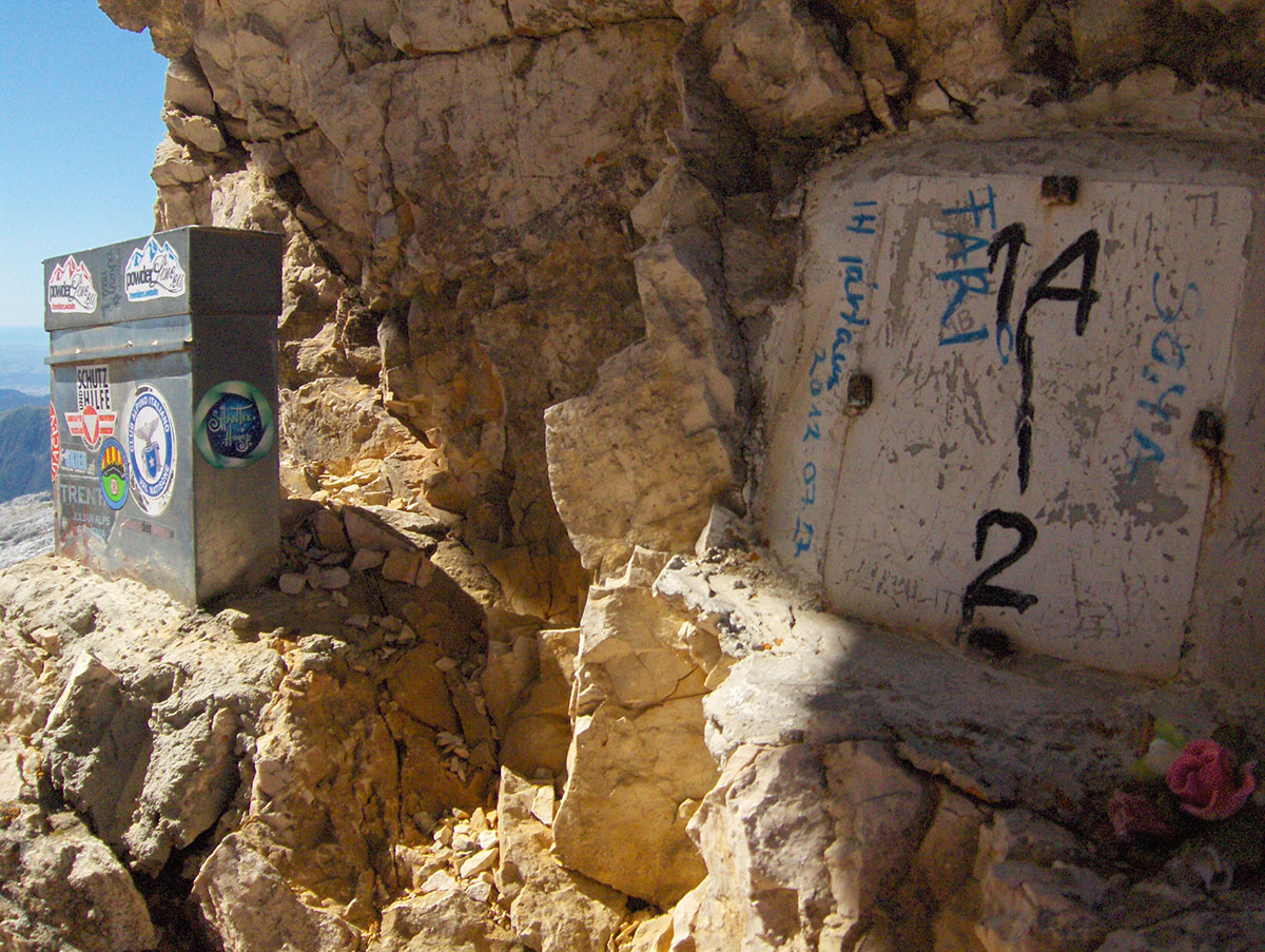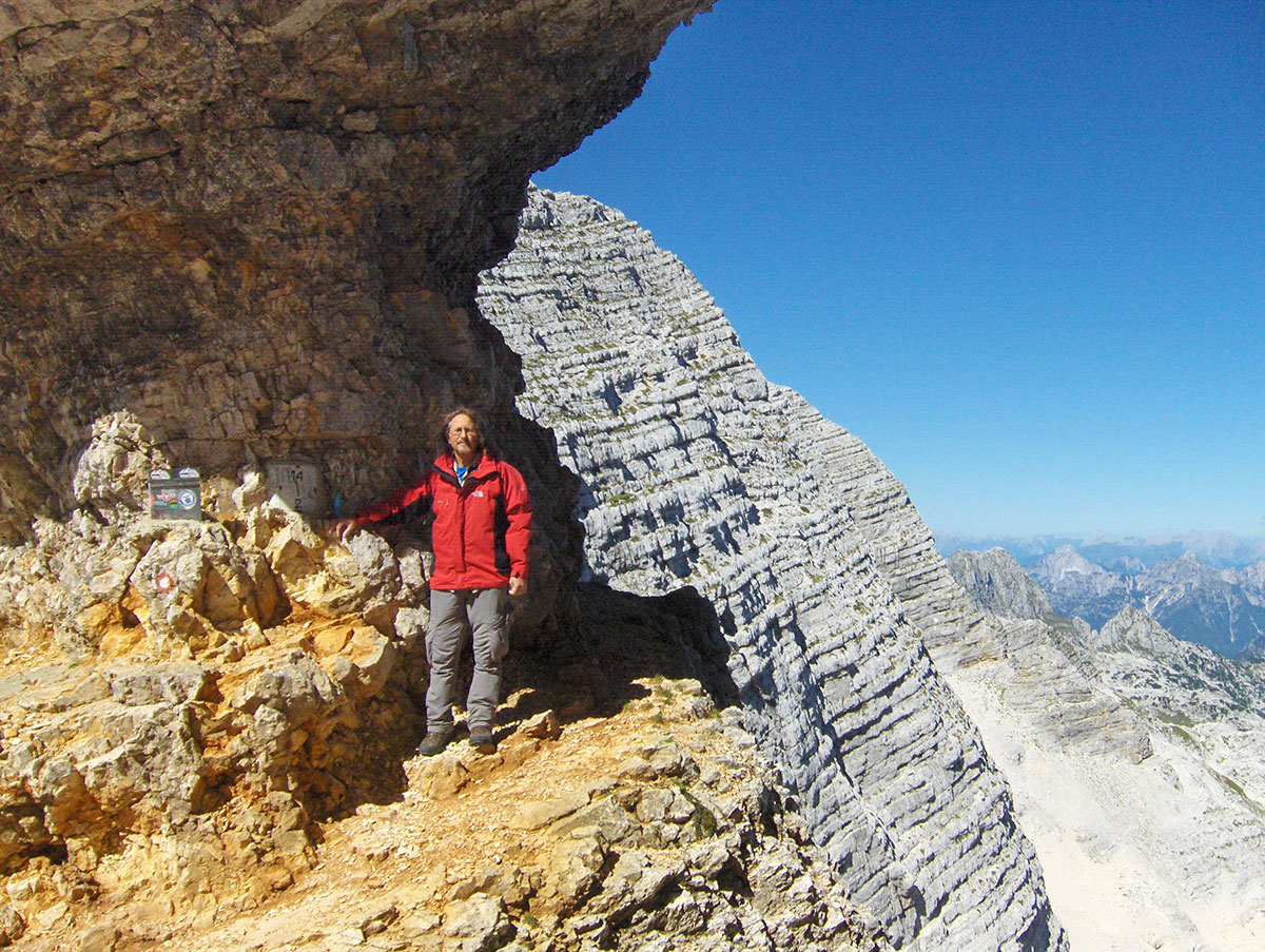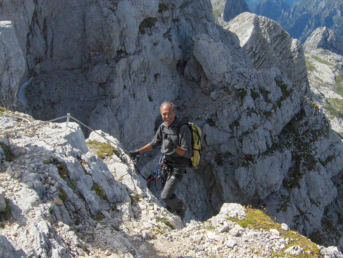 Odjednom pojavile su se dvije divokoze s malim jaretom na susjednoj polici. Nisu se preplašile, izgleda da su se navikle na planinare i fotografisali smo ih iz blizine. Uskoro nailaze dvoje Poljaka, kažu vraćaju se s vrha u planinski dom Petra Skalarja u koji će noćiti. Pod samim vrhom sreli smo i jednog Italijana koji je upravo krenuo da siđe ferratom Via Brigata Alpina “Julia“. Ferrata je s italijanske strane vrha i obnovljena je 2009. godine. Penjački uspon je teškoće II stepena po policama sjeverne strane vrha. Pozdravljamo se s njime i kaže da je na vrh pristupio od bivaka “Elio Marussich“ i grebenom preko vrha Krnica / Pico dell Carnizza (2434 m).