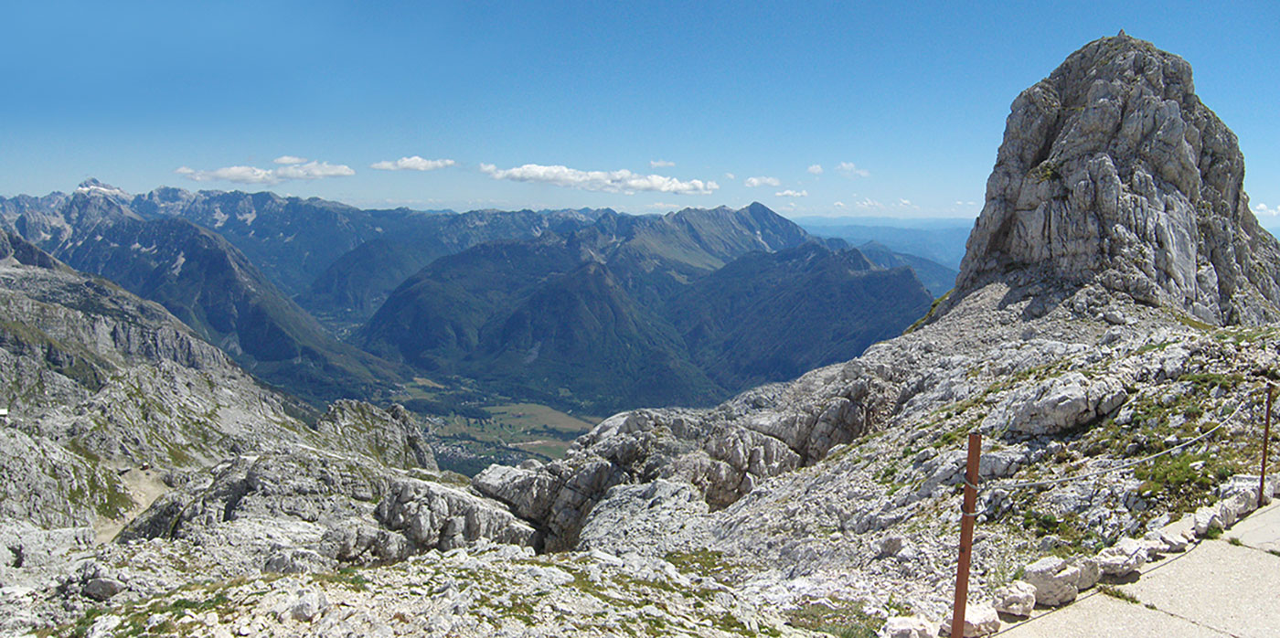 Na polaznu – donju stanicu “A“ kabinske žičare stižemo u 09:00 h. Stanica je od središta grada udaljena oko 1 km. Cijena karte u jednom pravcu za naše pojmove je prilično skupa – za odrasle iznosi 28,00 €. Ali šta da se radi, plaćamo kartu i ukrcavamo se u kabinu žičare. Zauzvrat uštedit ćemo na vremenu za današnji uspon na vrh Visoki Kanin do kojeg je prije izgradnje žičare iz Bovca trebalo oko 8 sati hoda u jednom pravcu. Kabina žičare je zastarjela i tijesna, predviđena je za četiri putnika i volio bih vidjeti kako to izgleda kada svi uđu unutra sa ruksacima i skijama!? Prolazimo kroz dvije izlazne podstanice “B“ i “C“. Po dolasku na gornju – izlaznu stanicu “D“ (2202 m/nv) od dežurnog radnika žičare dobili smo kafu koja je uračunata u cijenu karte. Kafu smo popili na platformi stanice s pogledom na mnoge vrhove Julijskih Alpa od Triglava do Krna.