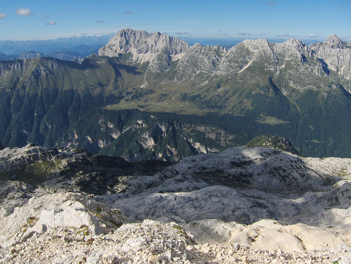 Rombon / Veliki Vrh (2208 m), Velika Črnelska špica / Cima Confine (2334 m), Hudi Vršič / Monte Cergnala (2345 m), Lopa / Monte Leupa (2403 m), Prestreljenik / Monte Forato (2498 m), Hudi Vršič / Monte Lunga (2471 m), Peči / Cima Celso Gilberti (2453 m), Vršič / Monte Ursic (2541 m), Visoki Kanin / Monte Kanin Alto (2587 m), Mali Kanin / Monte Kanin Basso (2577 m), Črni Vogel / Cerni Vogu (2442 m), Vrh Laške Planje / Lasca Plagna (2448 m), Vrh Žlebi / Monte Slebe (2339 m), Velika Baba / Baba grande (2161 m) i dr.