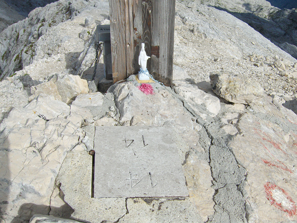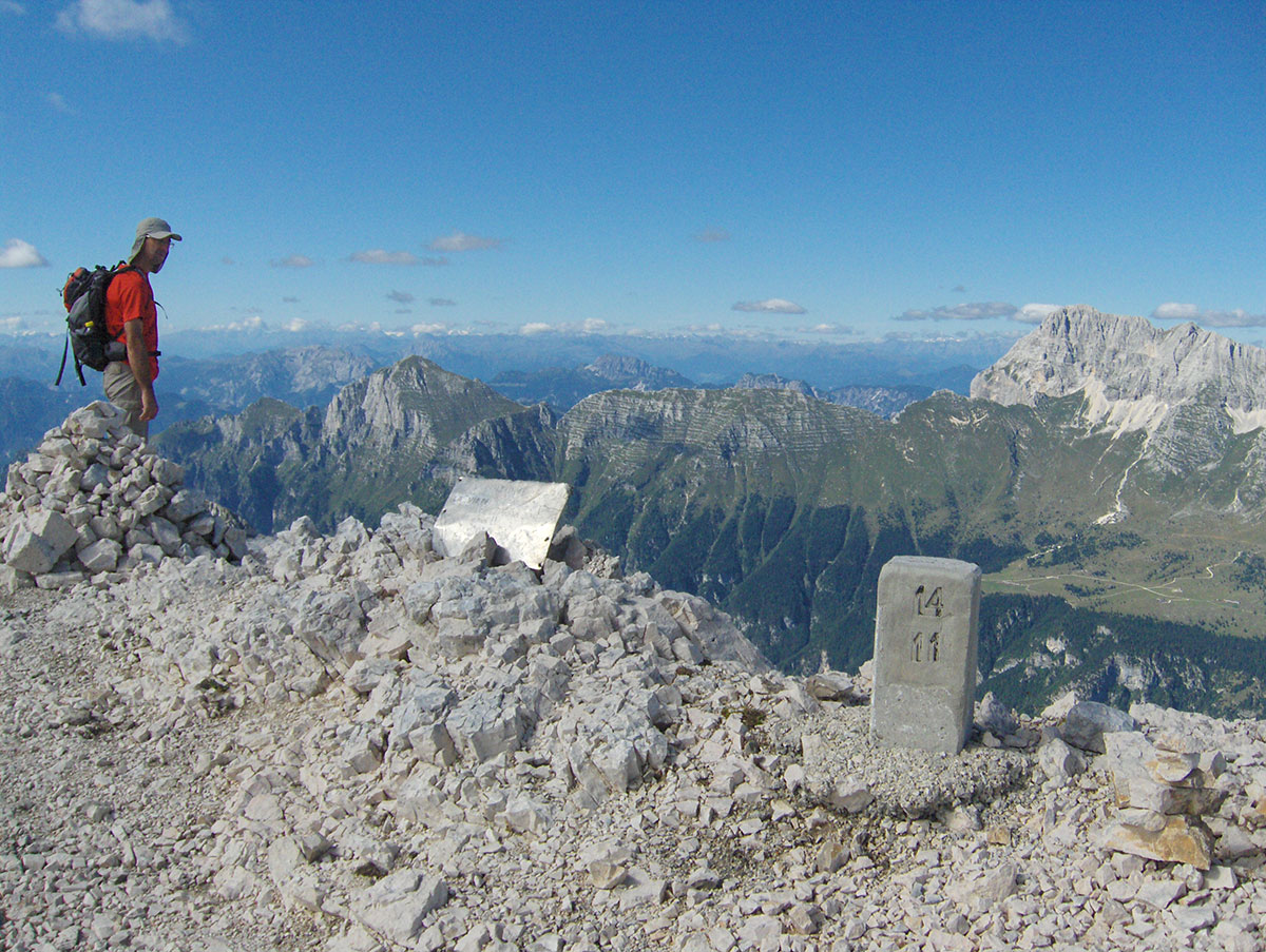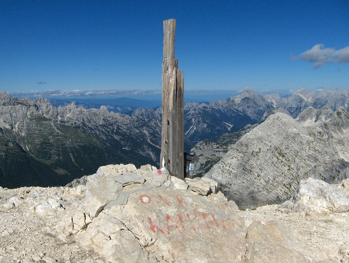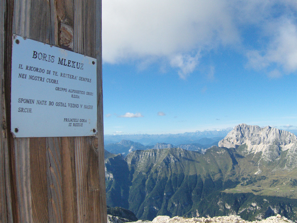 Nastavljamo s usponom po dobro razvedenom grebenu i izlazimo na vrh. Od planinskog doma Petra Skalarja do najvišeg vrha Kaninskih planina pristupili smo za 2½ sata hoda. Na vrhu stoji drvena greda, ostatak nekadašnjeg velikog drvenog križa koji je stradao od udara groma. Na gredi je postavljena spomen ploča Borisu Mlekužu, slovenski alpinist i gorski spasavalac koji je poginuo sa još četvoricom gorskih spasavalaca kod Okrešlja u Turskoj gori (Kamniško-Savinjske Alpe). Nesreća se dogodila na vježbi spašavanja kada se srušio helikopter u kojem su bili (1997. god.). Ploču su postavili njegovi prijatelji – alpinisti iz doline Rezije (italijanski: Val Resia).