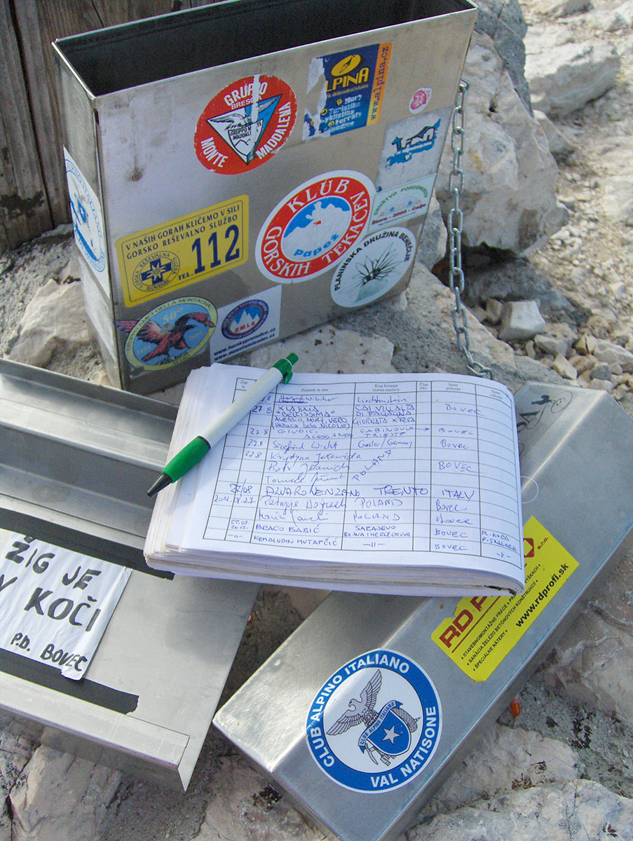 Nakon fotografisanja upisali smo naša imena u knjizi posjetilaca. Žig od vrha nalazi se u planinskom domu Petra Skalarja. Na vrhu smo bili više od jednog sata. Napuštamo vrh i silazimo bez žurbe, ko zna hoćemo li ikada opet doći na Kaninske planine. Divokoze nam opet priređuju svoju igru, kao da znaju da uživamo u njihovim smjelim skokovima po policama strmoglavih litica.