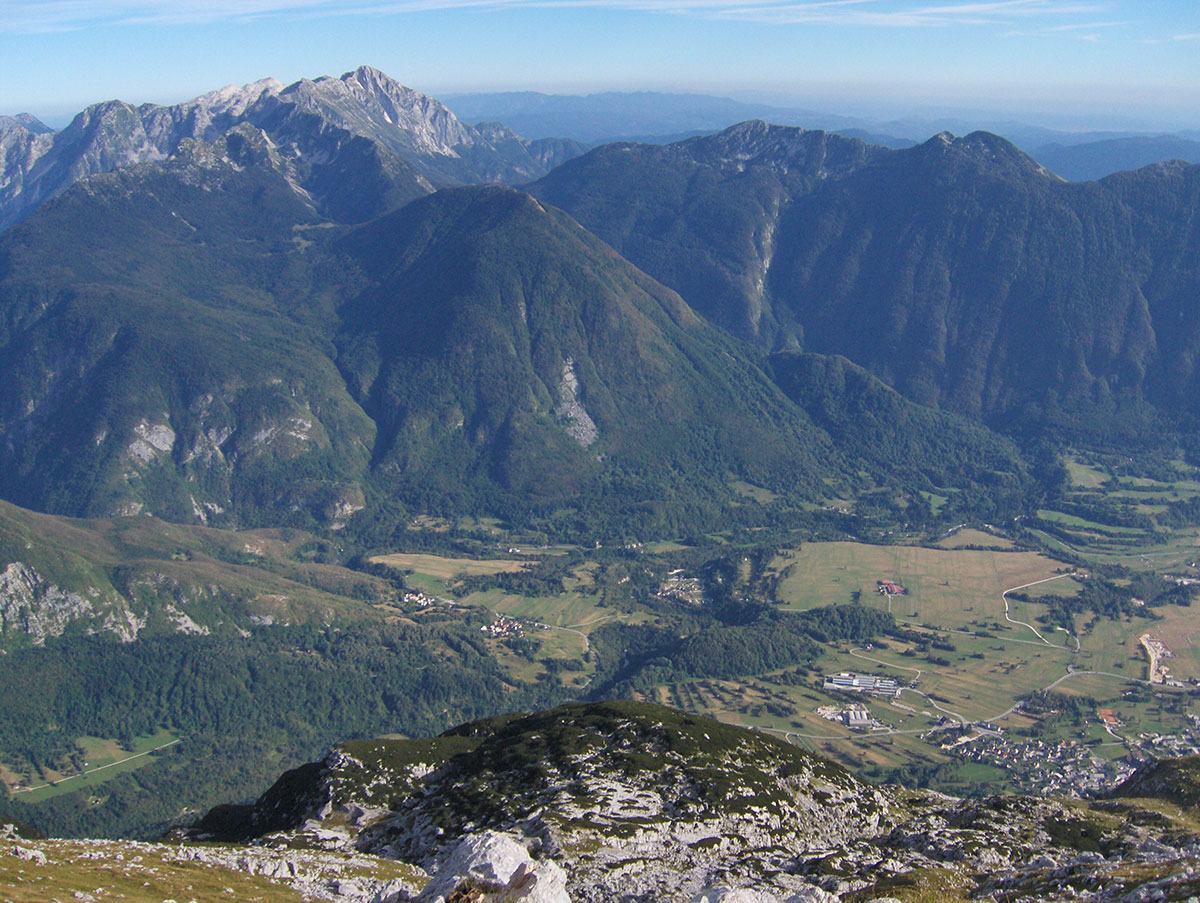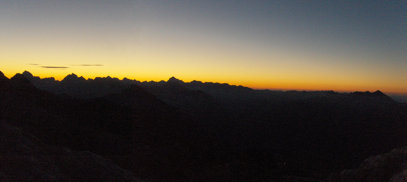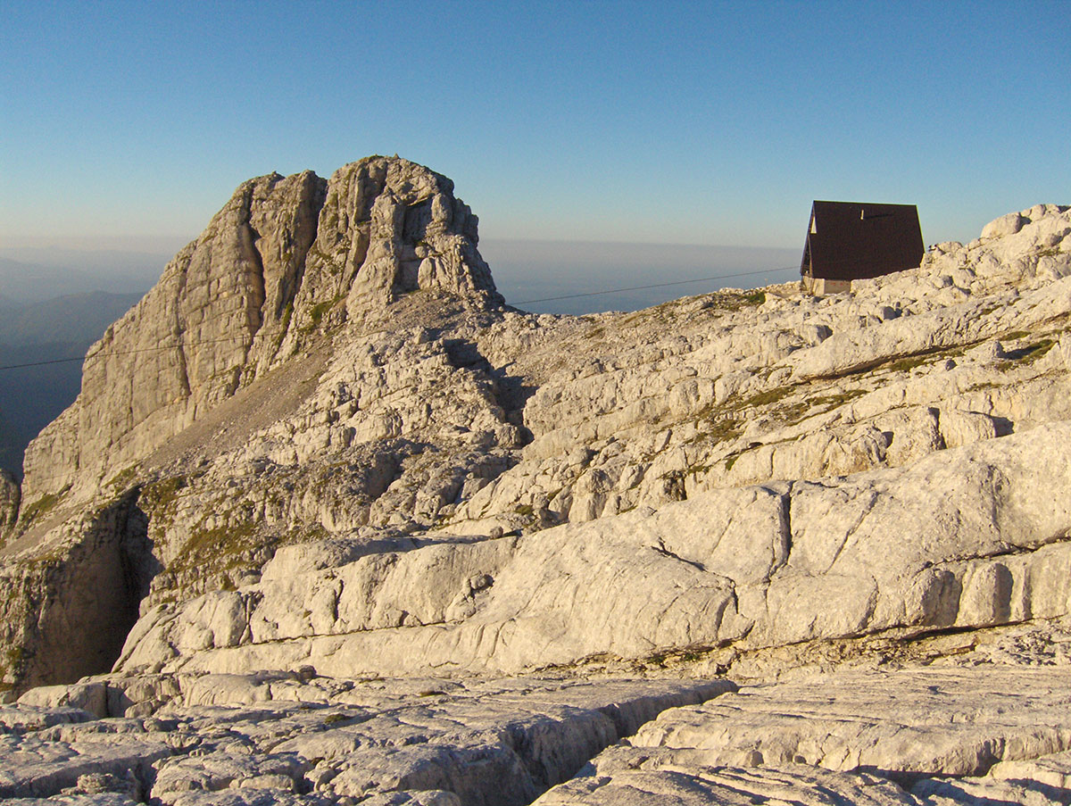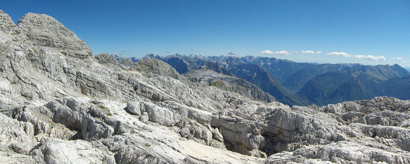 Ustajemo rano ujutro i odlazimo na terasu planinskog doma Petra Skalarja gdje čekamo izlazak sunca. Na istoku nebo polako postaje rumeno. Pogled seže na mnoge vrhove koje prepoznajemo po karakterističnim konturama. Na dalekom horizontu vide se, slijeva nadesno: Mangart, Jalovec, Bavški Grintavec, vrhovi iznad Kriških poda, Triglav, Kanjavec, Lepo Špičje i drugi manji vrhovi u dugom nizu sve do Krnske planine na samom kraju. Ovaj veličanstveni prizor može se doživjeti samo ovdje na Kanininskim planinama. U Julijskim Alpama ovo je jedan od najljepših pogleda. Sunce izranja iza Jalovca i počinje novi dan .