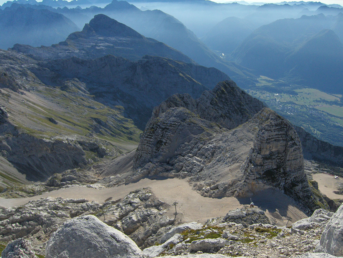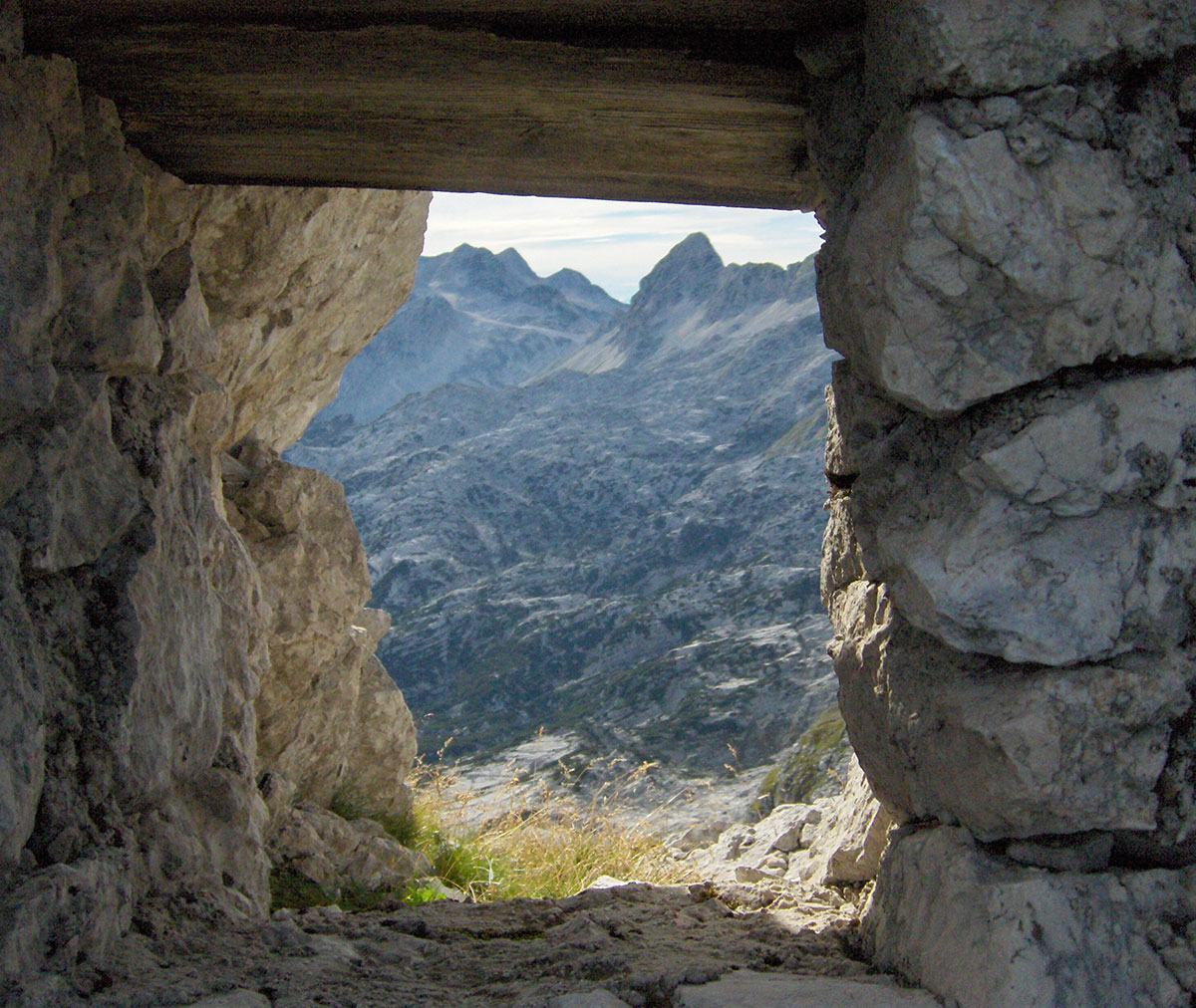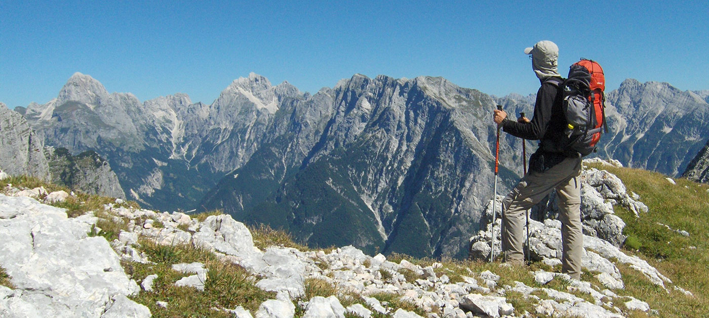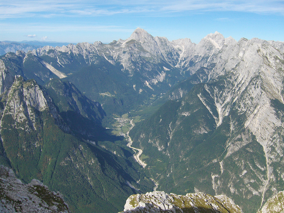 Ustajemo rano ujutro i odlazimo na terasu planinskog doma Petra Skalarja gdje čekamo izlazak sunca. Na istoku nebo polako postaje rumeno. Pogled seže na mnoge vrhove koje prepoznajemo po karakterističnim konturama. Na dalekom horizontu vide se, slijeva nadesno: Mangart, Jalovec, Bavški Grintavec, vrhovi iznad Kriških poda, Triglav, Kanjavec, Lepo Špičje i drugi manji vrhovi u dugom nizu sve do Krnske planine na samom kraju. Ovaj veličanstveni prizor može se doživjeti samo ovdje na Kanininskim planinama. U Julijskim Alpama ovo je jedan od najljepših pogleda. Sunce izranja iza Jalovca i počinje novi dan .