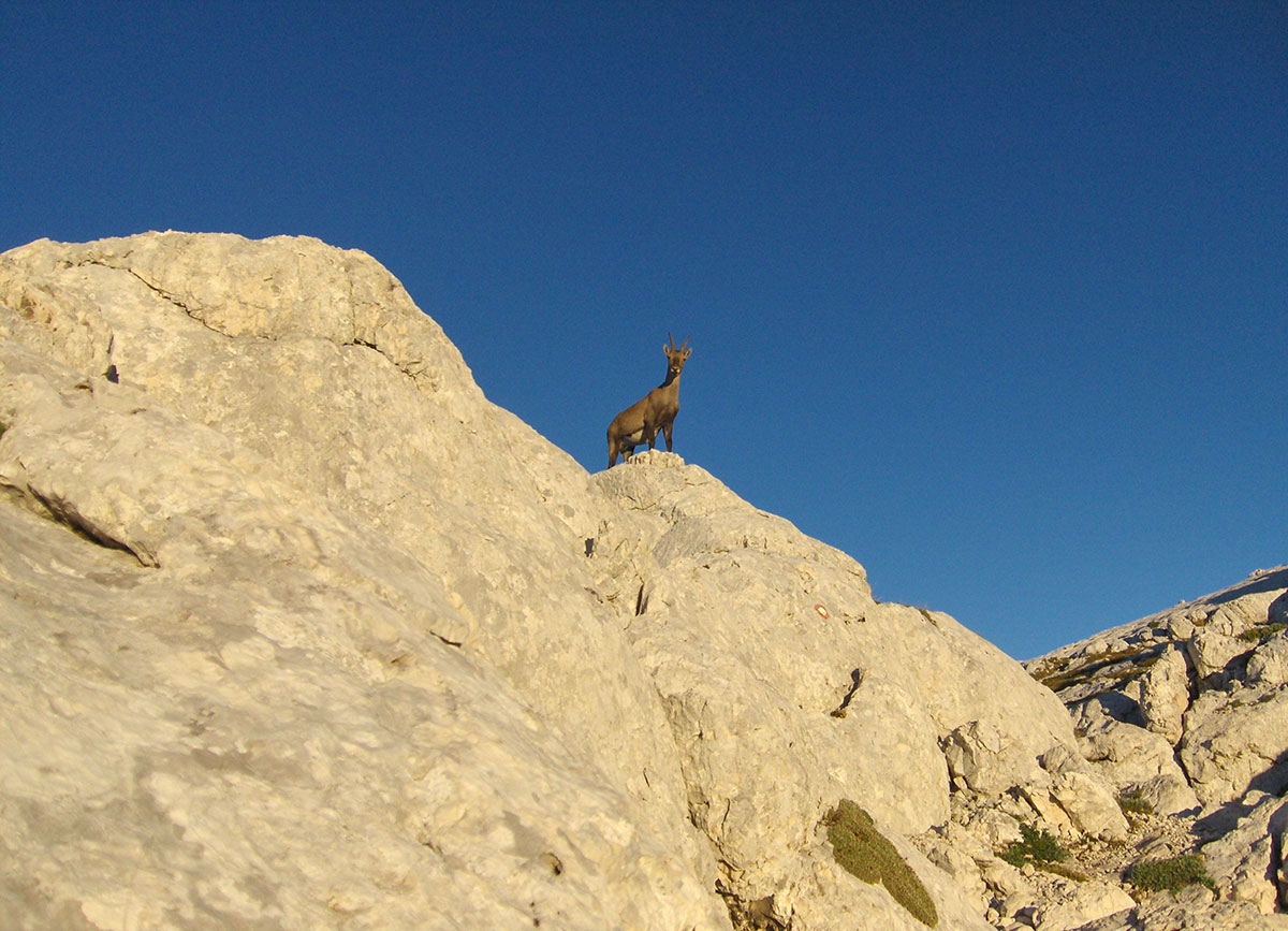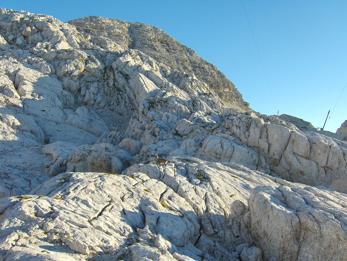 Od planinskog doma krenuli smo planinarskom markiranom stazom prema stanici “D“. Staza prolazi između dubokih ponora i širokih rascjepa u stijeni. Na pojedinim mjestima staza je osigurana sajlom i klinovima. Odjednom ispred nas na stazi pojavile su se dvije divokoze s malim jaretom. Pretpostavljamo da su to one koje smo jučer sreli na Visokom Kaninu. Približavamo im se da ih možemo fotografisati, mužjak ispušta zvižduk i istog trenutka divokoza sa jaretom se sklonila iza jedne povelike stijene. Bilo je ovo upozorenje da smo se previše približili. Ipak smo uspjeli u našoj namjeri, biće to lijepa slika sa Kaninskih planina za uspomenu.