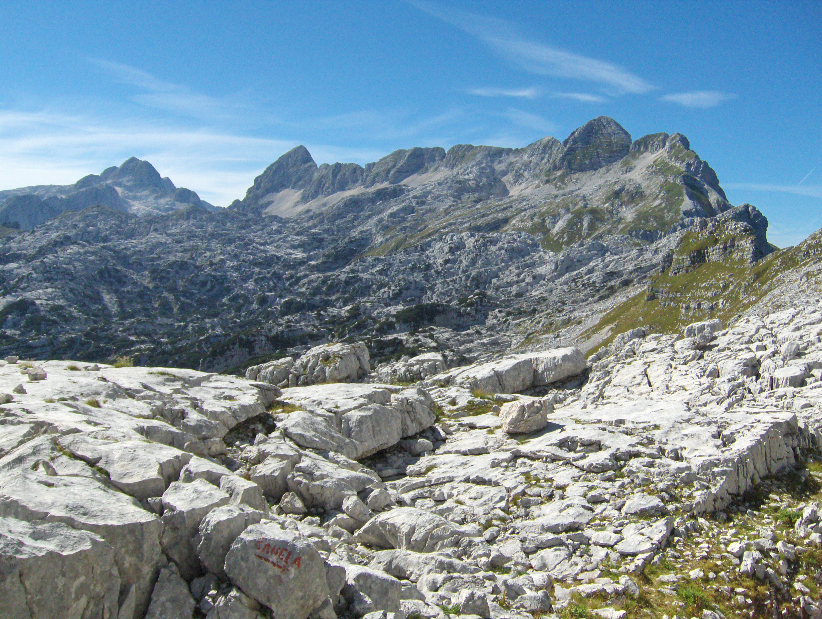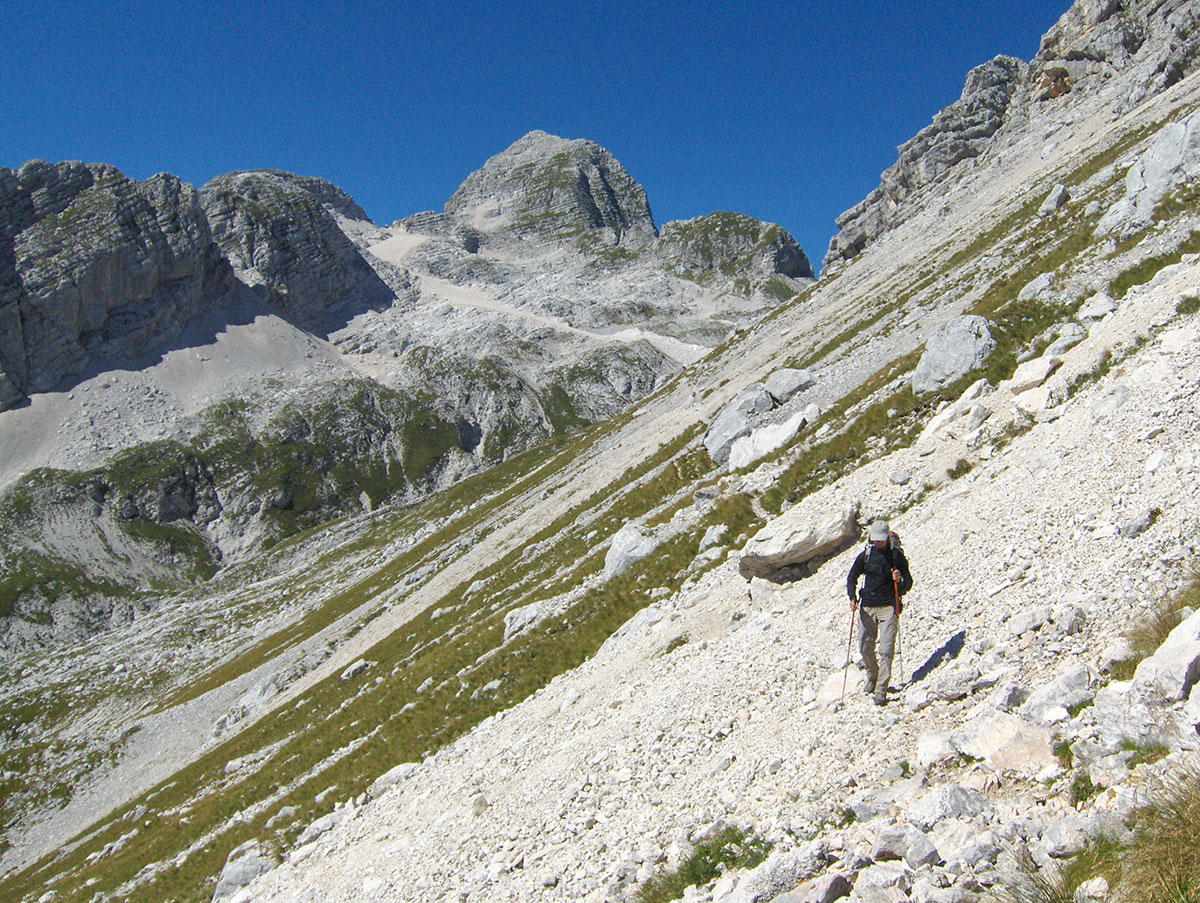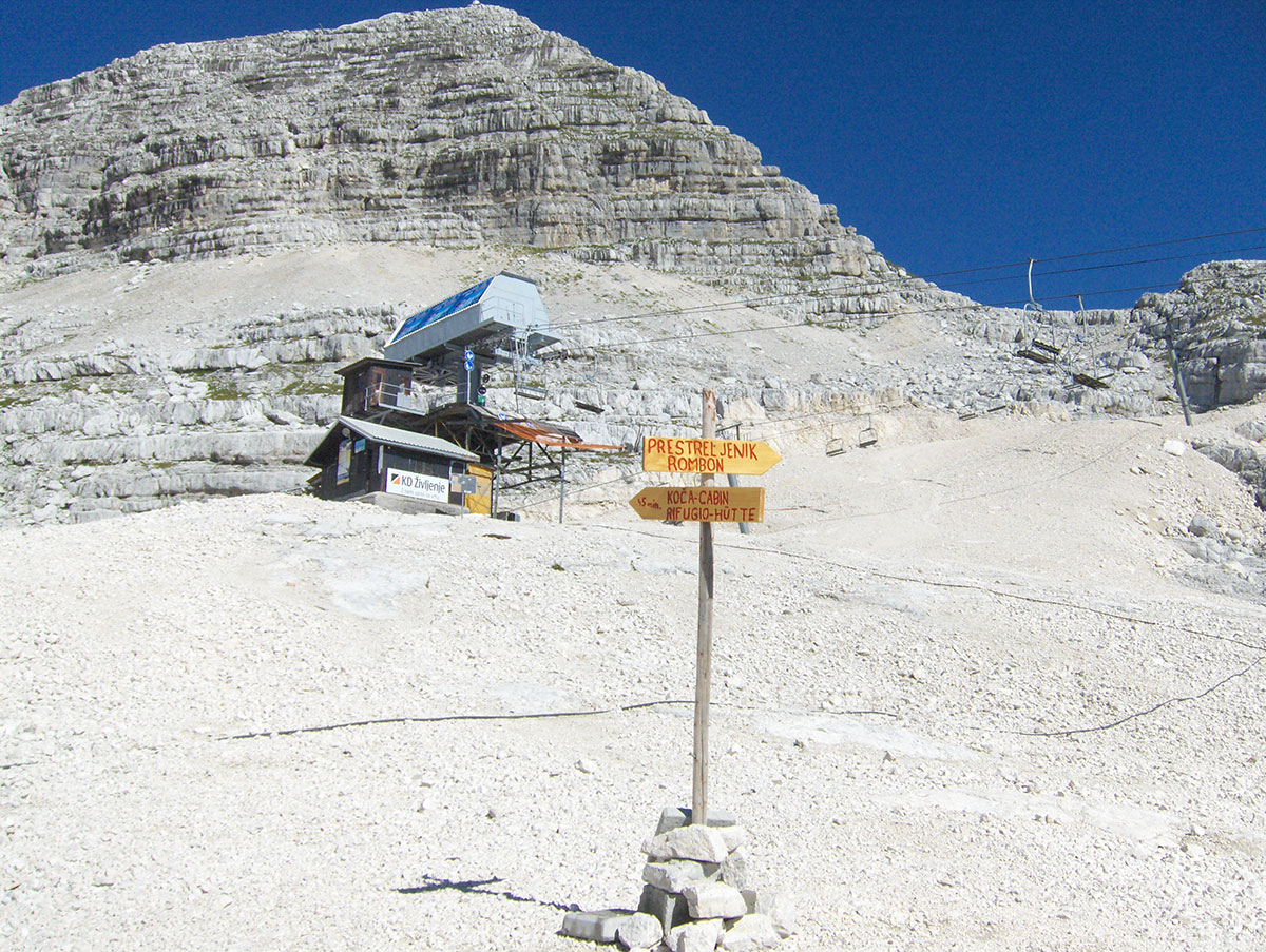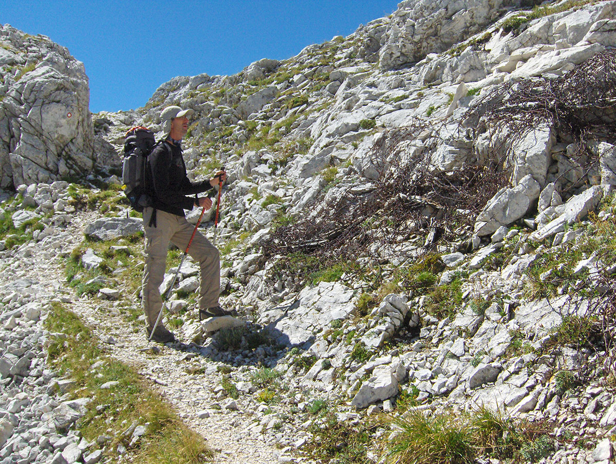 Od sedla priječimo strme padine pod Hudim Vršičem / Monte Cergnala (2334 m) i stižemo na raskrižje sa kojeg se lijevo odvaja staza za Veliku Črnelsku špicu / Cima Confine (2334 m). Sa ovog raskrižja nastavljamo ravno u pravcu Rombona. Krećemo se stazom između brojnih dubokih ponora. Na koju god stranu se okrenemo sve je goli krš i kamenjar. Impresionirani smo velikim prostranstvom koje zauzima ova kamena pustoš.