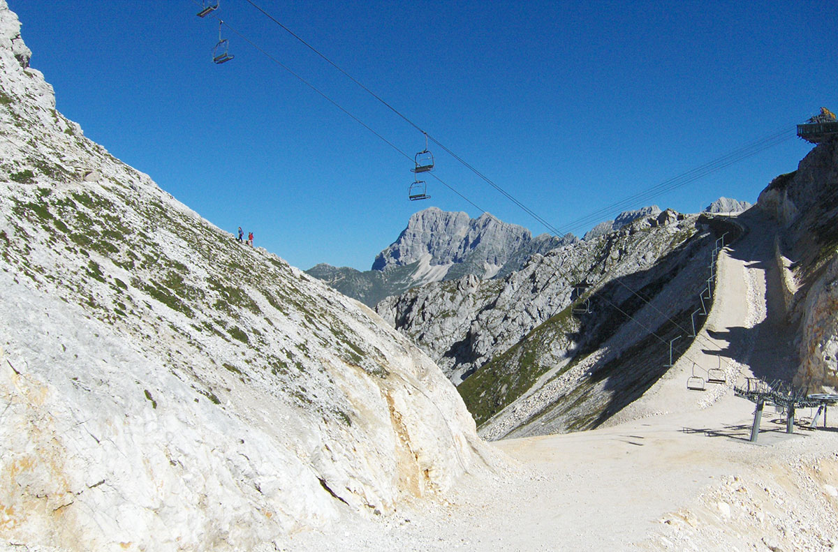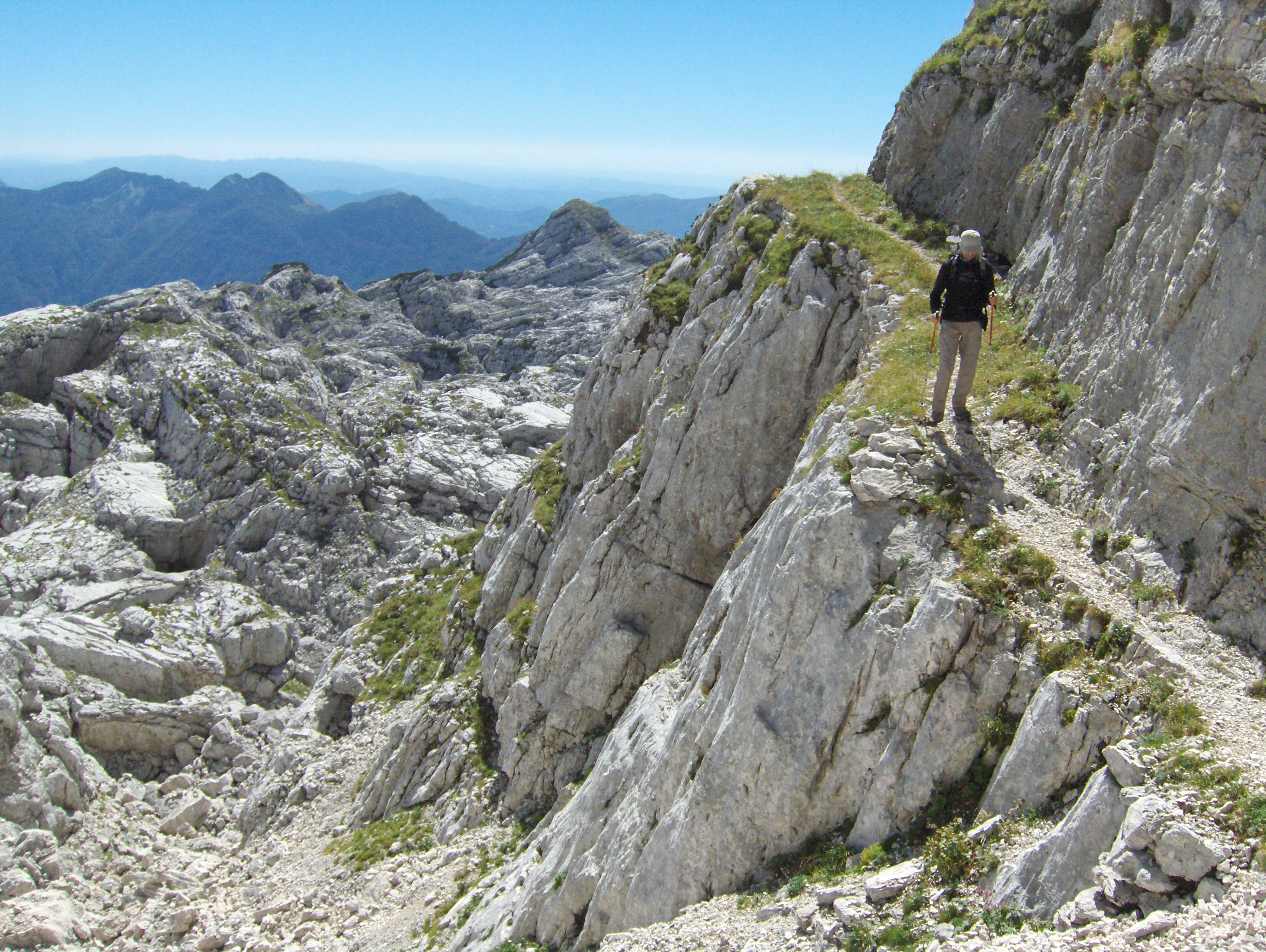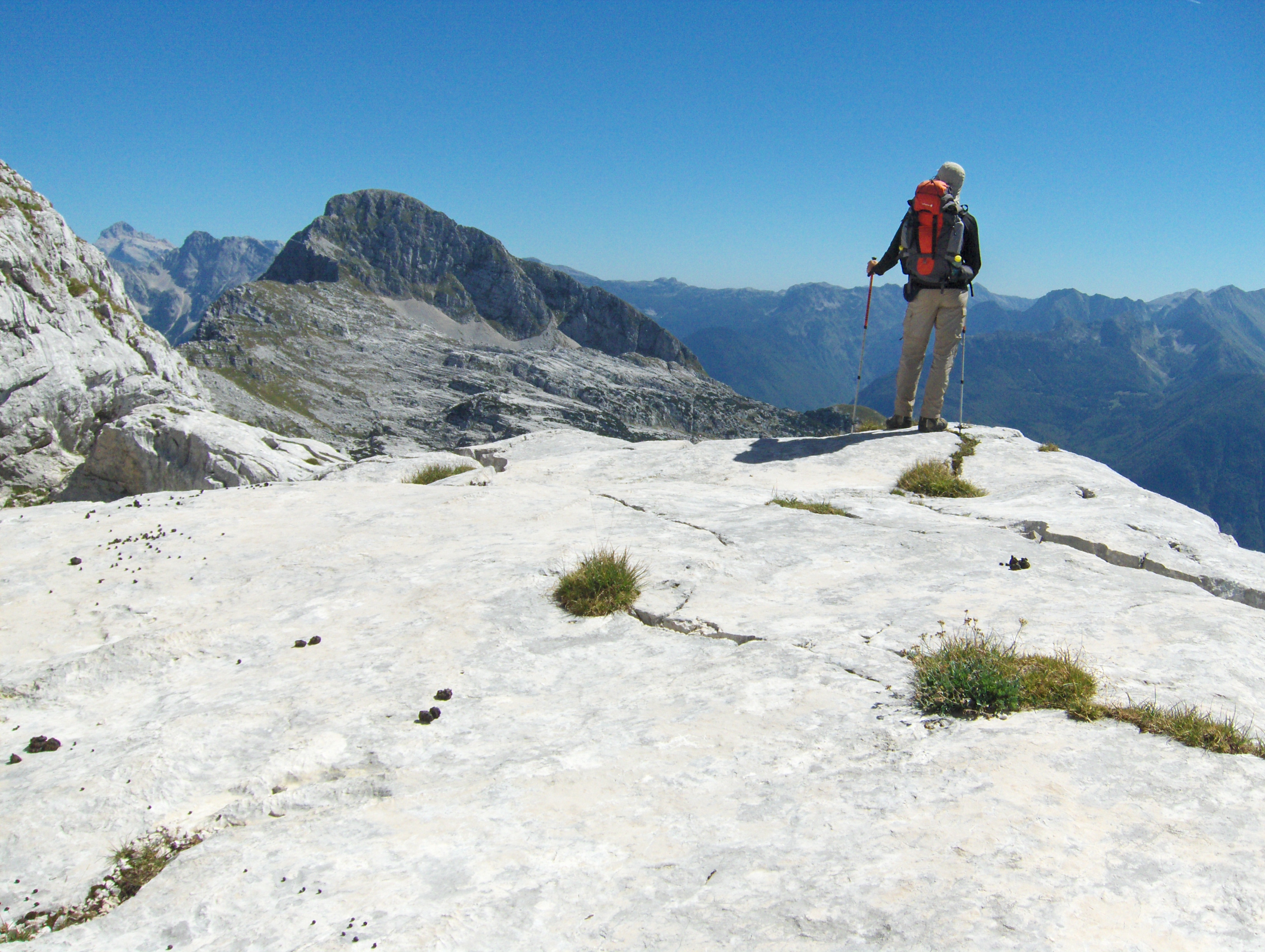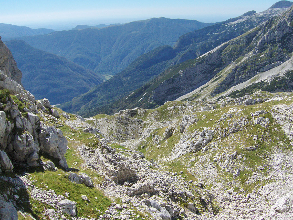 Od sedla priječimo strme padine pod Hudim Vršičem / Monte Cergnala (2334 m) i stižemo na raskrižje sa kojeg se lijevo odvaja staza za Veliku Črnelsku špicu / Cima Confine (2334 m). Sa ovog raskrižja nastavljamo ravno u pravcu Rombona. Krećemo se stazom između brojnih dubokih ponora. Na koju god stranu se okrenemo sve je goli krš i kamenjar. Impresionirani smo velikim prostranstvom koje zauzima ova kamena pustoš.
