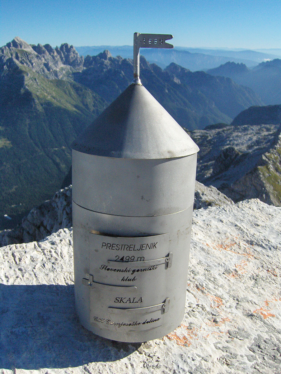 Iz kutije vadimo knjigu posjetilaca i upisujemo svoja imena. Danas na vrhu nije bilo drugih posjetilaca osim nas dvojice a jučer je bilo troje Čeha. Na vrhu ne možemo odmarati jer su ga divojarci i divokoze uneredili izmetom, ni ruksak se ne može spustiti na travu.
