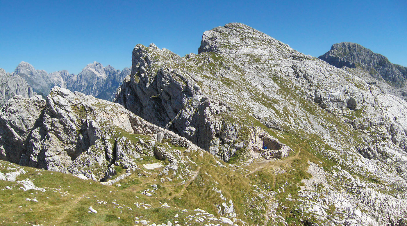 Na nekoliko mjesta staza se obara pa ponovo uzdiže i tako sve do sedla Pri Banderi (2051 m/nv). Na ovom sedlu je italijanska vojska izgradila niz fortifikacijskih objekata u sklopu Sočanskog fronta. Objekti su u ruševnom stanju. Zidani su od kamena na vještački zaravnatim platoima u stjenovitom grebenu dobro skriveni od očiju austrougarskih vojnika koji su držali položaje na Rombonu. Svi objekti su bili povezani stazama i stepenicama uklesanim u živu stijenu. Nevjerojatno da se i nakon tolikih godina od završetka Prvog svjetskog ovdje mogu vidjeti prepreke od bodljikave žice. Na sedlu pravimo kraću pauzu za odmor i osvježenje.